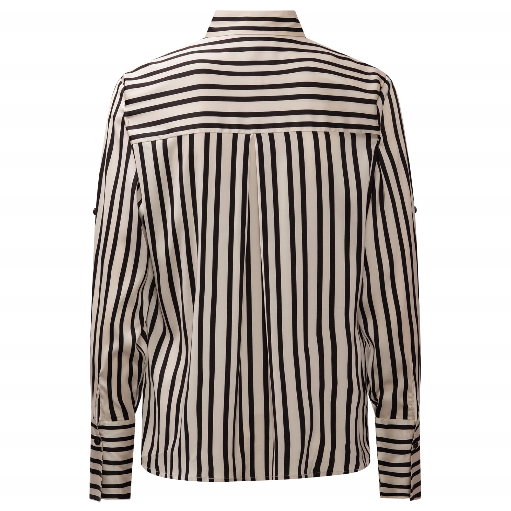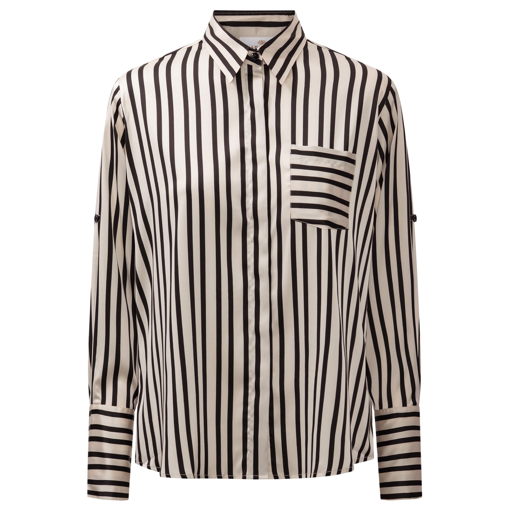 Mason skjorten er en elegante skjorte er designet i et stilrent sort- og offwhite stribet mønster, der giver et moderne og sofistikeret udtryk. De lodrette striber på kroppen skaber en flatterende silhuet, mens den kontrasterende brystlomme og manchetter med vandrette striber tilfører et eksklusivt og grafisk twist. Skjorten har klassisk krave, gennemknapning og lange ærmer med brede manchetter. Det lette, glansfulde materiale falder smukt og gør skjorten behagelig at have på – perfekt både til kontoret og mere formelle anledninger, men kan også styles afslappet med jeans.