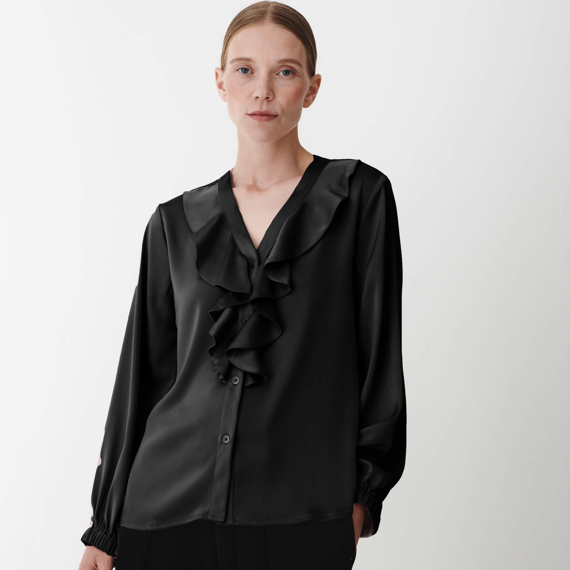 Den smukke Sophia bluse er en feminin bluse med en elegant V-udskæring prydet med fine flæsedetaljer, der tilfører et romantisk udtryk. Blusen er designet med lange ærmer og elastiske manchetter, som skaber en let volumen i ærmet og giver en behagelig pasform. Den tidløse silhuet gør blusen perfekt både til hverdagsbrug og mere festlige anledninger, hvor du ønsker et sofistikeret og stilfuldt look.