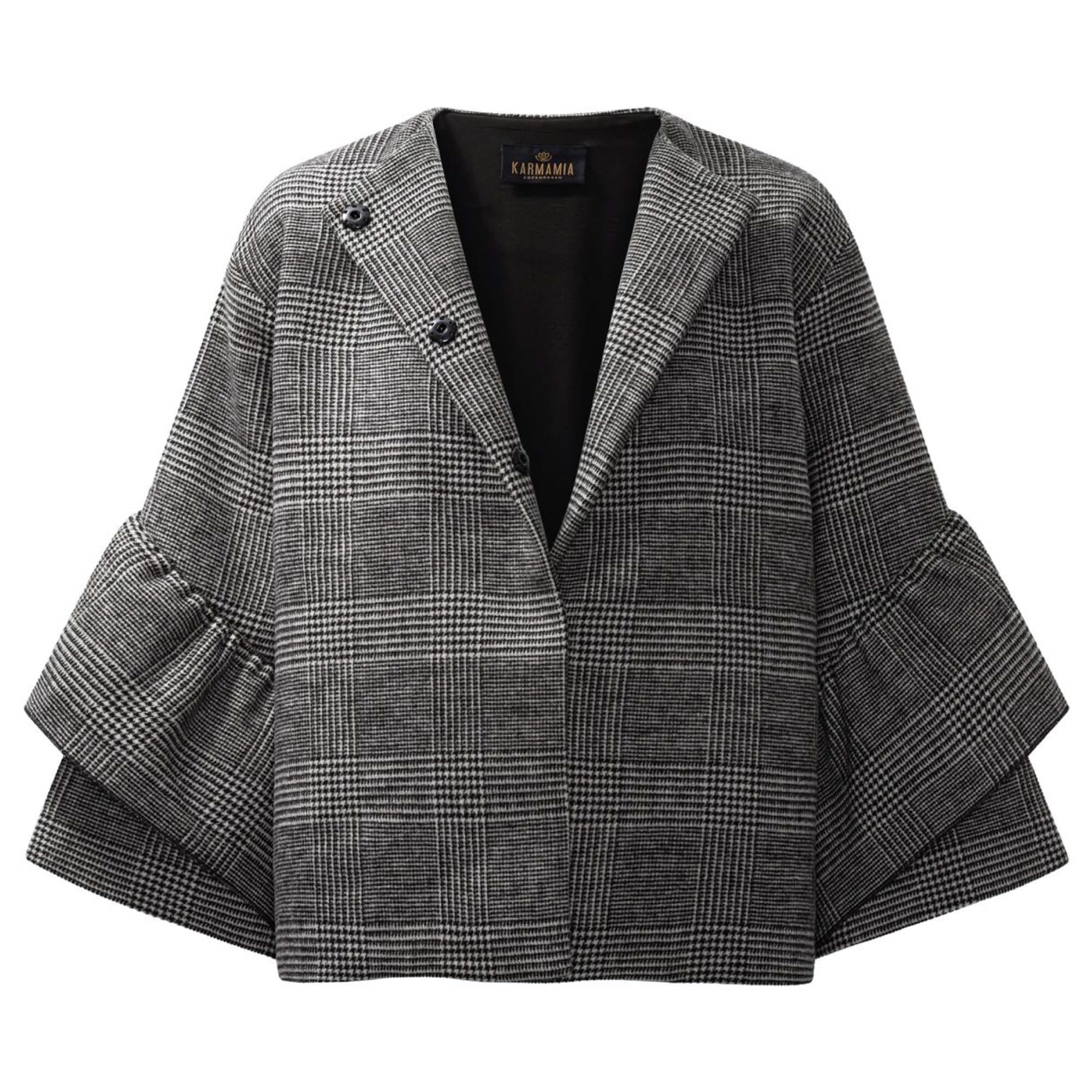 Spencer No. 103 Jacket fra Karmamia en ny udgave af den populære Kennedy Jacket i en flot og feminin kortere version. Jakken er designet med i en flot væv uldkvalitet med de skønneste flæser på begge ærmer. Den er afsluttet med rundet halsudskæring og gennemgående trykknaplukning. Brug den som et ydre lag på milde efterårsdage eller ud over en kjole til en festlig lejlighed.