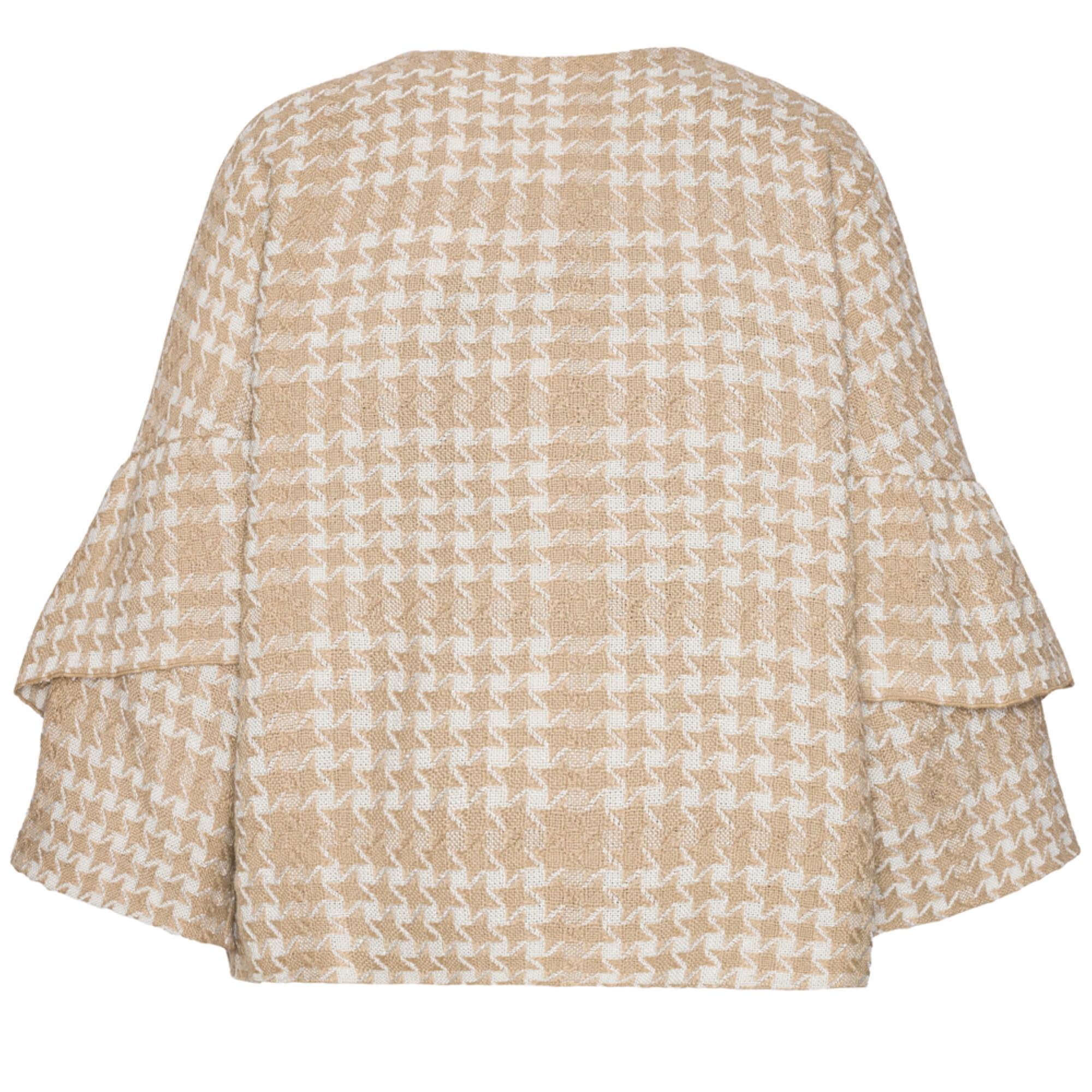 Spencer Jacket No. 15 fra Karmamia en kortere udgave af den populære Kennedy Jacket  i en skøn brun og hvid kombination med blomster printet foer. Jakken er designet med i en flot vævet uld kvalitet med de skønneste flæser på begge ærmer. Den er afsluttet med rundet halsudskæring og gennemgående trykknaplukning. Brug den som et ydre lag på milde efterårsdage eller ud over en kjole til en festlig lejlighed.