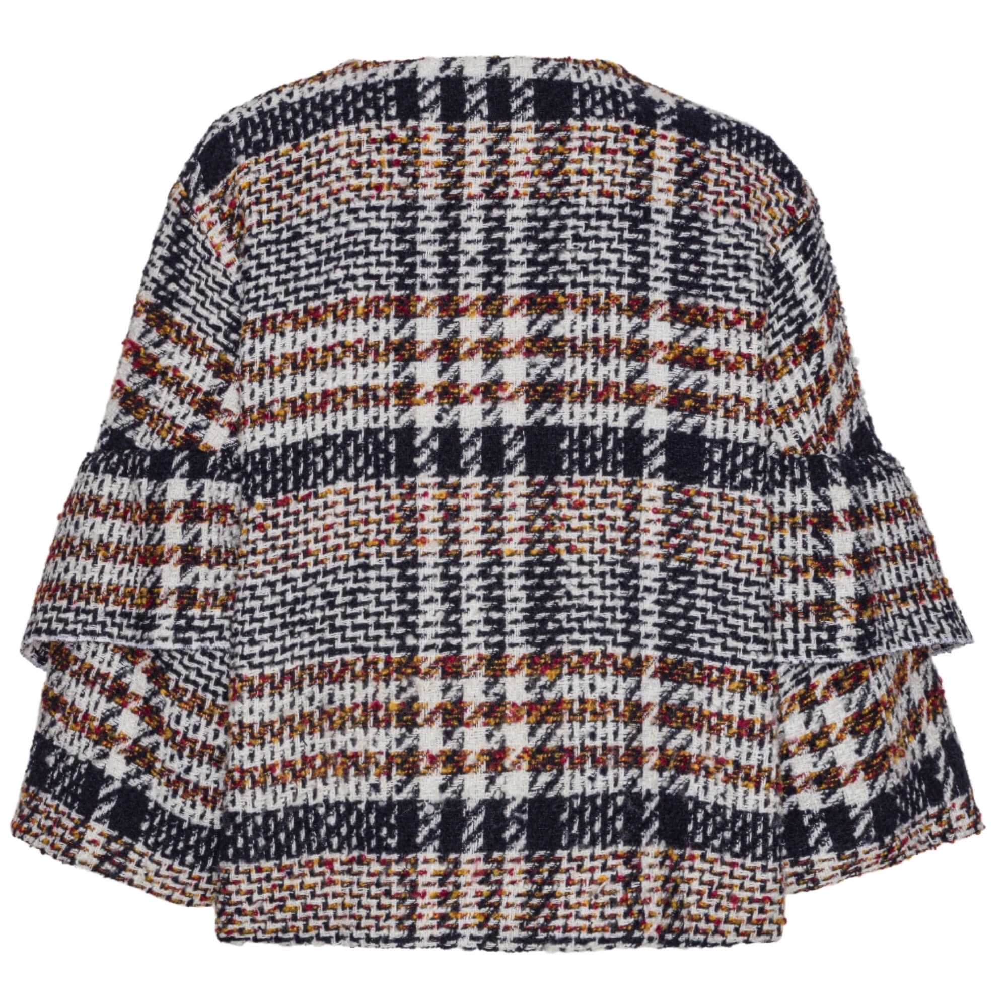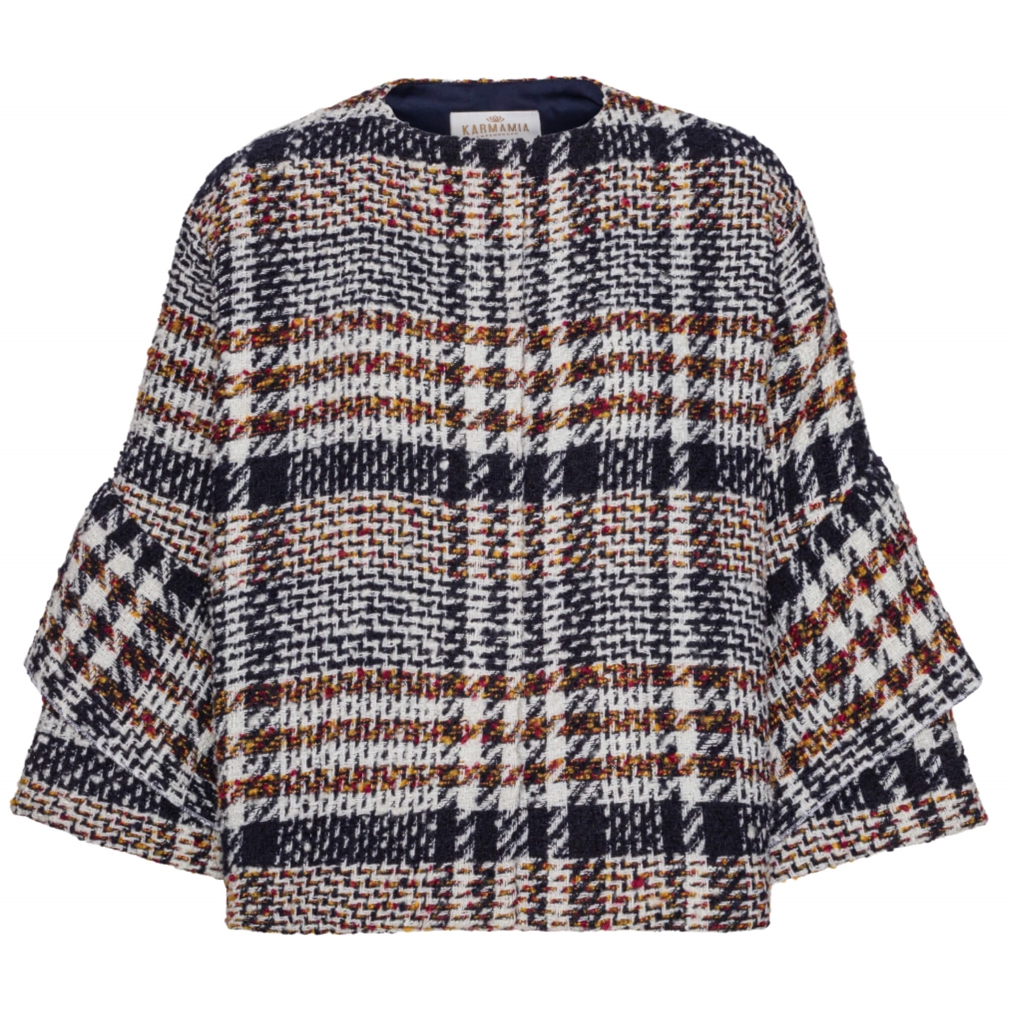 Spencer No. 6 Jacket fra Karmamia en ny udgave af den populære Kennedy Jacket i en flot og feminin kortere version. Jakken er designet med i en flot væv uldkvalitet med de skønneste flæser på begge ærmer. Den er afsluttet med rundet halsudskæring og gennemgående trykknaplukning. Brug den som et ydre lag på milde efterårsdage eller ud over en kjole til en festlig lejlighed.