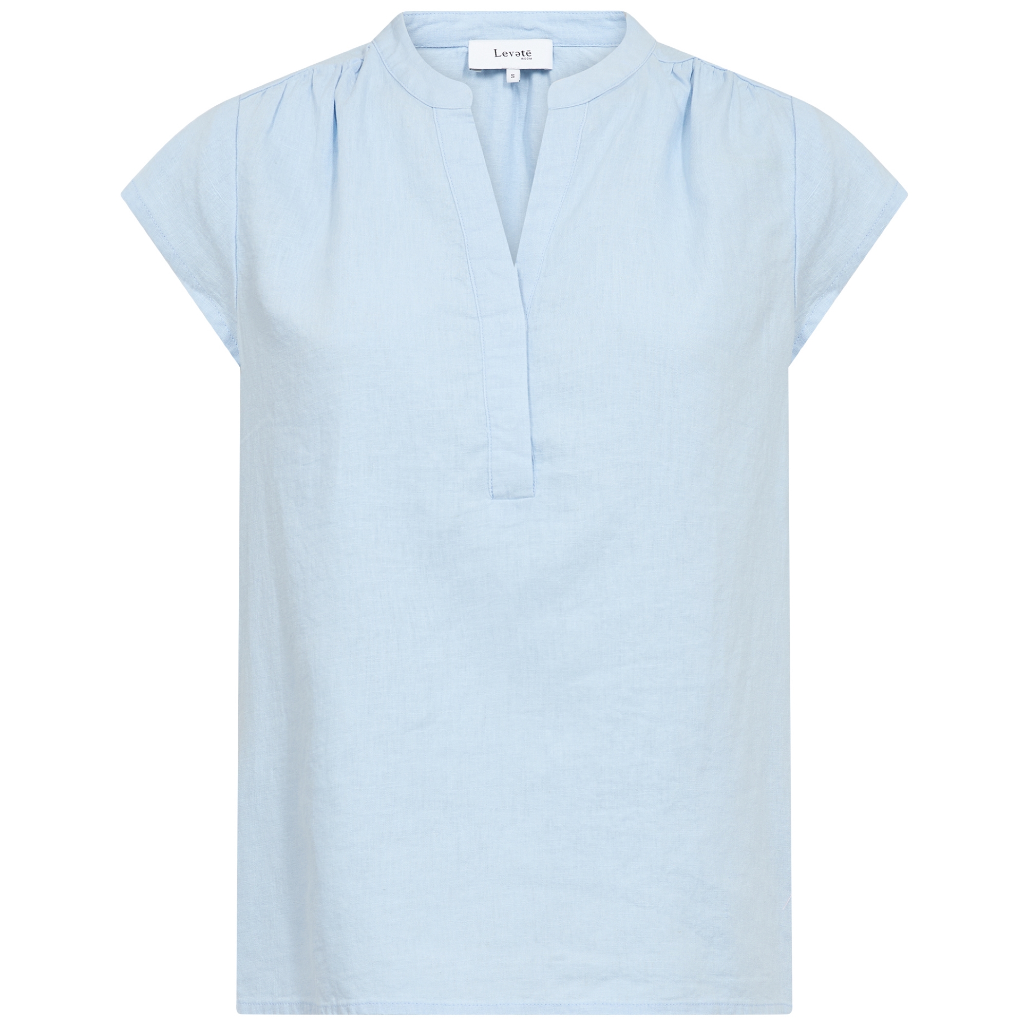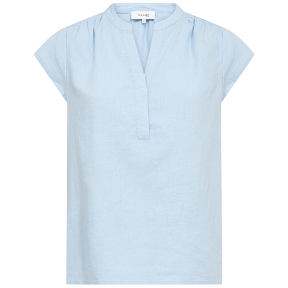 LR-NAJA 19 fra Levete Room i en skøn lyseblå farve er en sofistikeret bluse fremstillet af en åndbar hørblanding. Blusen har V-udskæring, rynkede skuldersømme og en lige kant, hvilket skaber en afslappet og elegant pasform. Den lyseblå nuance giver et stilfuldt  udtryk, der nemt kan styles med de matchende shorts eller bukser for et afslappet look, eller en nederdel for et finere elegant look.
