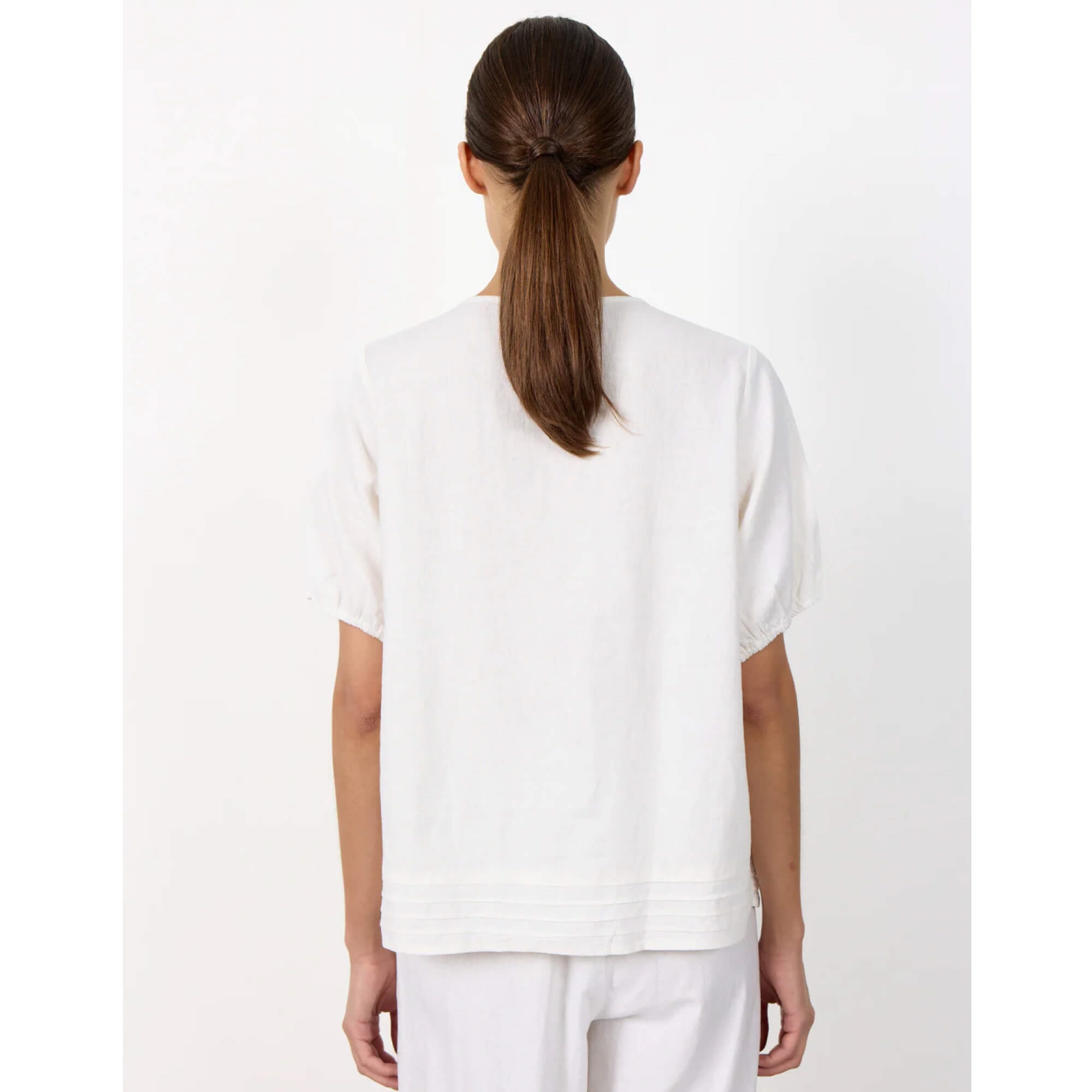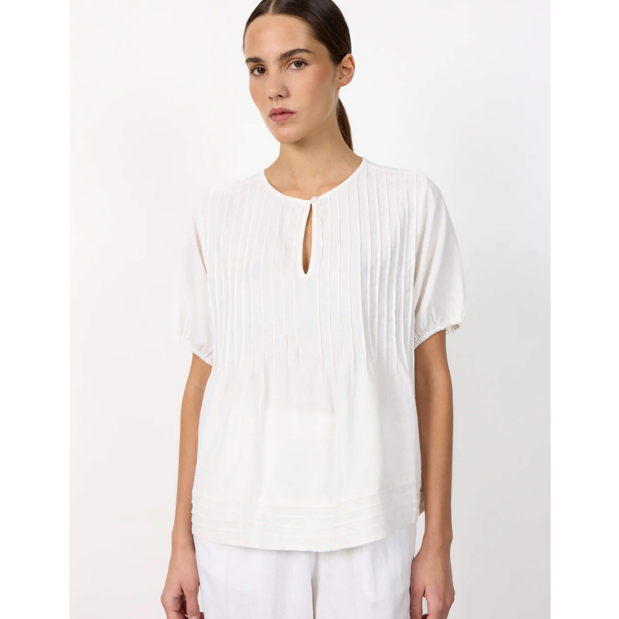 LR-NAJA 54 er en let og stilfuld hvid bluse i en eksklusiv blanding af 55% hør og 45% viskose, som giver en åndbar og behagelig kvalitet. Den har rund hals med elegant nøglehulsdetalje og fine knapper samt korte ærmer og et diskret strukturmønster, der giver et feminint og sofistikeret udtryk. Perfekt til både hverdag og pænere anledninger.
