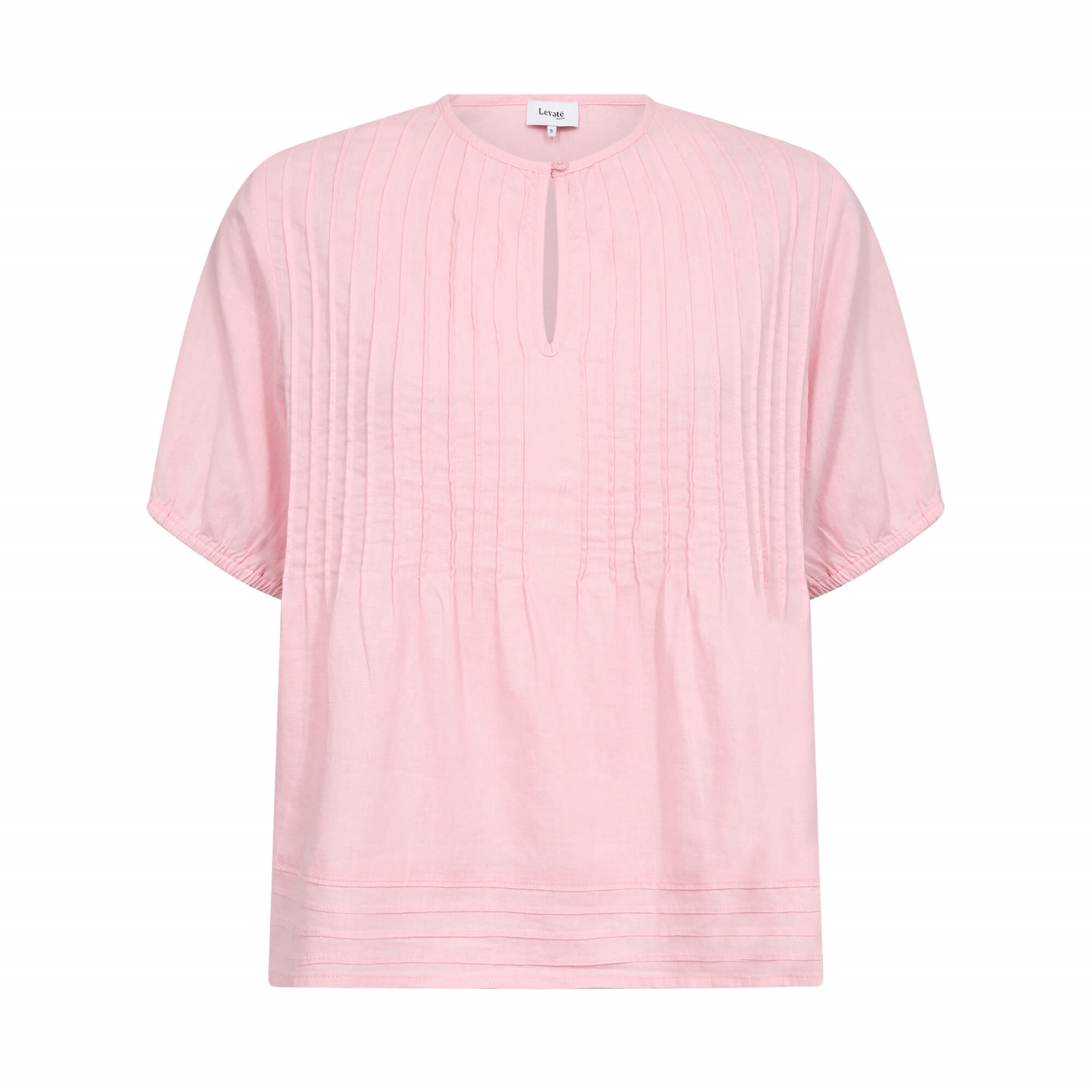 LR-NAJA 54 i blid lyserød er en elegant bluse med rund halsudskæring og nøglehulsdetalje med små knapper. Blusen har korte ærmer og et diskret strukturmønster, der tilføjer tekstur og raffinement. Perfekt at kombinere med skræddersyede bukser eller en elegant nederdel for et sofistikeret look.