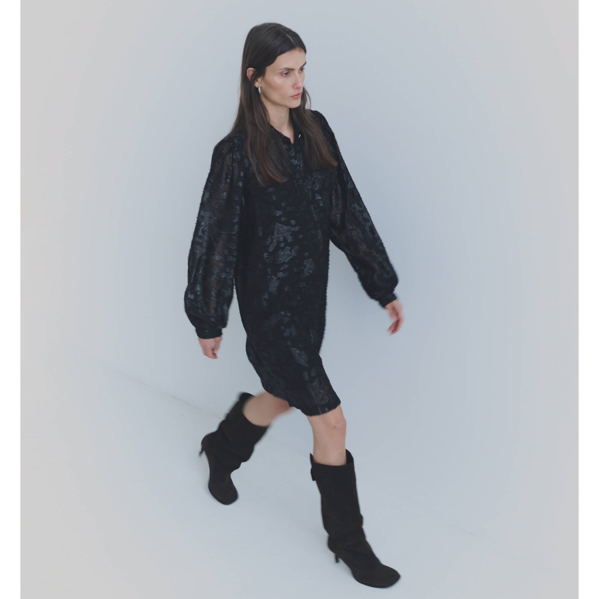 LR-ORION 1 kjole er designet af 100% polyester. Denne elegante kjole har en klassisk krave, lange ærmer, knaplukning og et smukt tekstureret print. Sæt den sammen med høje hæle til en formel sammenkomst eller støvler til en mere afslappet udflugt.