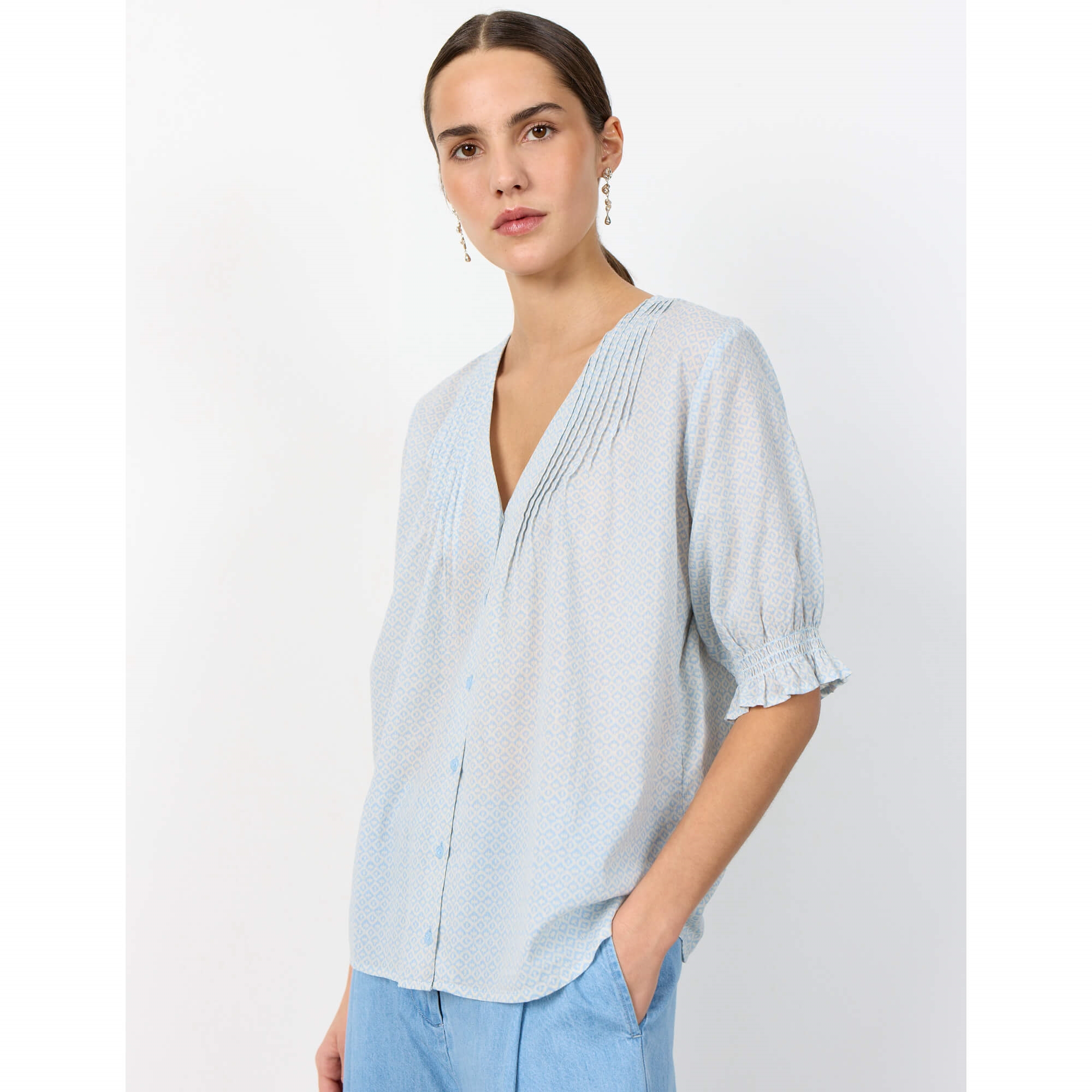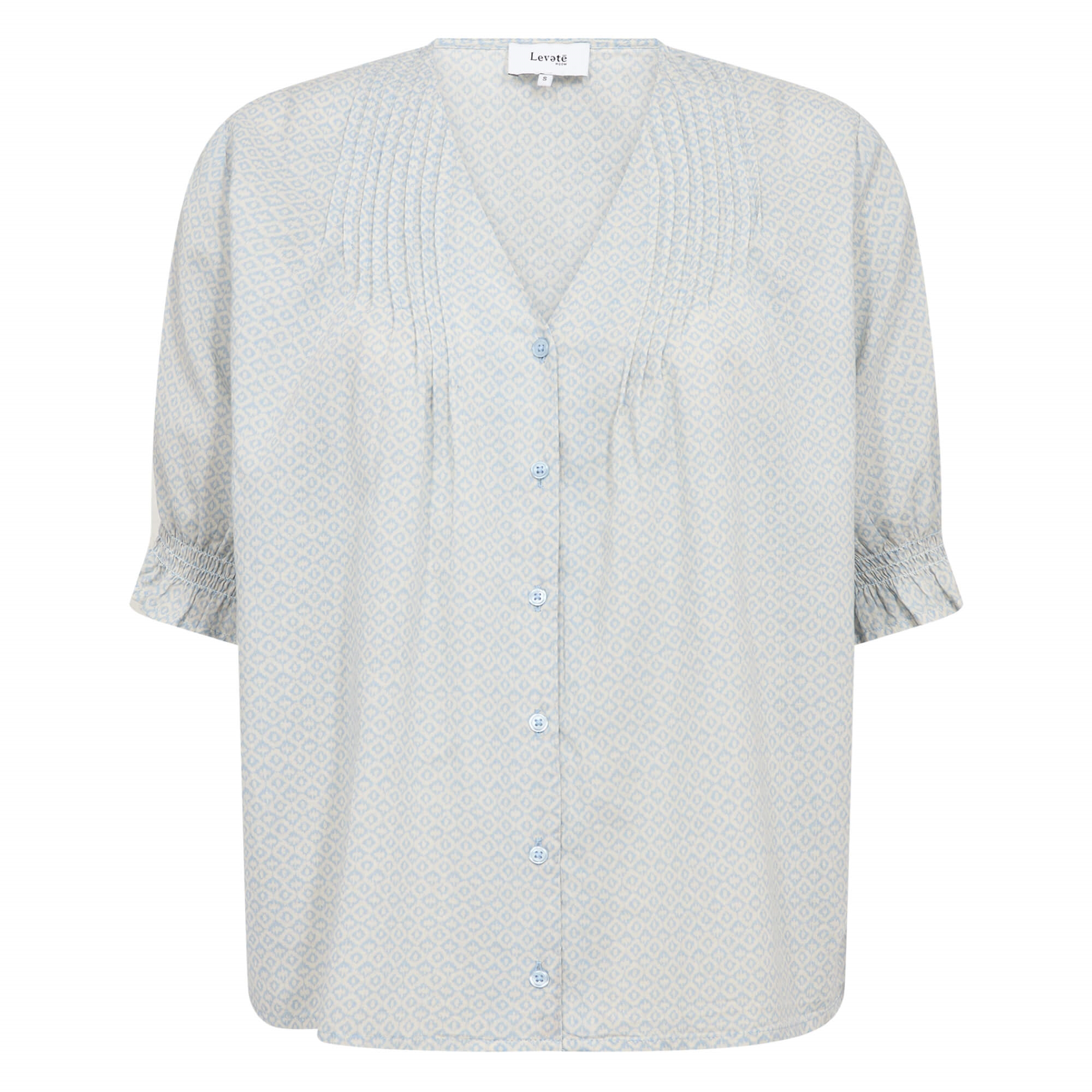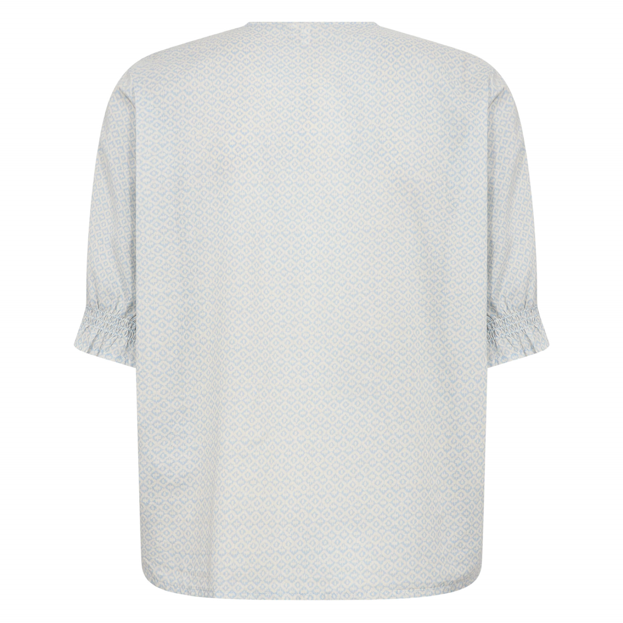 LR-PALMA 2 er en feminin bluse fremstillet af 100 % økologisk bomuld. Den har en elegant V-udskæring, korte ærmer, knaplukning foran og et all-over geometrisk print. Sæt den sammen med skræddersyede bukser eller denim for et chikt look.
