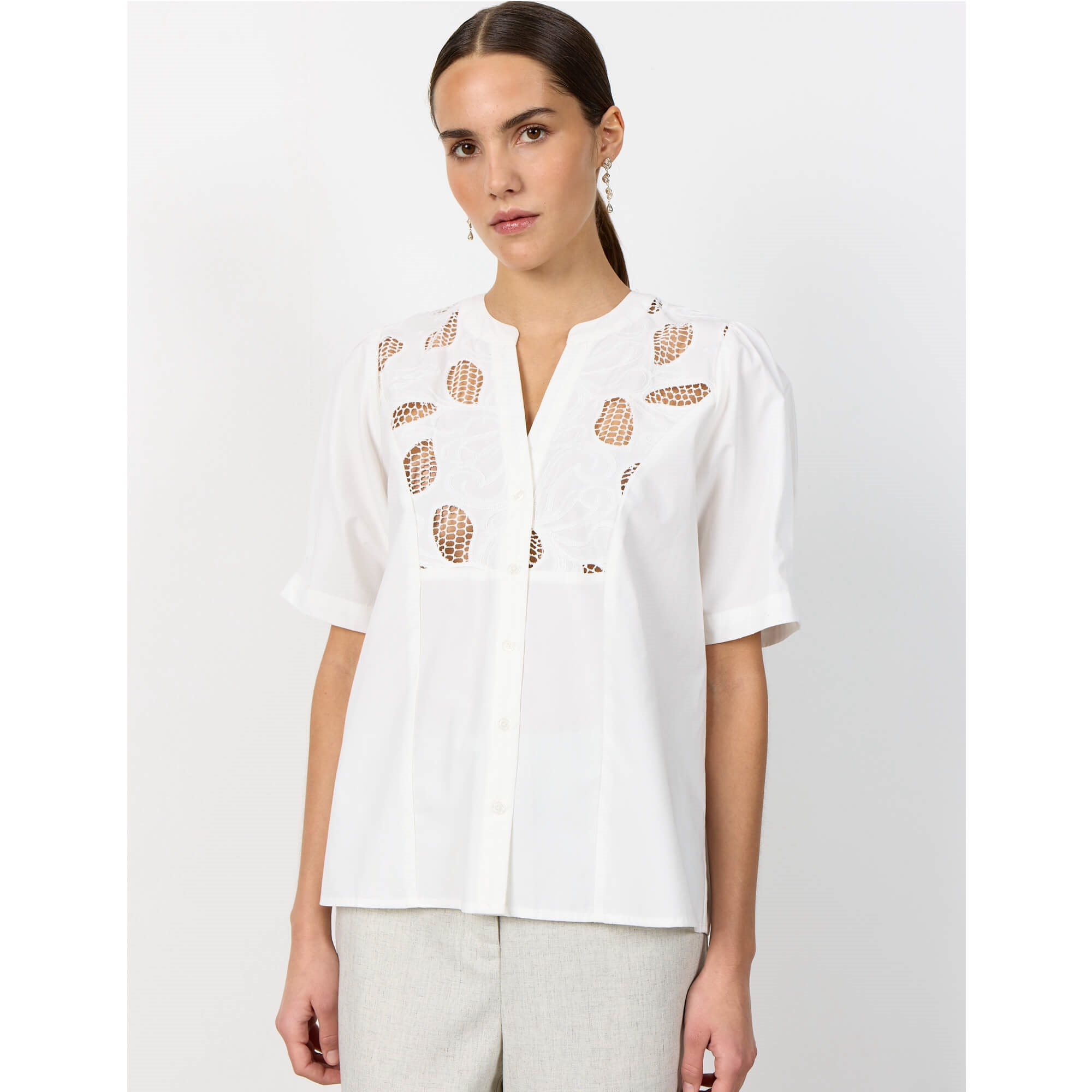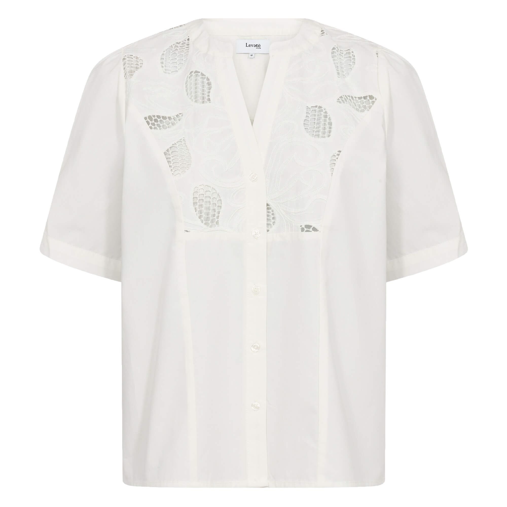 LR-PARKER 1 er en smuk bluse med en sammensætning af 50% bomuld, 50% tencel. Denne elegante bluse har indviklede blondedetaljer på skuldrene, V-udskæring, korte ærmer og en knaplukning foran. Sæt den sammen med skræddersyede bukser eller en klassisk nederdel for et raffineret look.