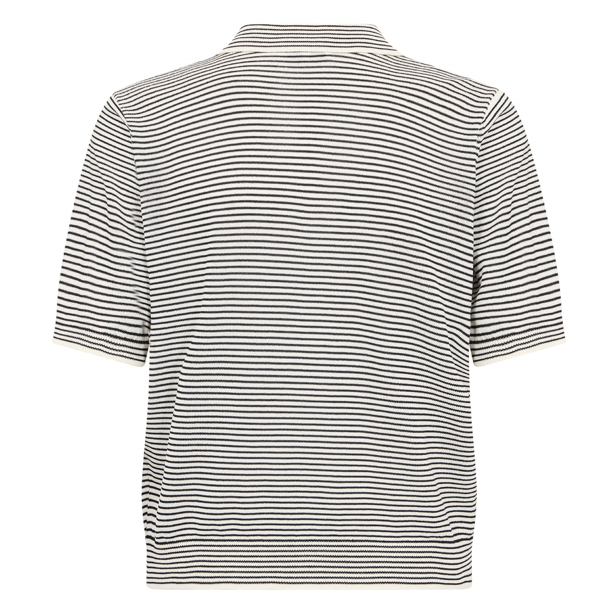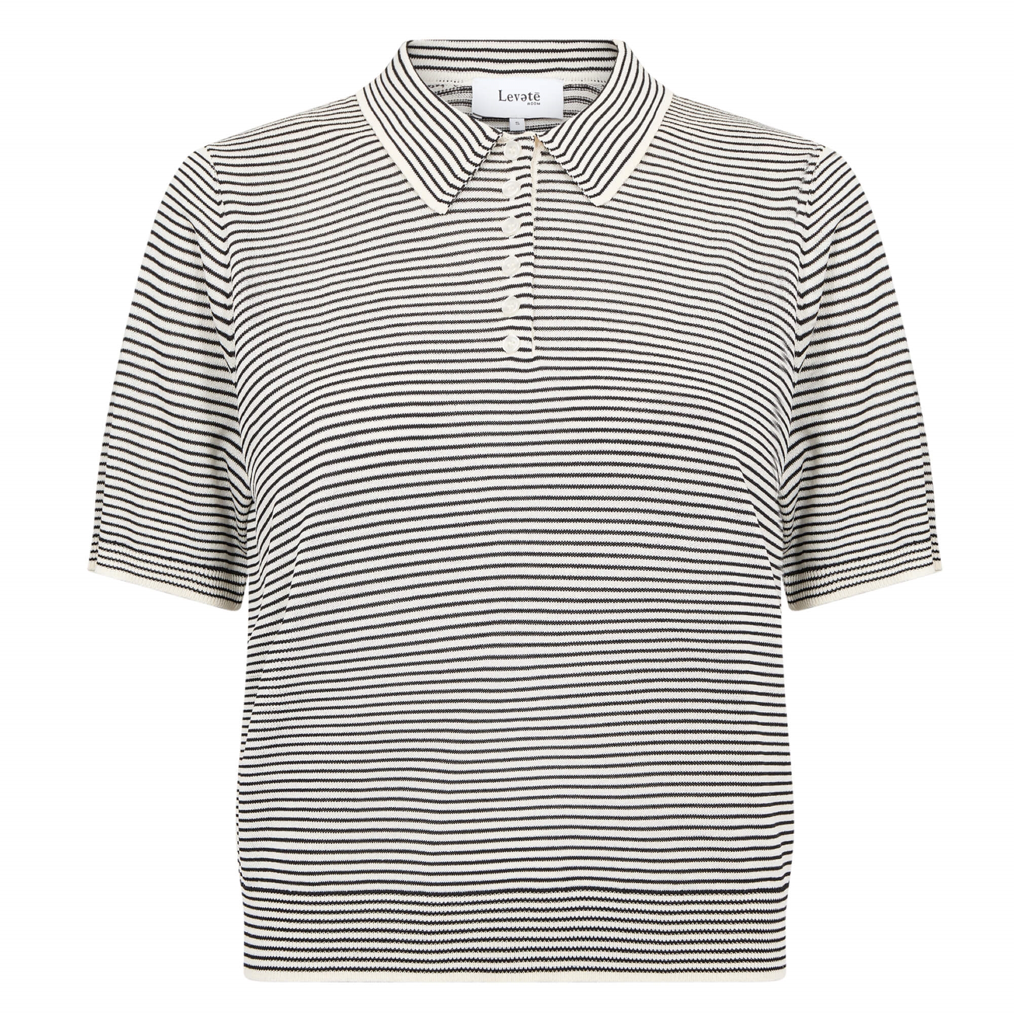 LR-POLENA 1 er en stilfuld polo. Den har en klassisk krave, korte ærmer og et diskret stribet mønster med knaplukning foran. Sæt den sammen med skræddersyede bukser eller en nederdel for et elegant look.