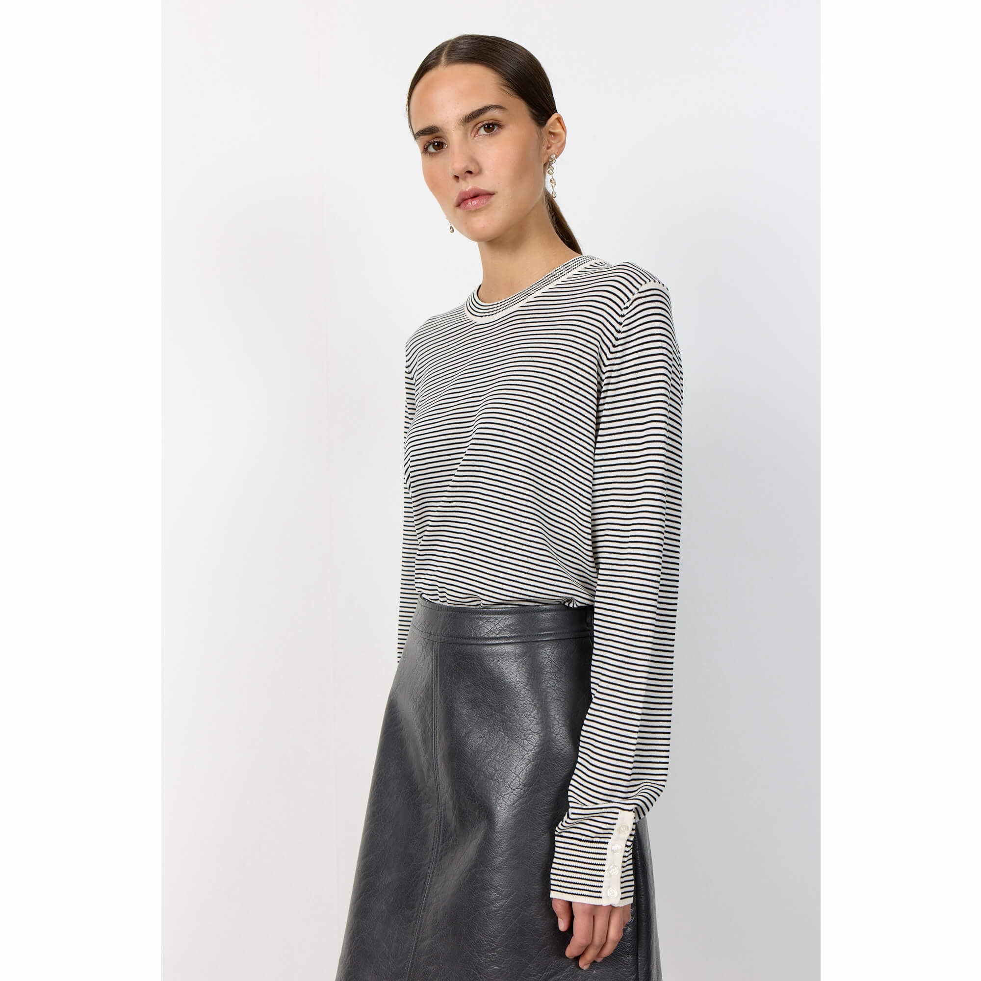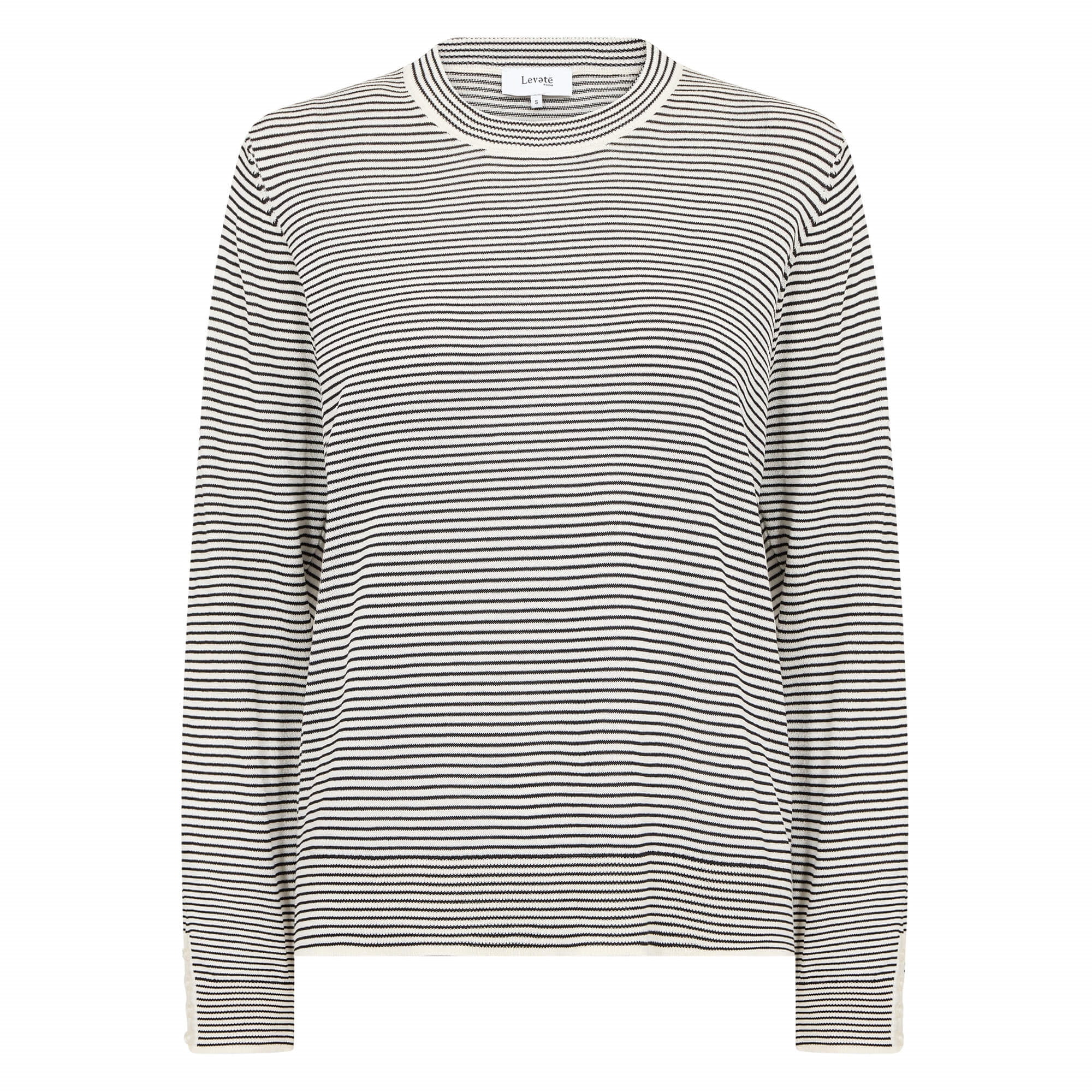 LR-POLENA 2 fra Levete Room er en behagelig pullover fremstillet af 60 % LENZING™ ECOVERO™-viskose og 40 % genanvendt polyester. Den har en diskret stribet tekstur, en klassisk rund halsudskæring og fine knapdetaljer på manchetterne. Sæt den sammen med skræddersyede bukser for et elegant look eller jeans til en afslappet dag ude.