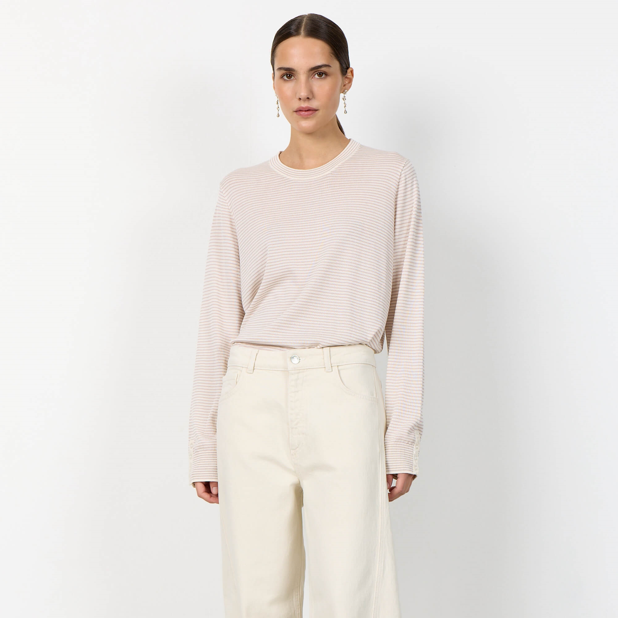 LR-POLENA 2 fra Levete Room er en behagelig pullover fremstillet af 60 % LENZING™ ECOVERO™-viskose og 40 % genanvendt polyester. Den har en diskret stribet tekstur, en klassisk rund halsudskæring og fine knapdetaljer på manchetterne. Sæt den sammen med skræddersyede bukser for et elegant look eller jeans til en afslappet dag ude.