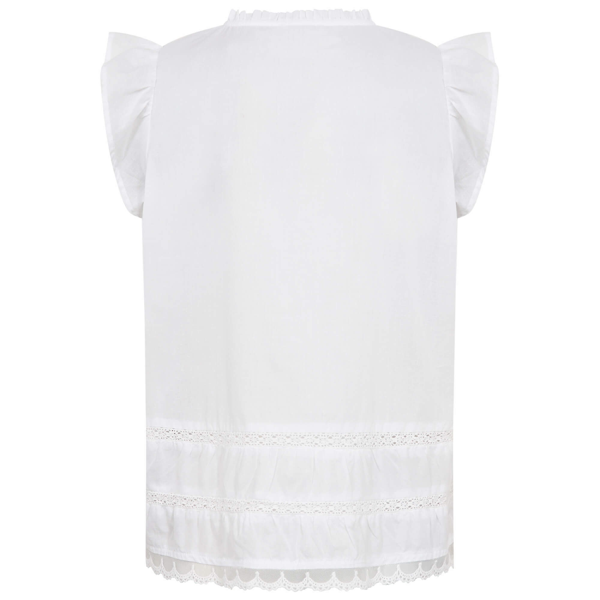 LR-ROSY 2 er en feminin bluse fremstillet af 100 % økologisk bomuld. Den har fine flæsedetaljer ved skuldrene, V-hals med knaplukning og fine blondeindsatser langs kanten. Sæt den sammen med dine yndlingsjeans eller en elegant nederdel for et afslappet, men elegant look.