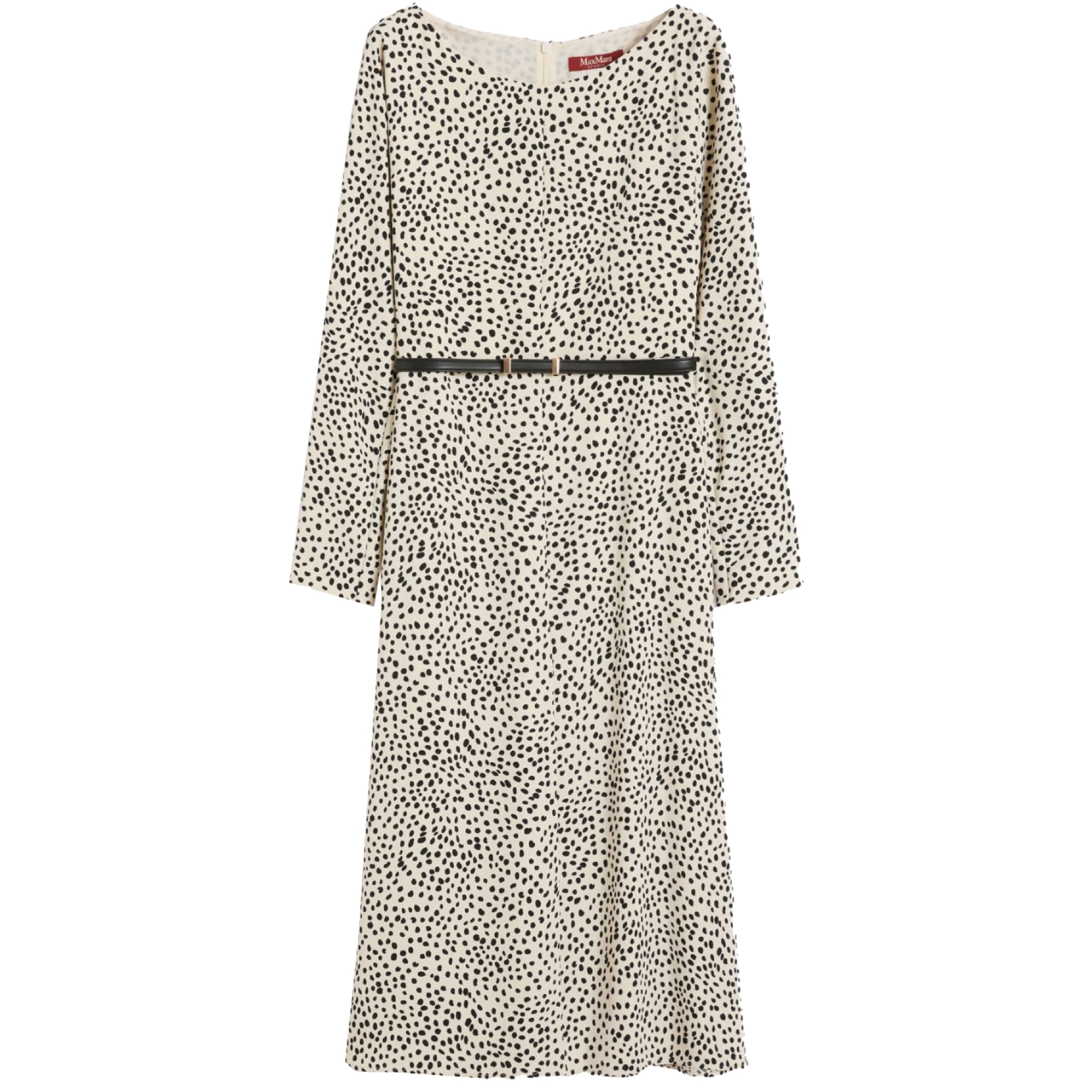 MSTPIROGHE Kjole fra Max Mara Studio er en midikjole i et let materiale med sorte prikker på lys bund. Kjolen er skåret, så den går let ind i taljen og falder naturligt derfra, hvilket giver en enkel og fin silhuet. Den kommer med et bælte, som kan bruges til at markere taljen yderligere efter behov. Modellen har rund hals, lange ærmer og et rent udtryk, der gør den velegnet både til hverdagsbrug og pænere lejligheder.