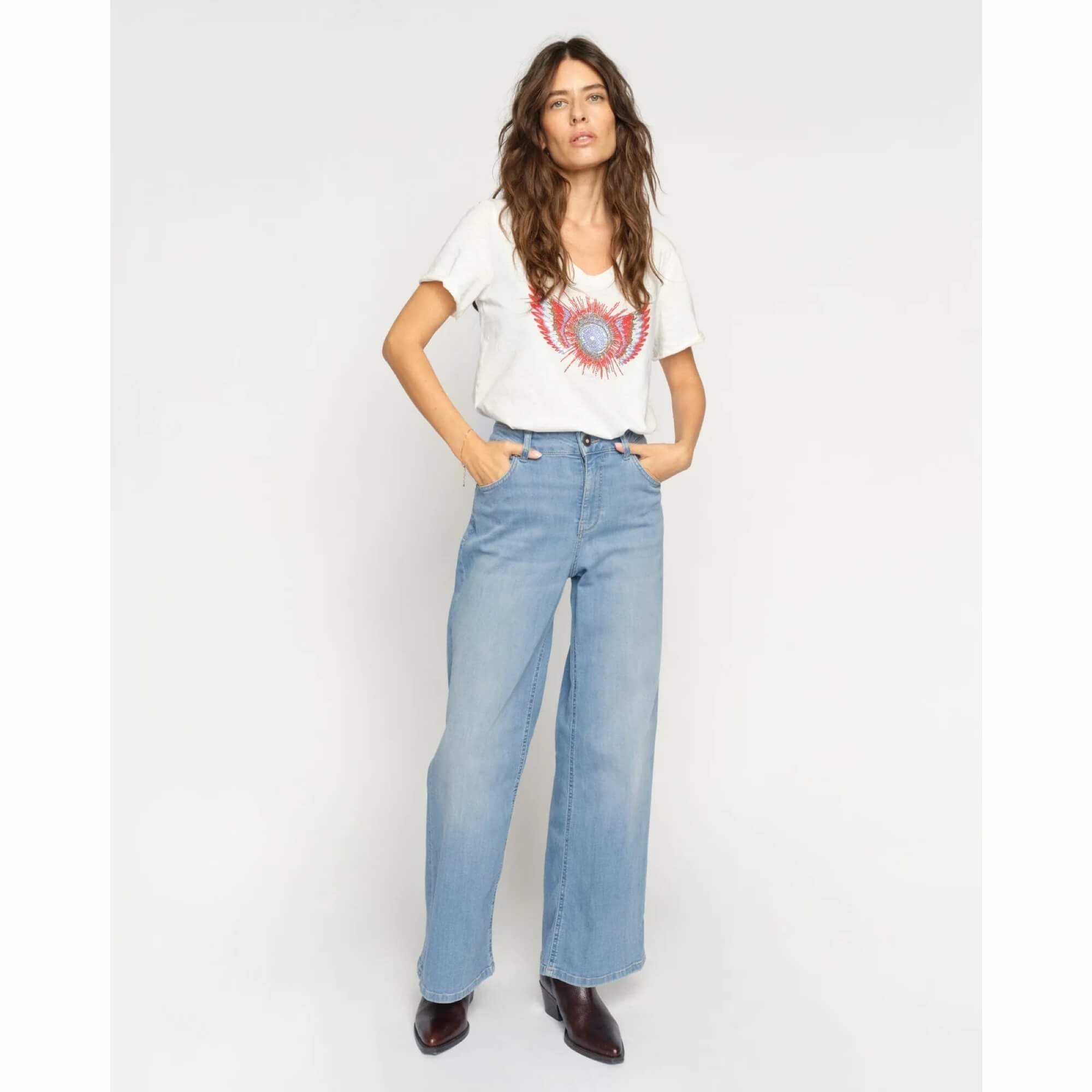 Dara Salute er et par moderne jeans med vide ben og en flatterende høj talje. De er fremstillet i blødt, strækbart denim, der holder faconen og samtidig giver komfort. Den rene vask og ubesværede silhuet gør dem til et tidløst tilskud til enhver denimgarderobe.