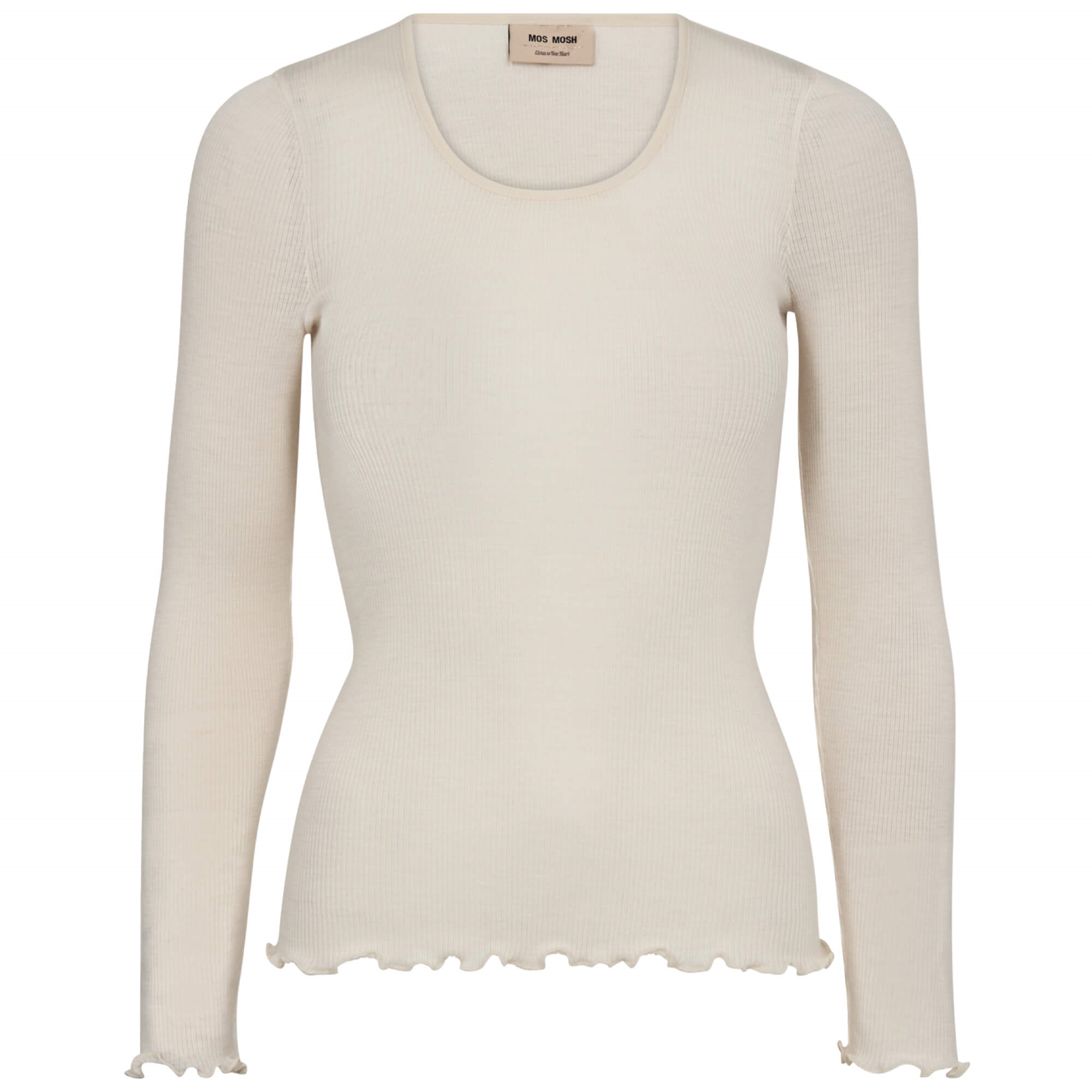 Denne tætsiddende Bluse fra Mos Mosh er fremstillet i en blød og luksuriøs blanding af uld og modal, der sikrer komfort hele dagen. Det ribstrikkede design fremhæver figuren, mens de bølgede kanter ved ærmer og søm tilfører et feminint og elegant touch. En alsidig basisstyle, der passer perfekt til både tailoring og denim - et ægte garderobemust-have.