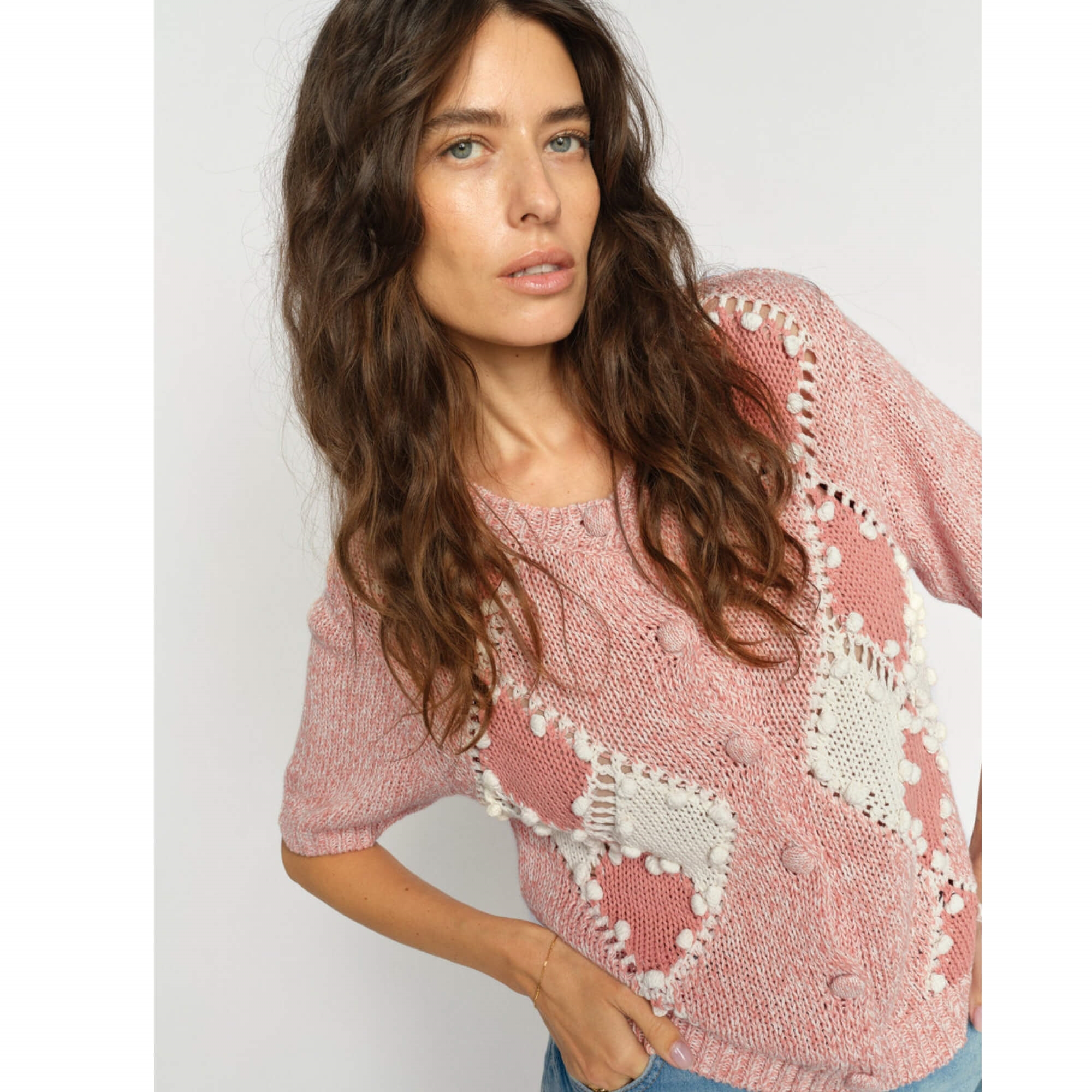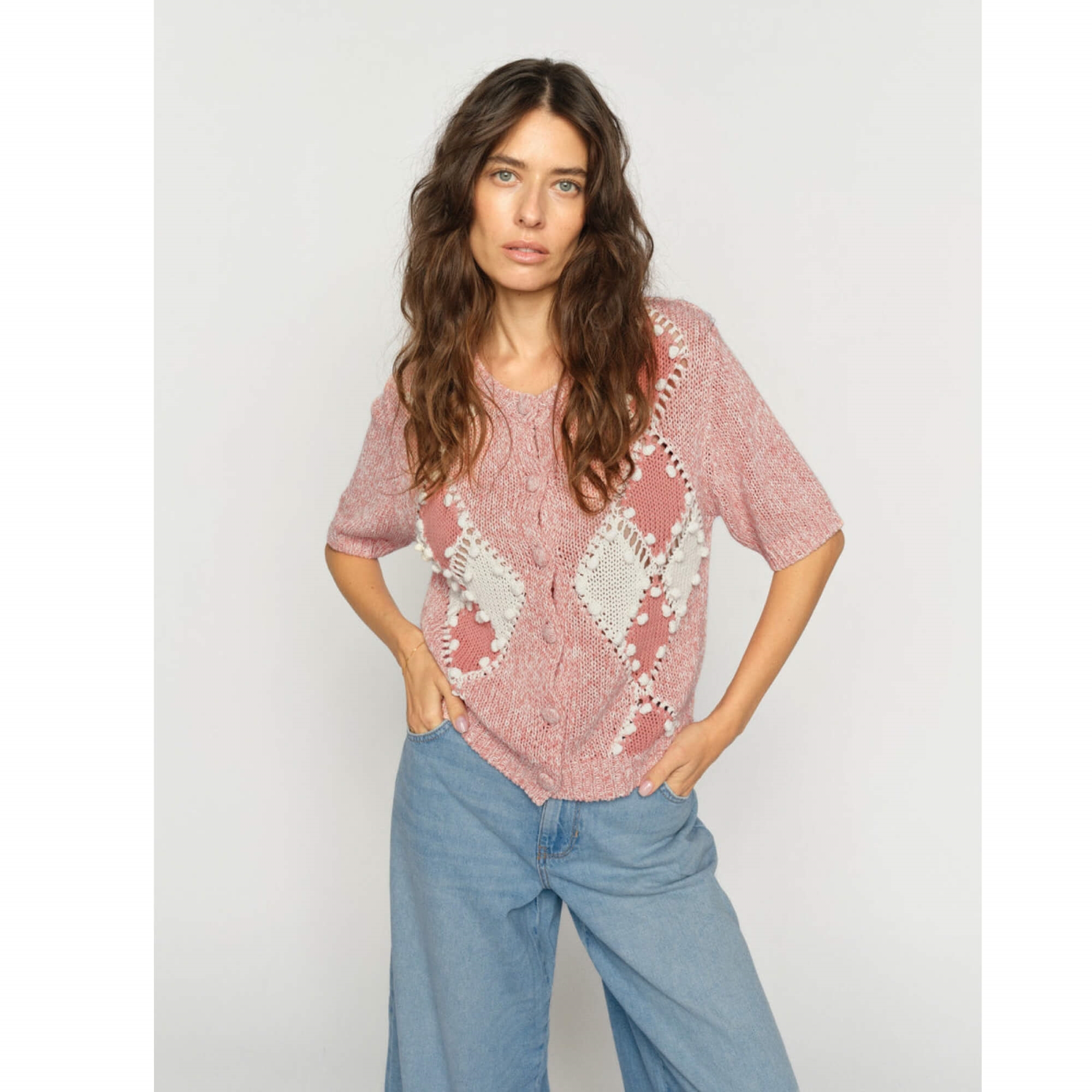 Den smukke Elio strik cardigan er en kortærmet model med et elegant grafisk diamantmønster. Den har rund halsudskæring og knaplukning og er fremstillet i en let og åndbar blanding af hør og bomuld. Materialet giver en blød, men struktureret fornemmelse, som gør den perfekt til lag-på-lag styling i de varmere måneder.