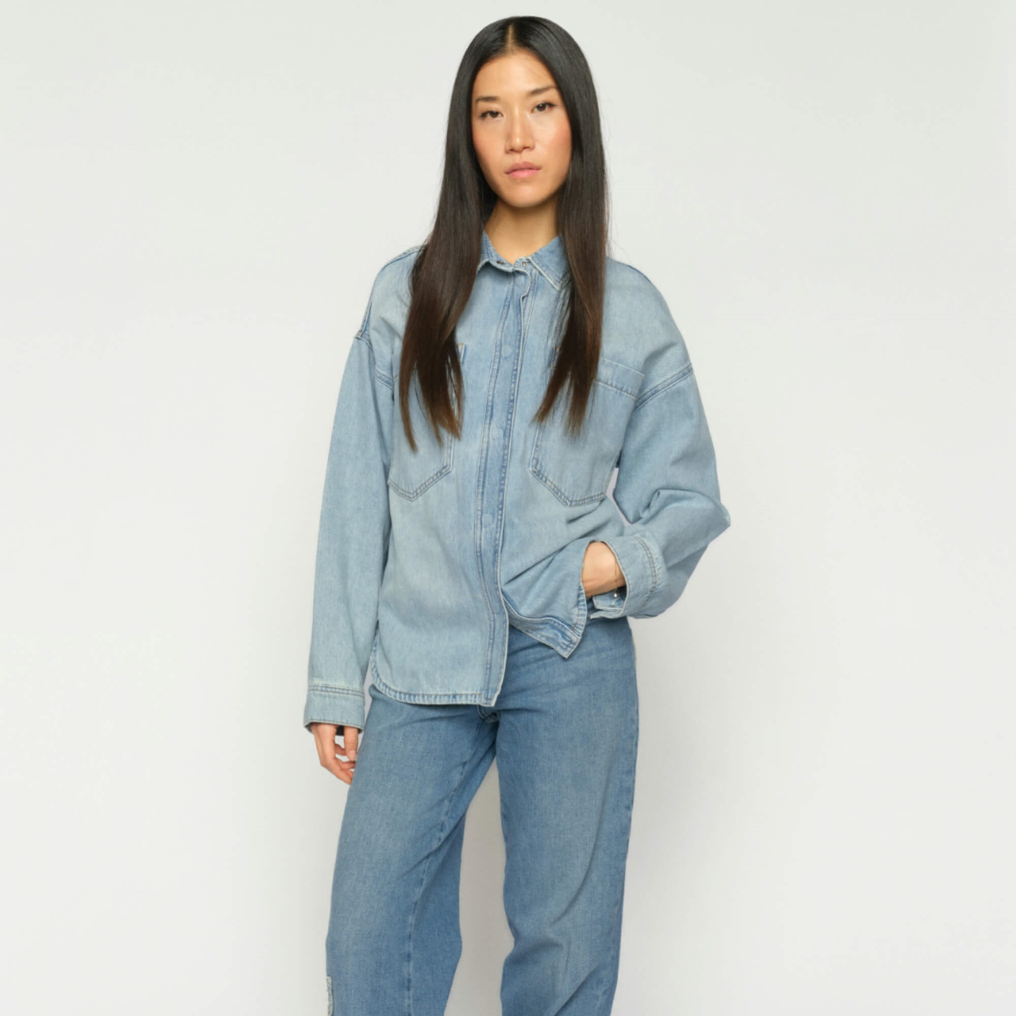 Den elegante Emm Flower skjorte kommer i en smuk light blue denim-farve, der er let og frisk – perfekt til forår og sommer. Skjorten kan styles både som overshirt eller bæres alene for et mere rent look. På bagsiden er skjorten dekoreret med et iøjnefaldende blomsterprint skabt af rhinsten, som giver designet af skjorten et cool twist.