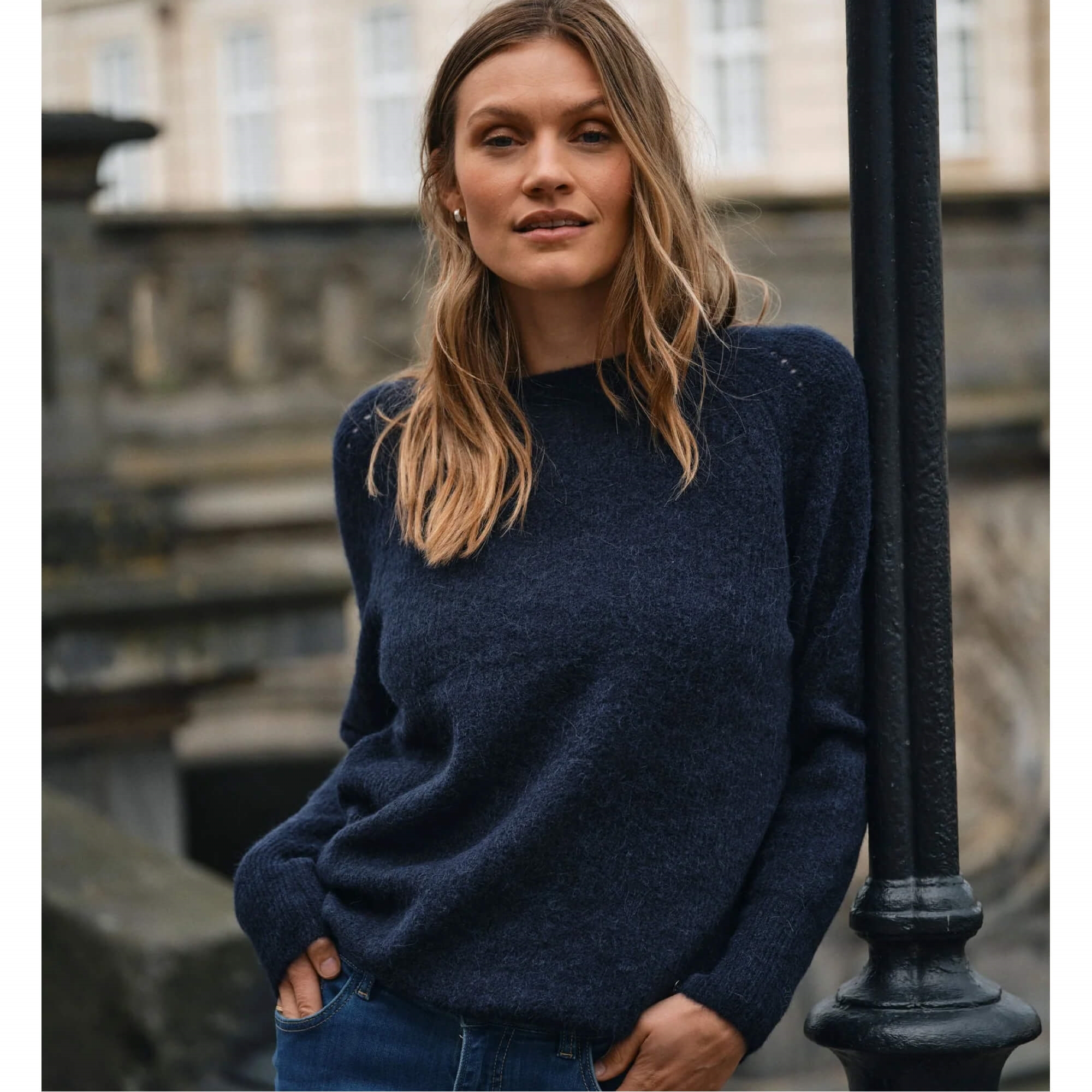 Tammy Thora fra Mos Mosh er en tidløs strik, fremstillet i en blød og lun uldblanding med en klassisk O-hals og en regular fit. Perfekt til de koldere måneder, hvor den nemt kan bruges over en skjorte eller styles med jeans for et varmt og ubesværet vinterlook.