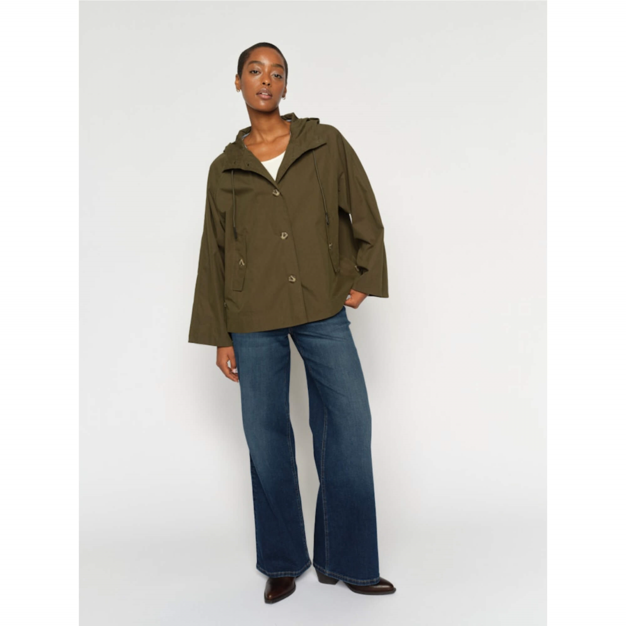 Sheena Short Jakken fra Mos Mosh er en kort jakke med et moderne og afslappet udtryk. Den har hætte med justerbare snøre, knaplukning og sideknapper, som giver en let og komfortabel pasform. Splitdetaljen i ryggen understreger den A-formede silhuet. En alsidig jakke i farven Olive Night, som er nem at style med jeans og en let strik til hverdagsbrug.