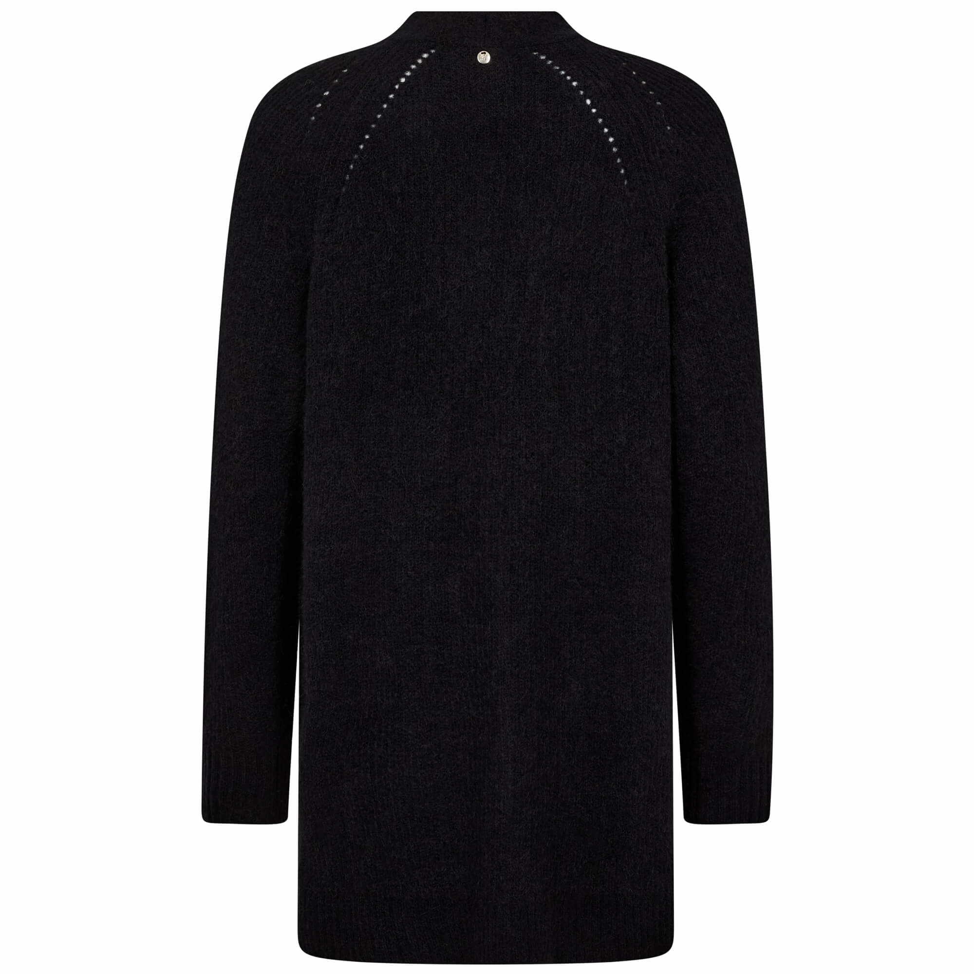 Elegant, lang cardigan i en klassisk sort farve. Den har en løs og afslappet pasform med et blødt, vamset udtryk. Strikket i en fluffy alpaka- og uldblanding, der giver en let og eksklusiv struktur. Perfekt som et stilrent lag til både kjoler og bukser.