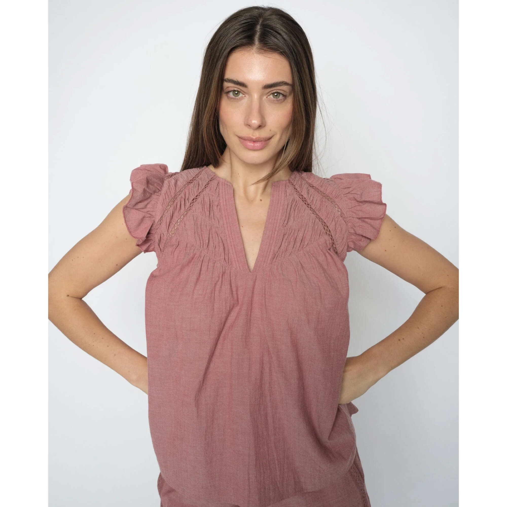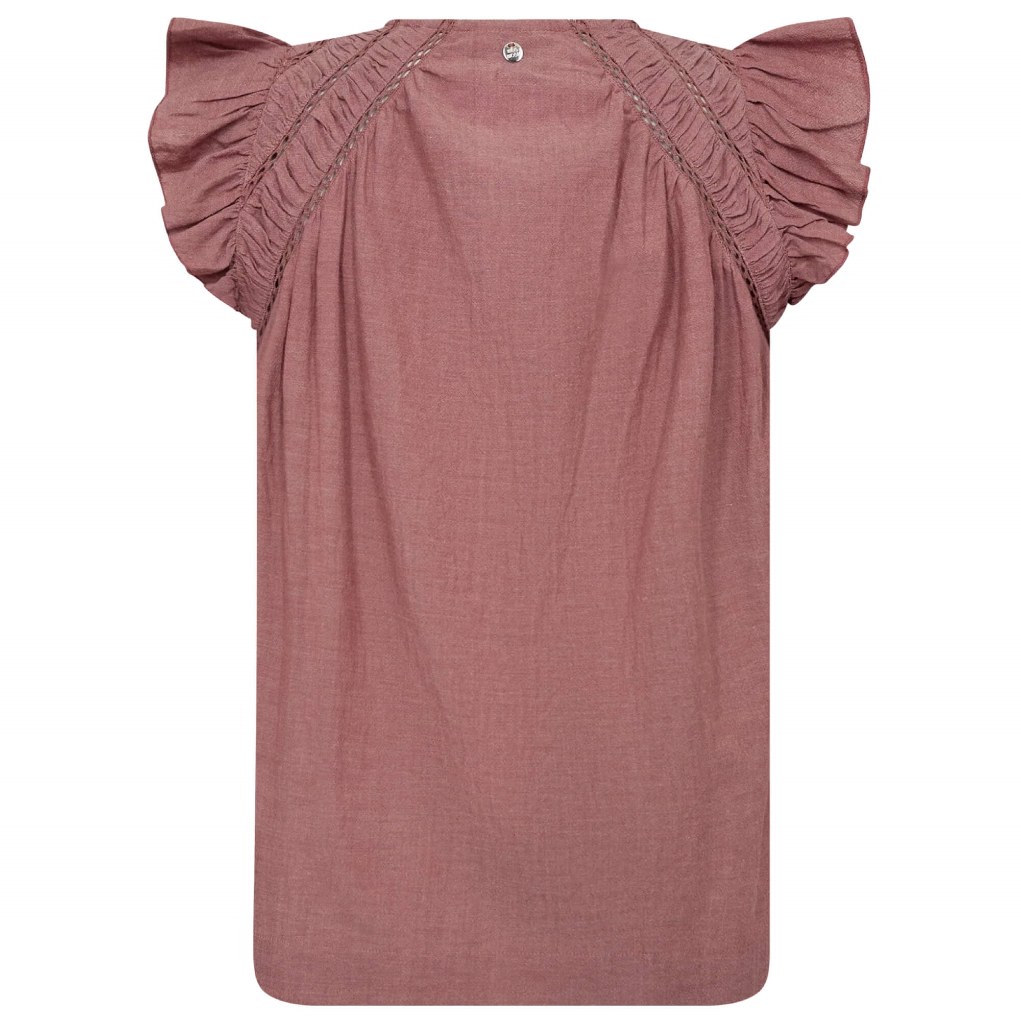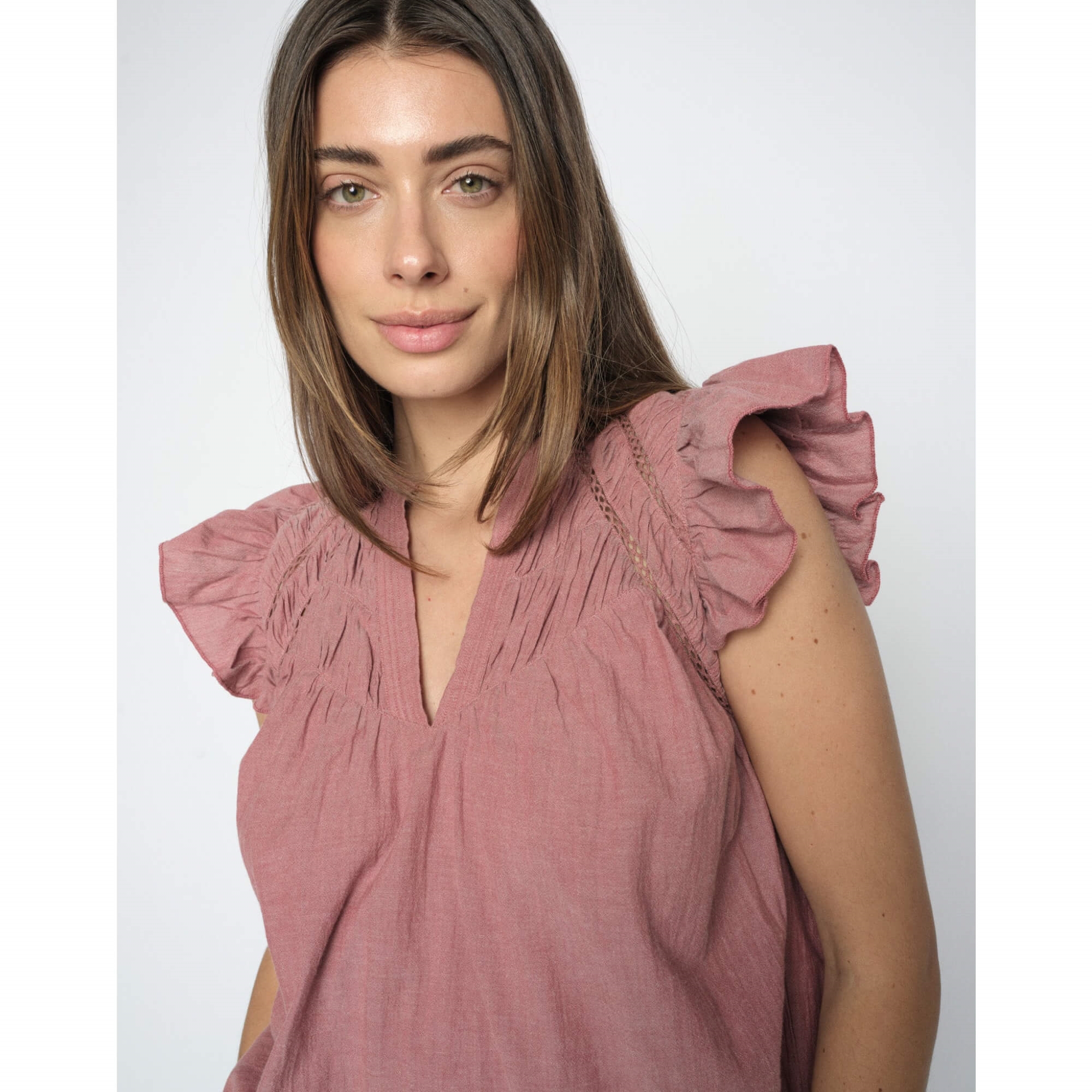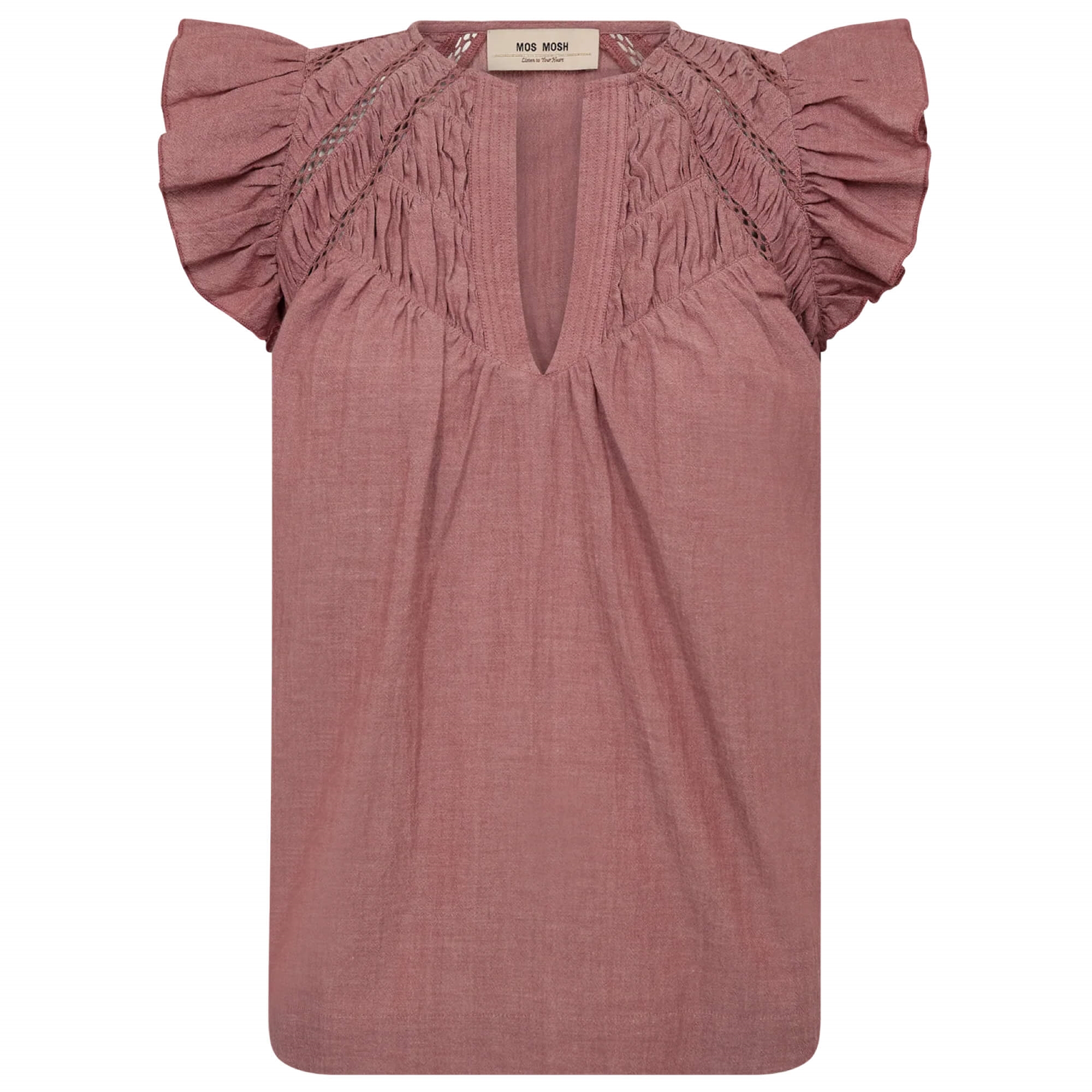 Woda Izha blusen fra Mos Mosh er en elegant bluse i en let og blød kvalitet med meleret struktur. Blusen er designet med dyb V-udskæring, voluminøse korte ærmer og fine rynkedetaljer, og kommer i den smukke farve Cowhide. Et oplagt valg til både hverdag og pænere anledninger - style den med jeans for et afslappet look eller med nederdel eller habitbukser for et mere elegant udtryk.