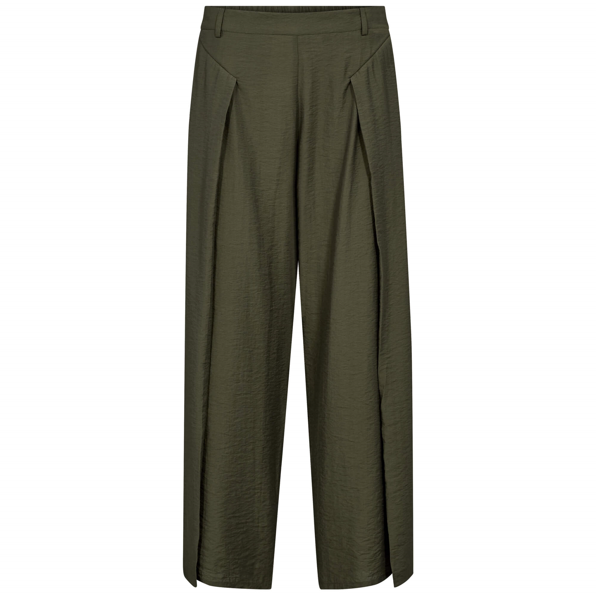 Bukserne er designet med høj talje og fine læg foran, som giver et stilrent look og ekstra komfort. Den lette kvalitet har en diskret struktur, der tilfører dybde og eksklusivitet til designet, samtidig med at de er behagelige at have på hele dagen.