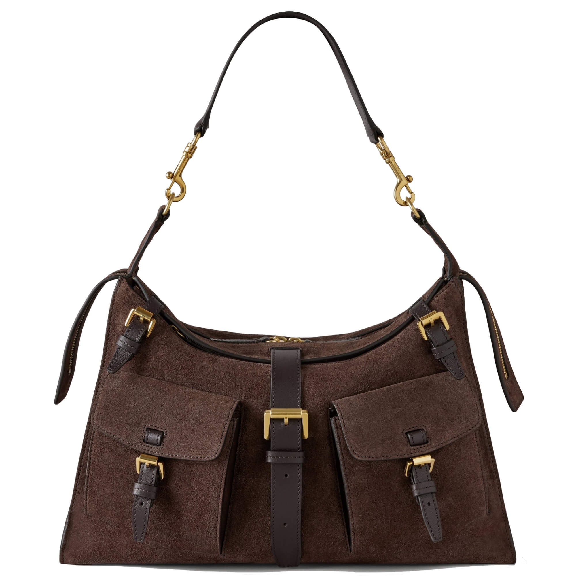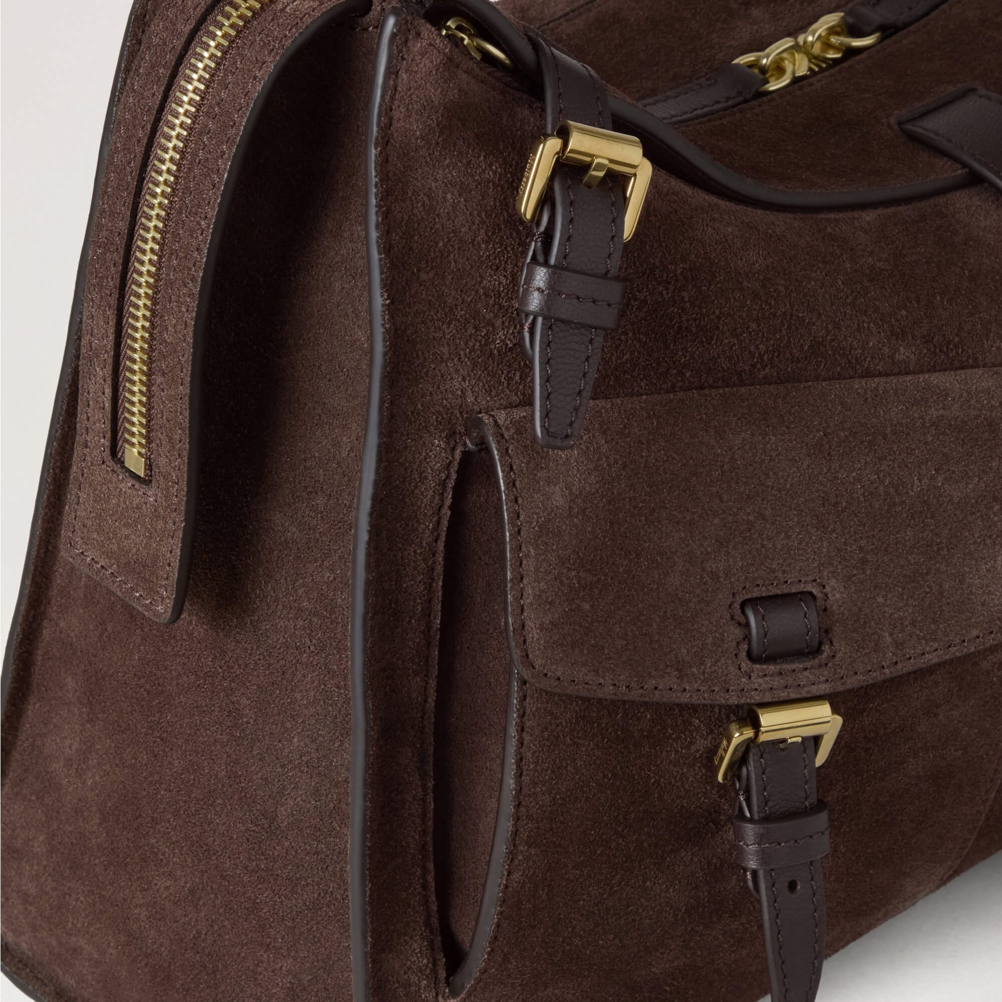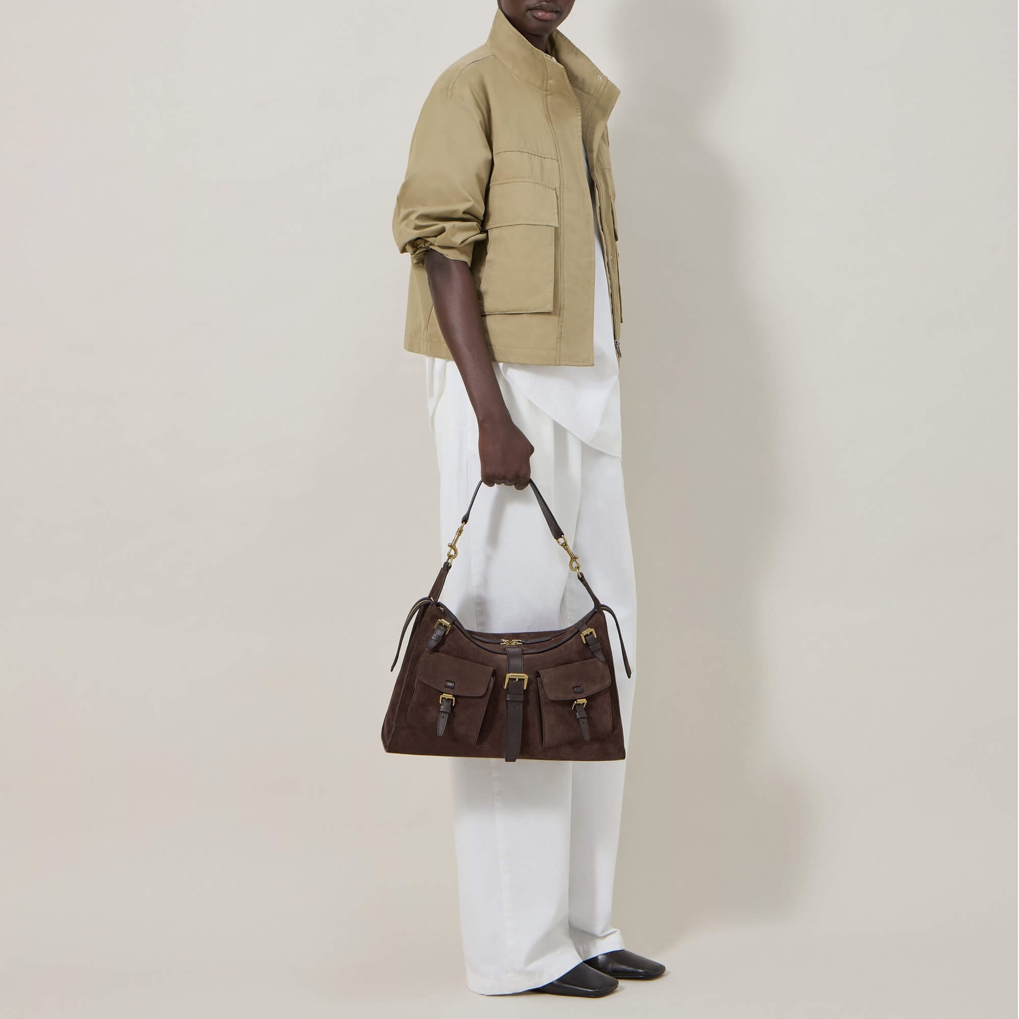 En ikon vendt tilbage, skabt til nuet. Roxanne Shoulder Bag i Chocolate Suede er Mulberry-arv med et moderne twist – og et statement-piece, der løfter enhver garderobe.