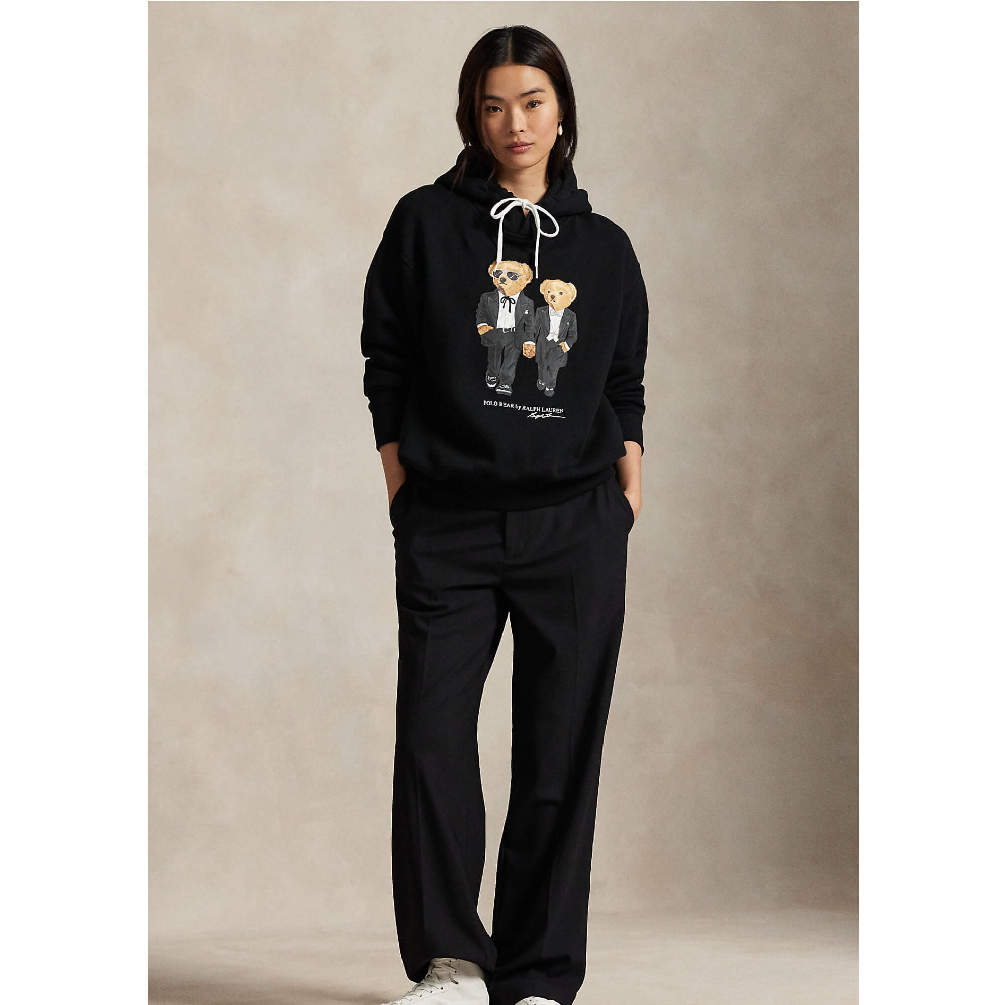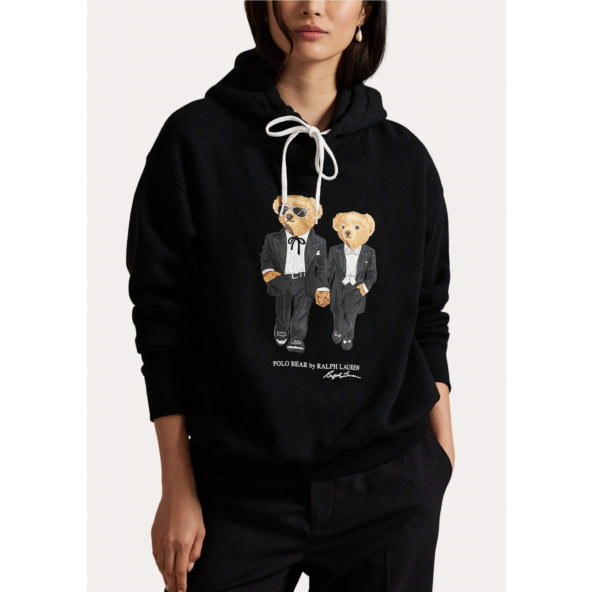Denne limited edition hættetrøje prydes af et motiv med to bjørne i elegant gallapåklædning. Designet hylder den glamour og energi, der kendetegner særlige begivenheder, og tager udgangspunkt i et legendarisk foto af hr. og fru Lauren ved en prisoverrækkelse i slutningen af 1970’erne.