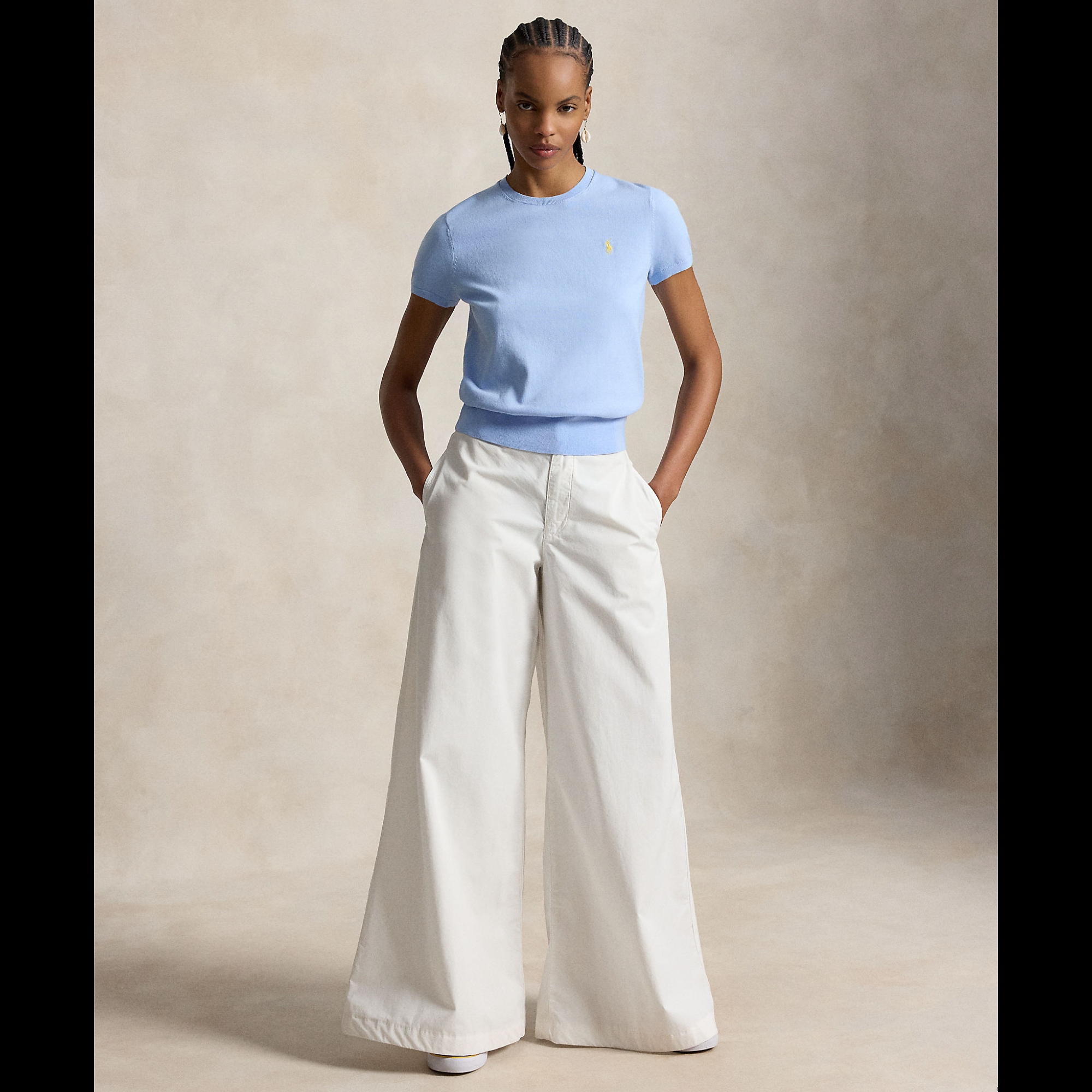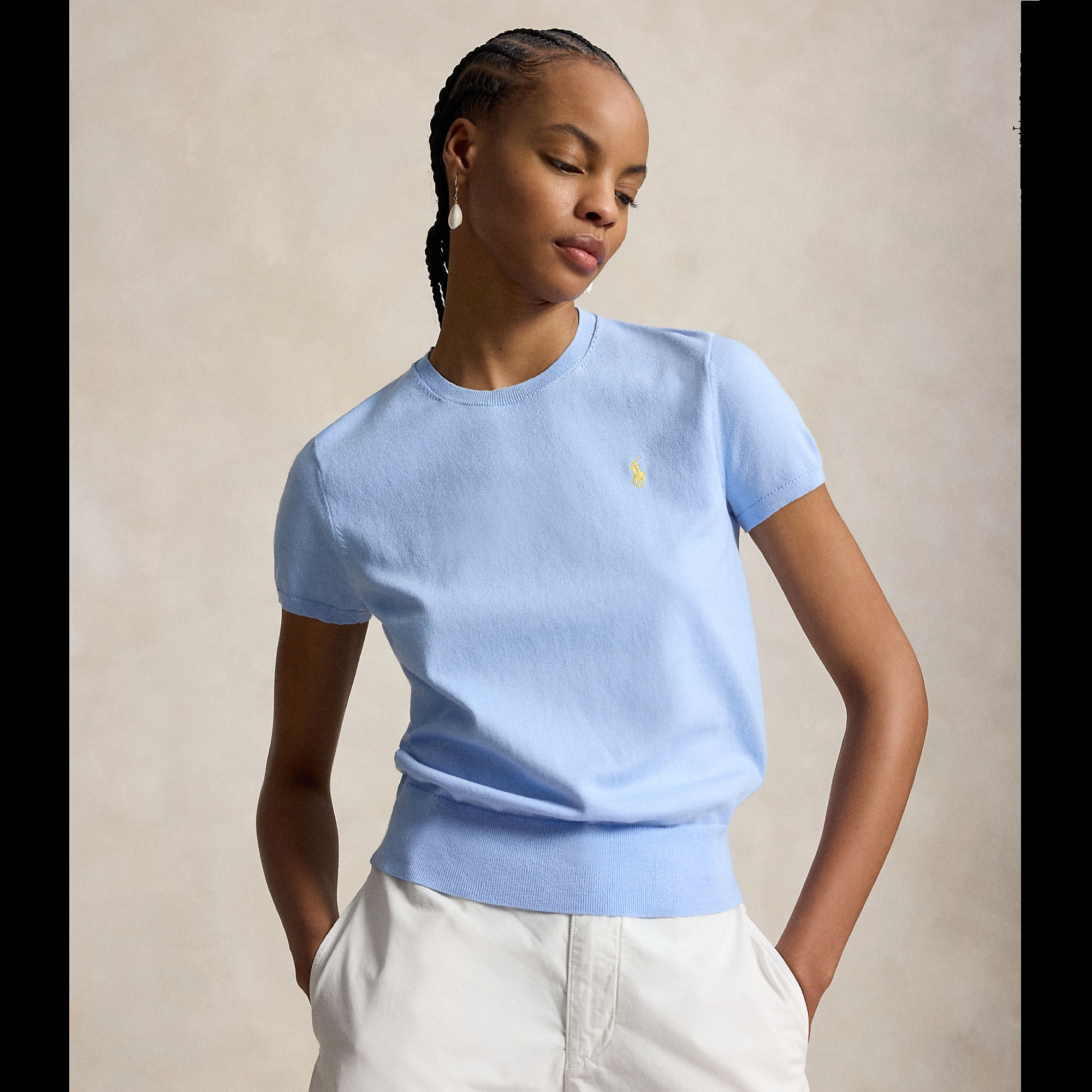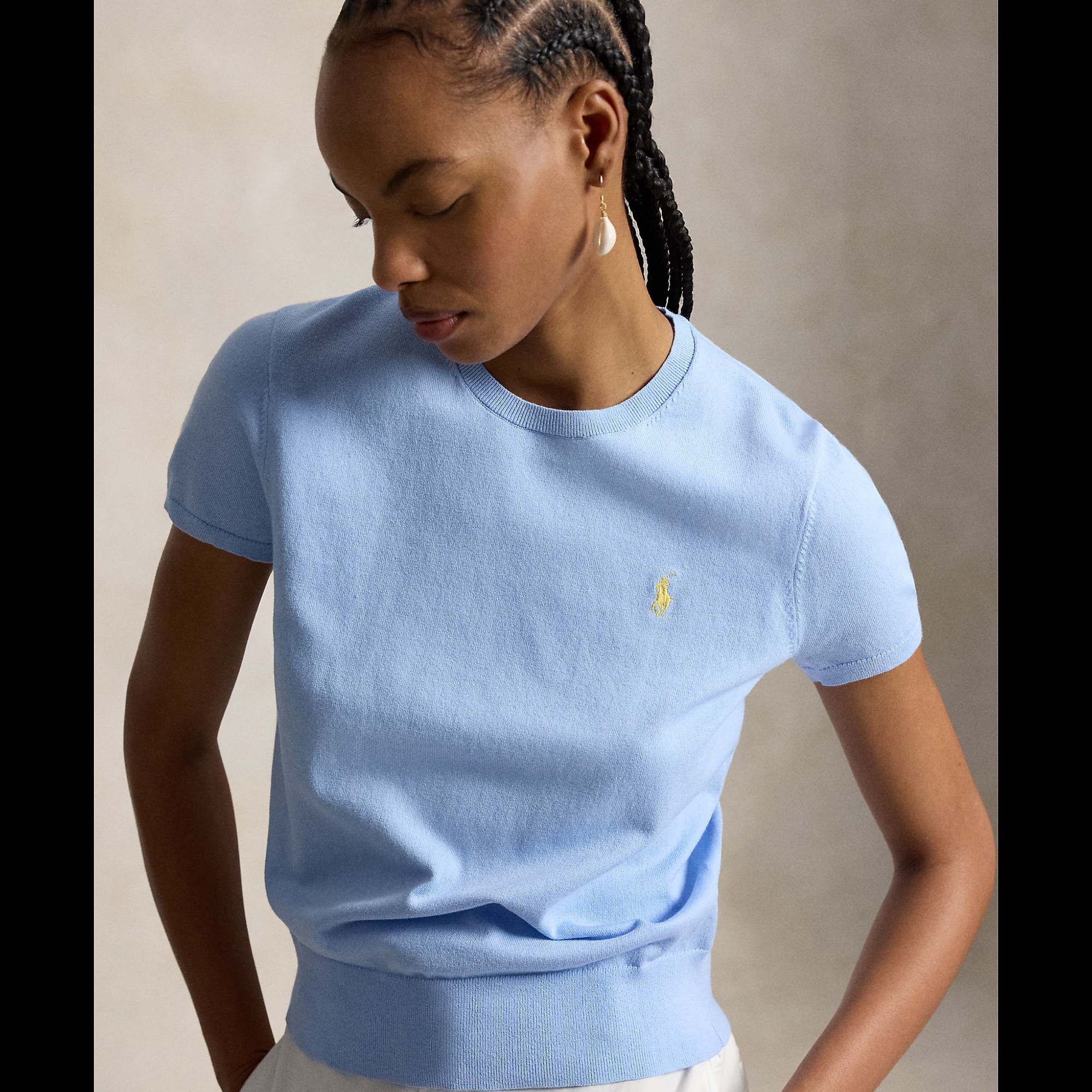 Denne fine kortærmede sweater fra Polo Ralph Lauren i den smukke babyblå farve er et must-have i garderoben. Blusen er designet med en klassisk rund hals og har den ikoniske broderede Pony på brystet, der tilfører et genkendeligt touch. Perfekt til både afslappede og mere velklædte outfits - style den med jeans eller chinos for et casual look.
