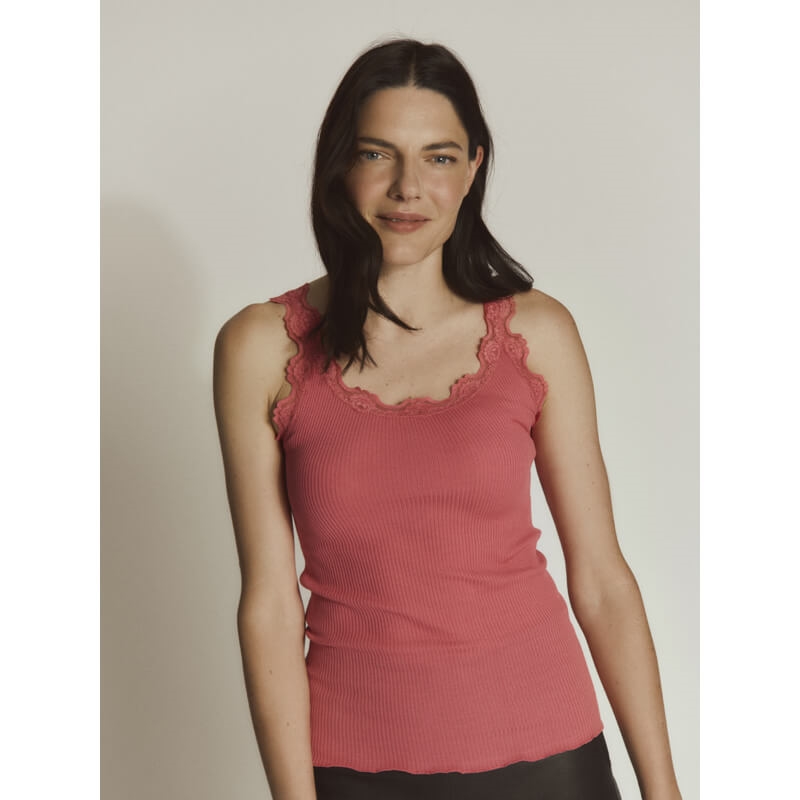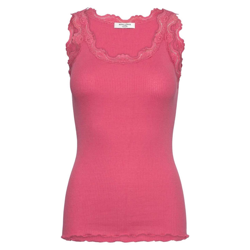Klassisk blonde top fra Rosemunde i en ny smuk pink farve - rapture rose. Flot feminin basic top i rundstrikket lækker blød silke og bomuldsblanding, med en rigtig fin blondekant hele vejen rundt i udskæringen og på kanten af stropperne. Brug toppen som den er til et par rå jeans eller under en skjorte eller som en basic silkebluse.