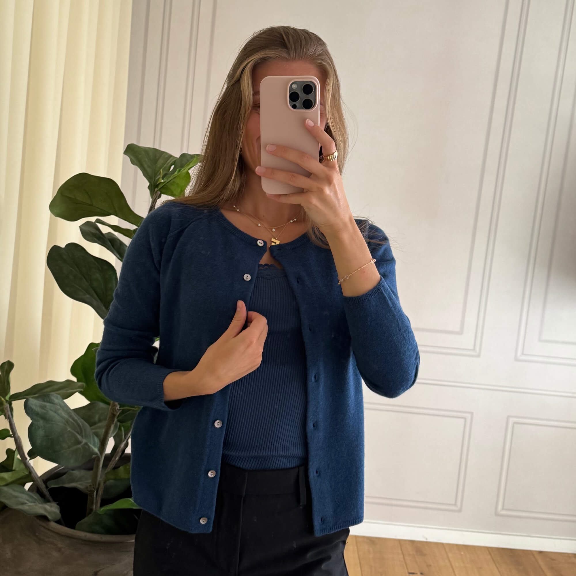 Cardiganen lavet i 70% uld og 30% Cashmere hvilket giver den en skøn blød og let kvalitet. En musthave i sommergaderoben der forbliver et sikkert hit år efter år.