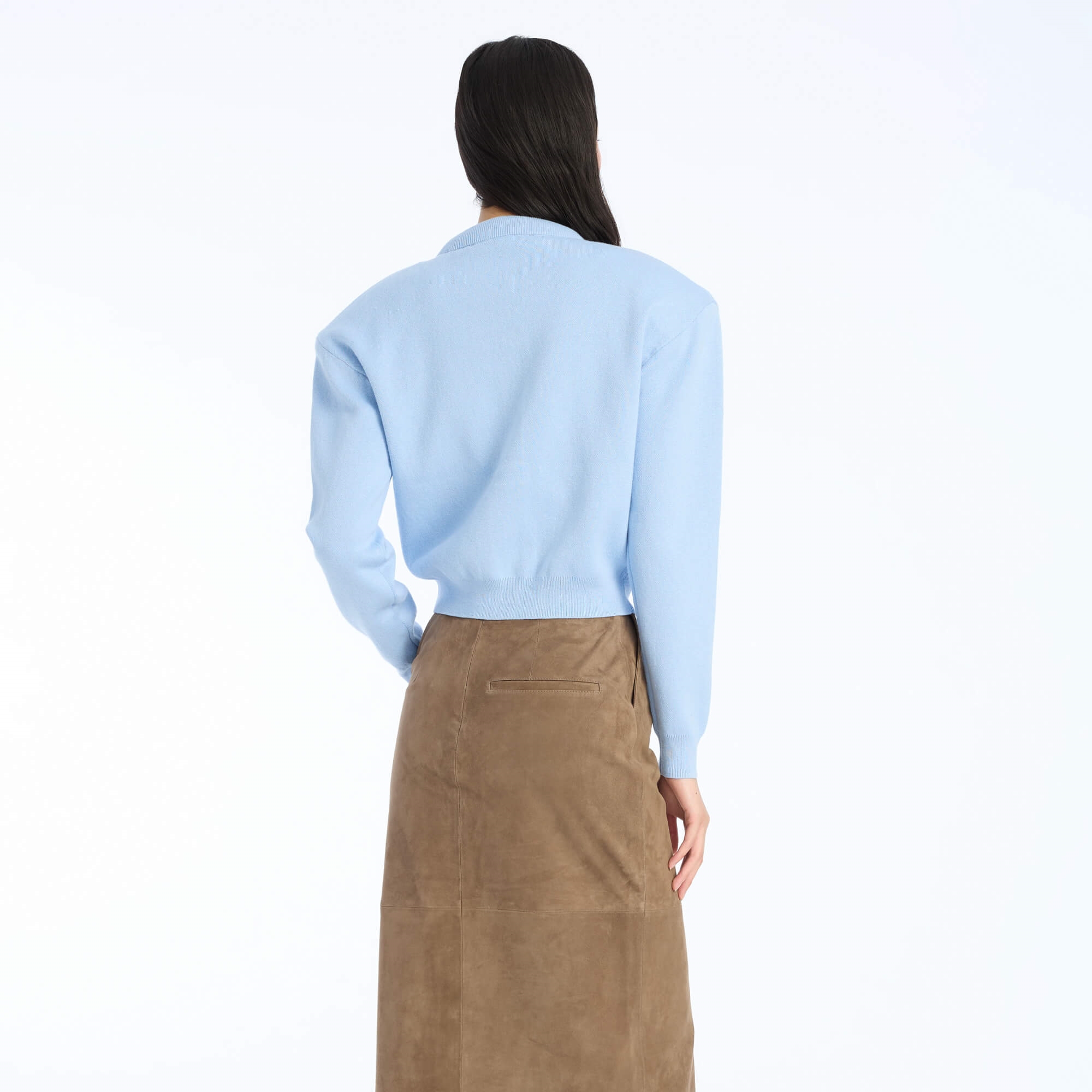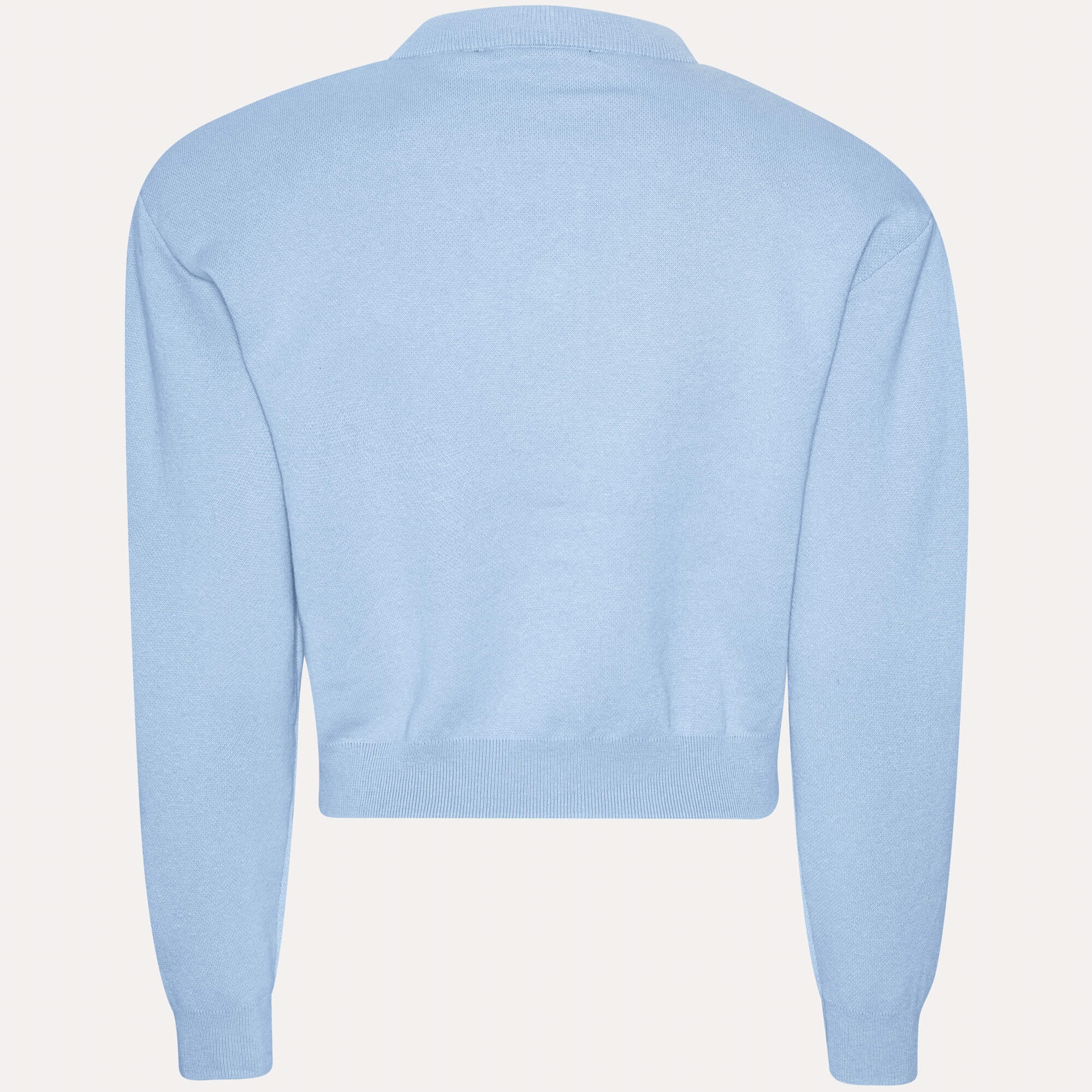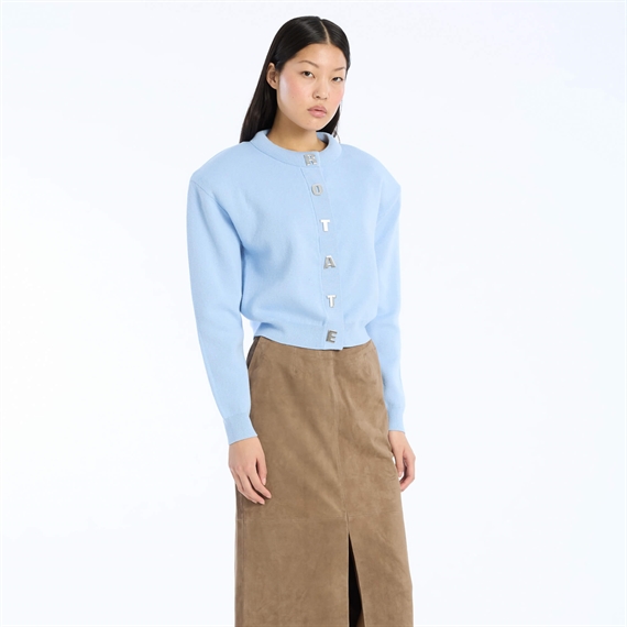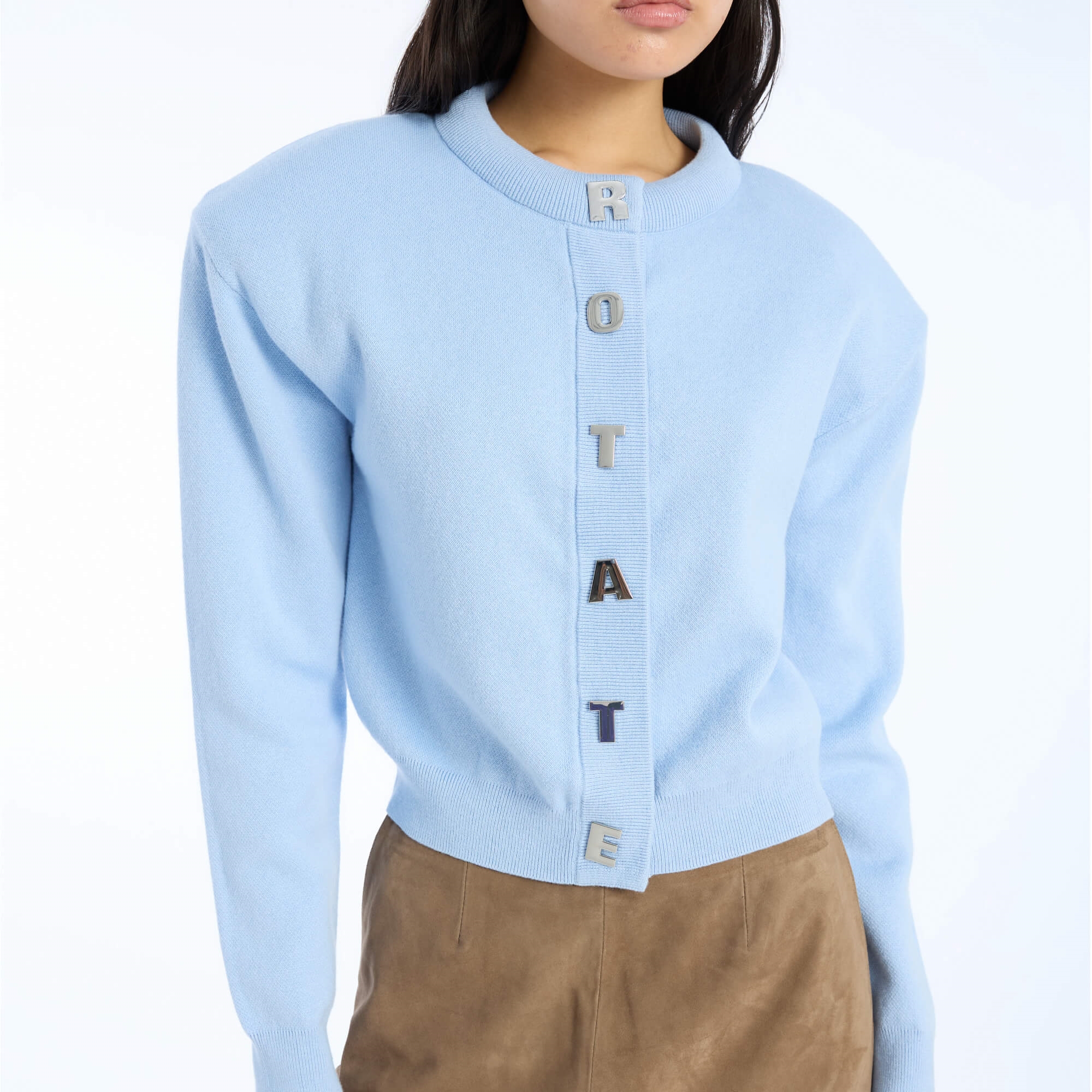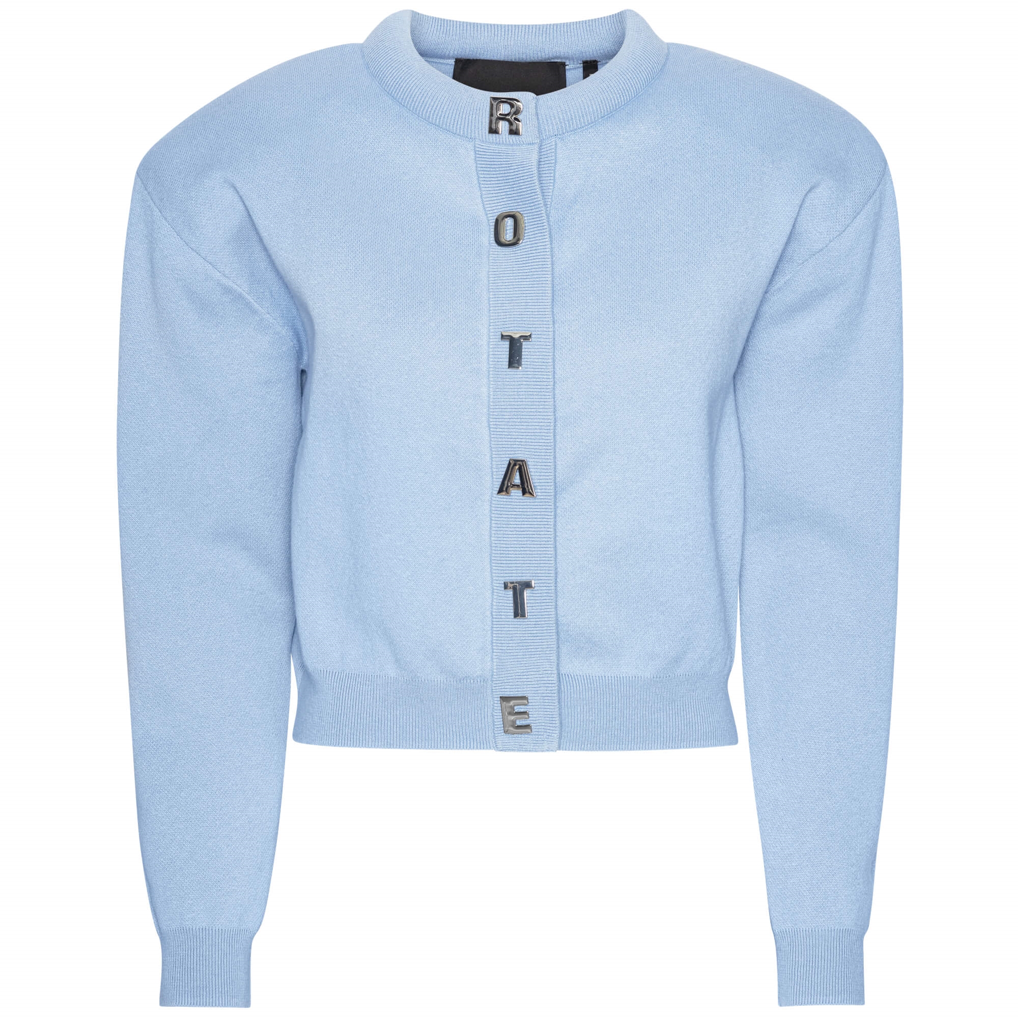 Denne fine cropped cardigan fra ROTATE, er strikket i en eksklusiv blanding af økologisk bomuld og cashmere. Det faste, men bløde materiale giver en smuk, struktureret pasform, der både føles og ser raffineret ud. Designet skiller sig ud med en fin ribkant ved halsudskæringen og knapstolpen, som tilføjer et grafisk twist. Fortil prydes cardiganen af metalbogstaver, der staver “ROTATE” – en iøjnefaldende detalje, der tilfører kant og karakter. Bemærk at den har skulderpuder, men de er nemt aftagelige. Smukkeste strik fra Rotate i en flot lyseblå farve!