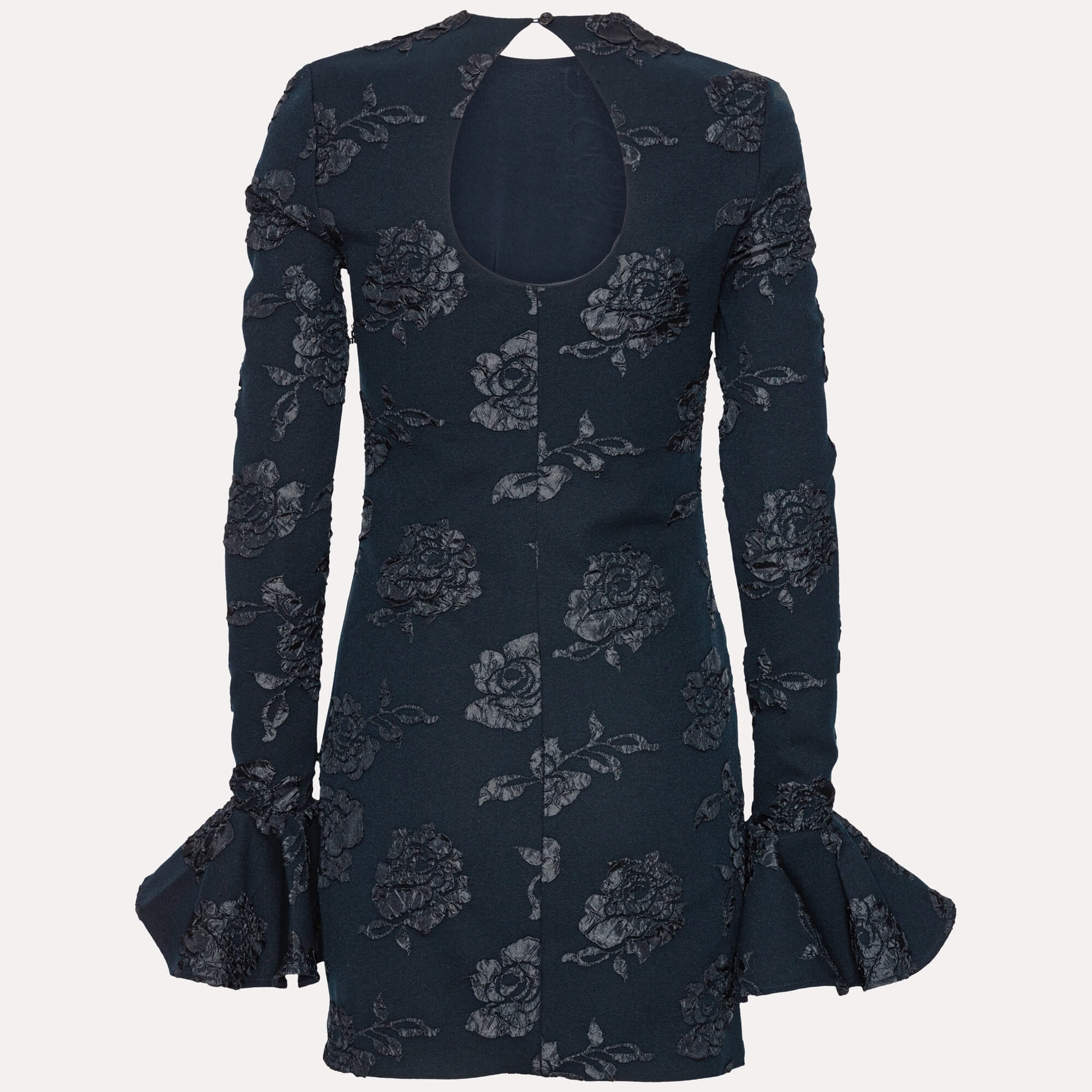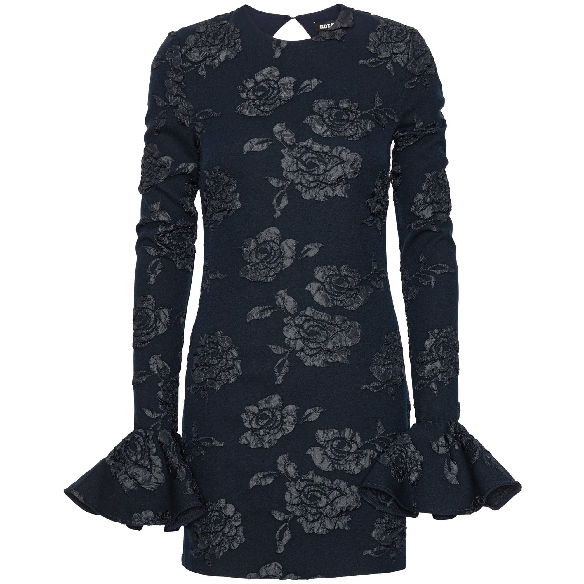 Denne elegante Jacquard Mini Kjole fra ROTATE by Birger Christensen er den perfekte kombination af sofistikeret luksus og moderne femininitet. Kjolen er designet i en dyb navy nuance, kaldet Sky Captain, og prydet med et smukt jacquardvævet rosenmønster, der giver et eksklusivt og tekstureret udtryk. Den figursyede silhuet fremhæver kroppen på en flatterende måde, mens de dramatiske klokkeærmer skaber et unikt og legende twist. Den høje hals og det elegante keyhole-detalje i nakken tilføjer et subtilt, sensuelt touch, som gør kjolen ideel til både festlige anledninger, middage og events, hvor du ønsker at skille dig ud.