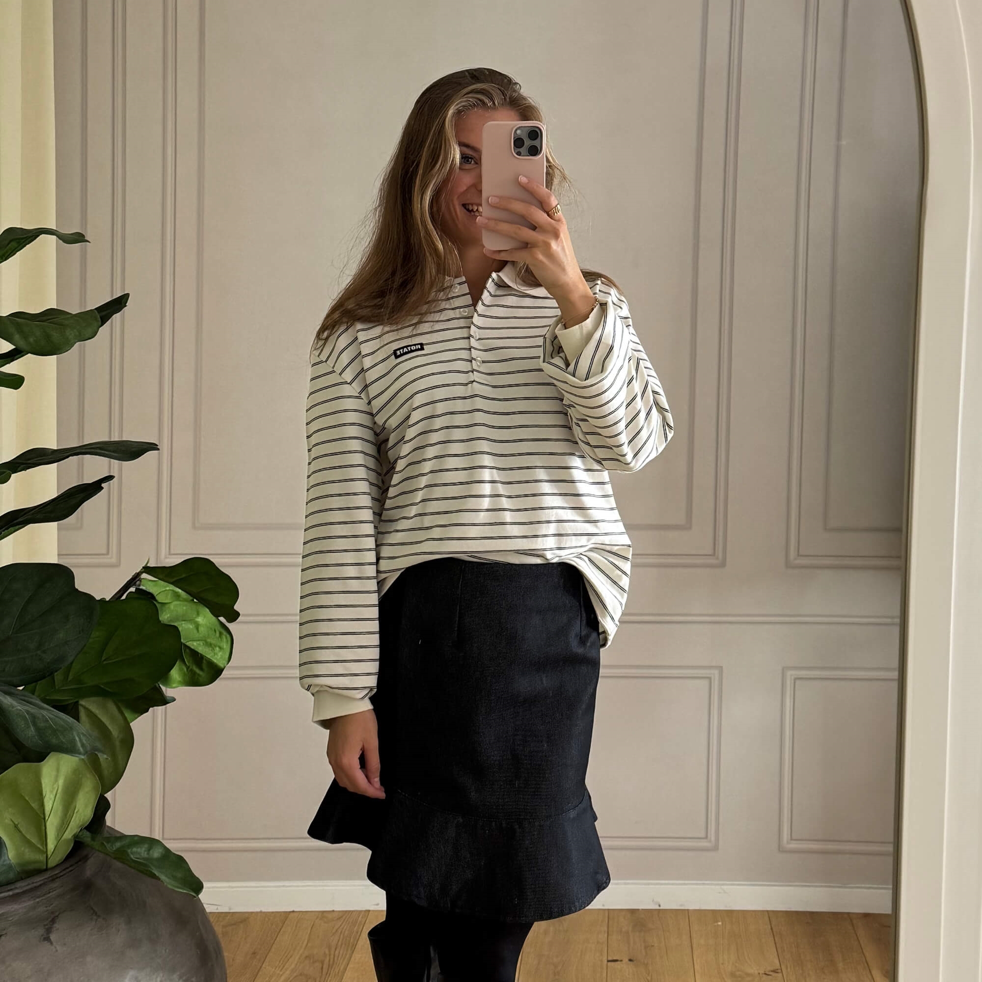 Rotate Piqué Longsleeve Polo i farven egret combi er en langærmet polo med et afslappet og sporty udtryk. Den er designet i en cremehvid base med tynde sorte striber, klassisk polokrave og knaplukning foran. På brystet har den et lille Rotate-logo patch, der giver et moderne og genkendeligt touch. Poloen har ribkant ved ærmerne og en løs pasform, som gør den behagelig til hverdagsbrug og nem at style både med jeans, nederdel eller casual bukser.