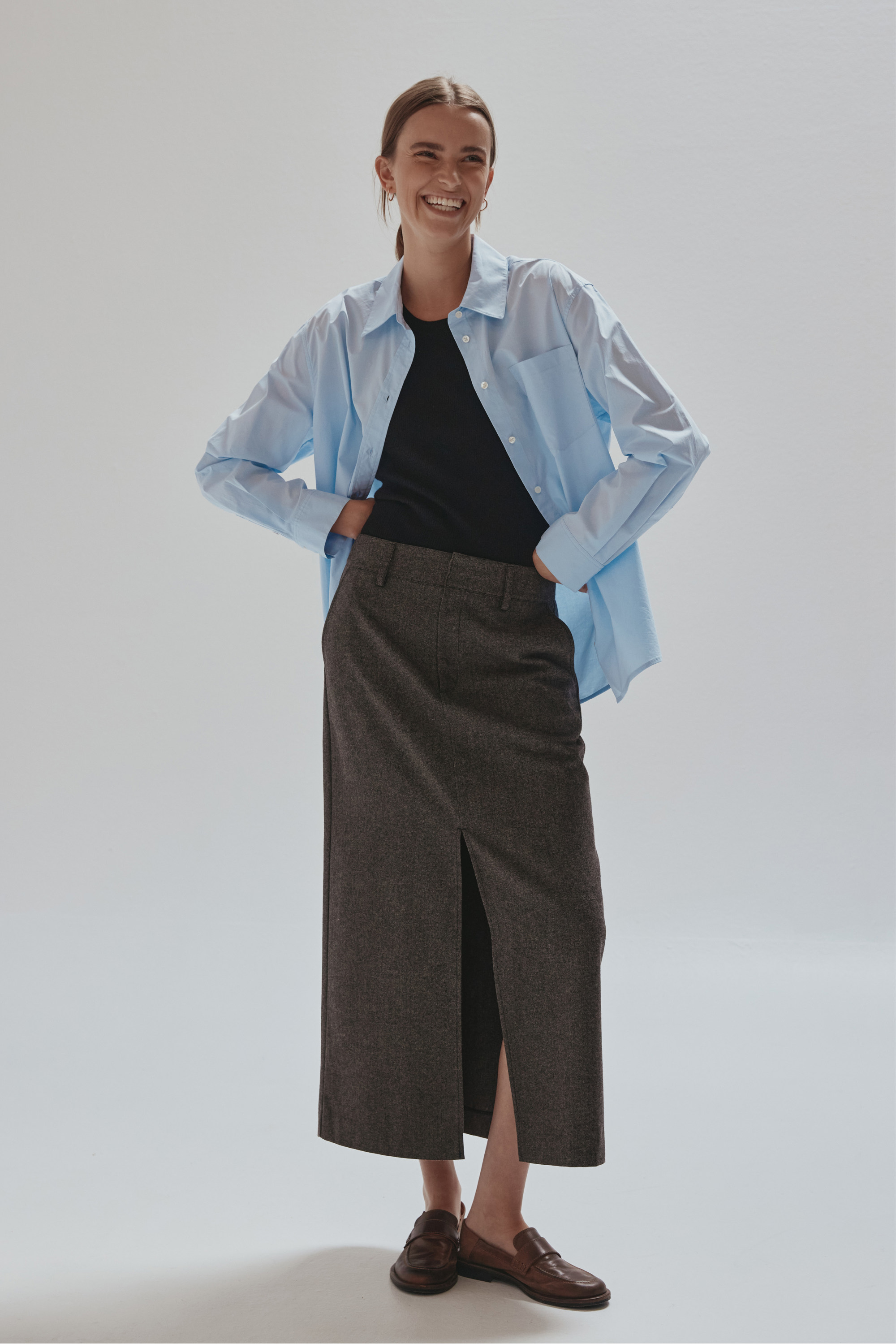 Sabin er en midi-længde nederdel med en klassisk pasform, der balancerer elegance og funktionalitet. Nederdelen har påsyede lommer bagpå og en markant slids foran, som tilføjer et moderne touch til det tidløse design.