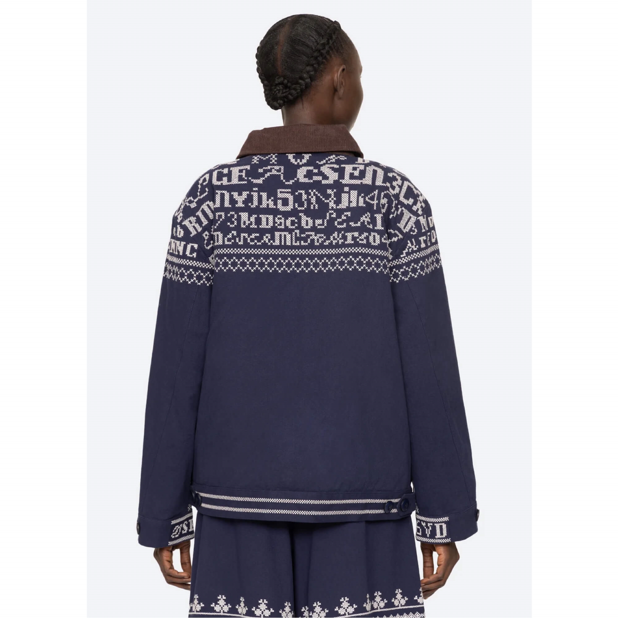 Denne skønne jakke fra Sea New York kombinerer funktionalitet med et smukt broderet design. Jakken er udført i en dyb navyblå farve med kontrastfulde, vævede mønstre og dekorative tekstdetaljer, som giver et kunstnerisk og moderne udtryk.