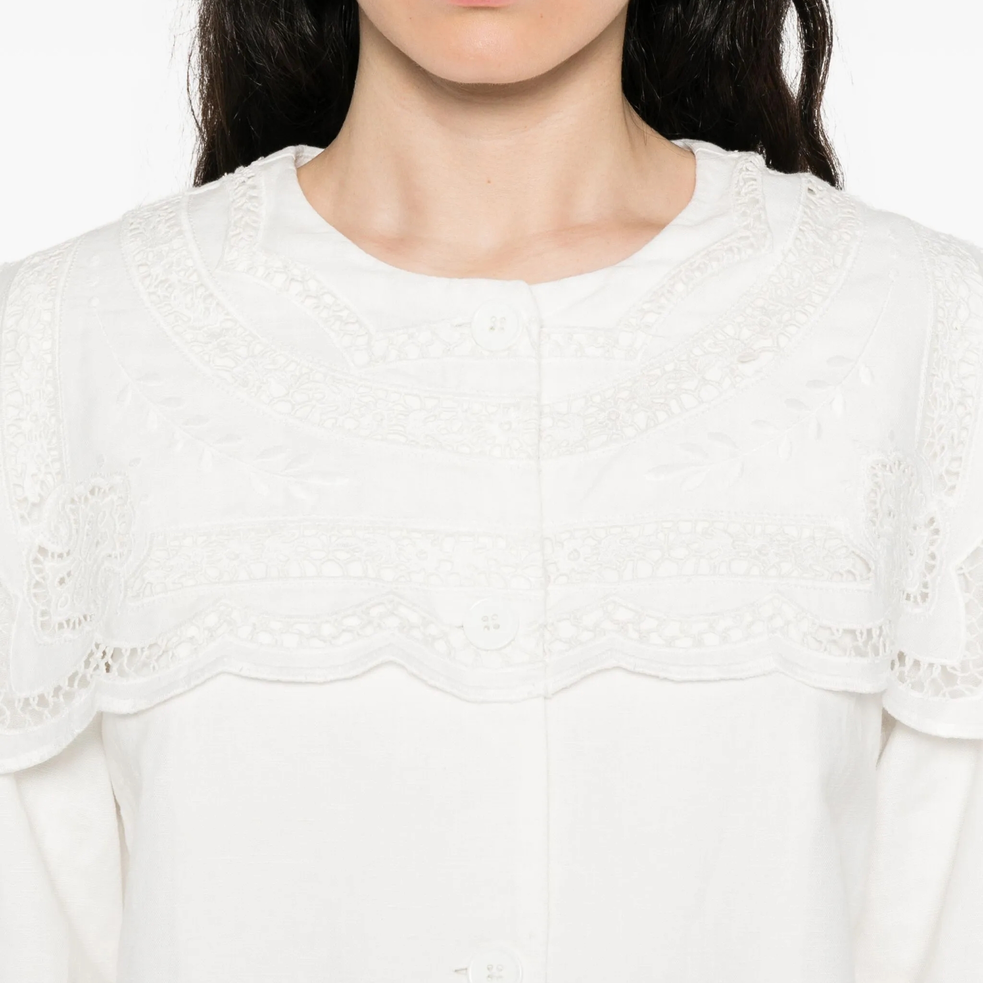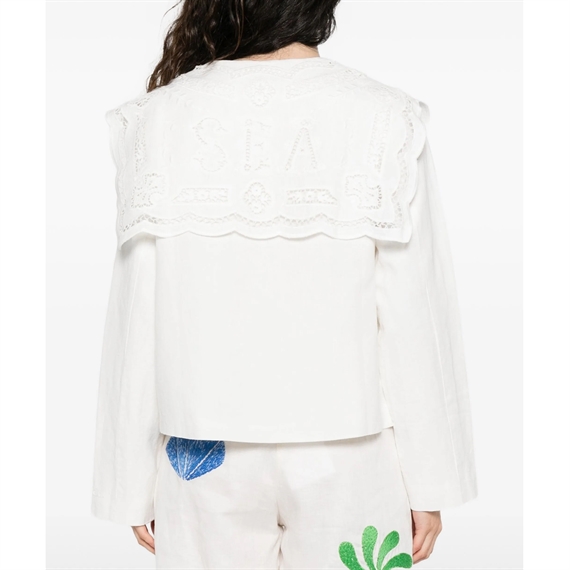 Marie-jakken fra Sea New York er en romantisk og sofistikeret jakke med gennemgående broderet anglaise-detaljer og et iøjnefaldende 'Sea'-logo broderet på brystet. Jakken har en smuk kappe med kontrastkant, der tilfører et elegant og legende udtryk. Den har en afslappet pasform og lukkes med knapper foran – perfekt som let overtøj til forår og sommer. En karakterfuld jakke, der kombinerer klassisk håndværk med moderne kant.