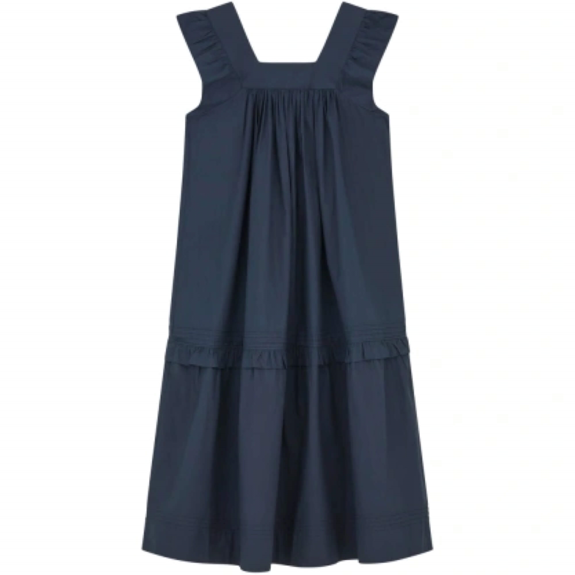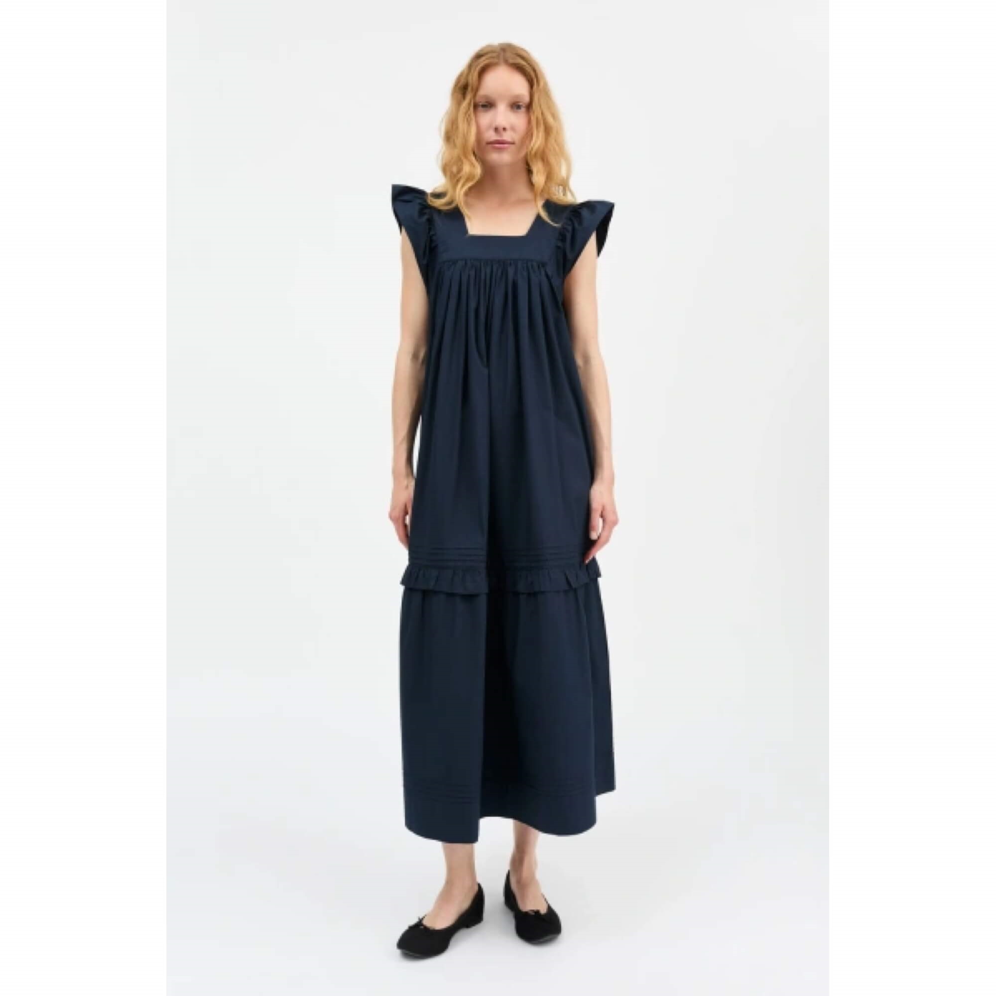 Denne smukke Alina kjole fra Skall Studio findes i en smuk dyb mørkeblå farve. Kjolen har en lige pasform og kantet udskæring ved halsen. De flæsede ærmer samt flæset kantbånd ved kjolens midte tilføjer et feminint udtryk!