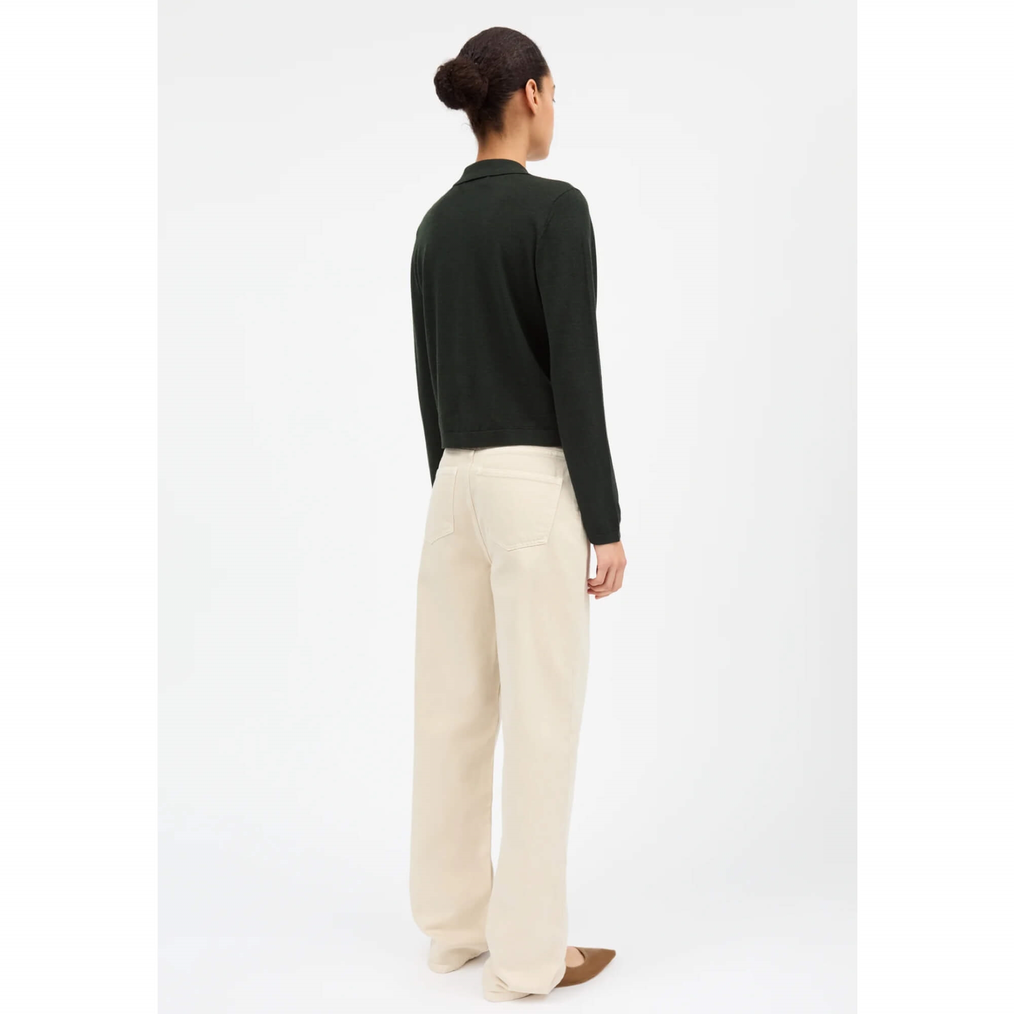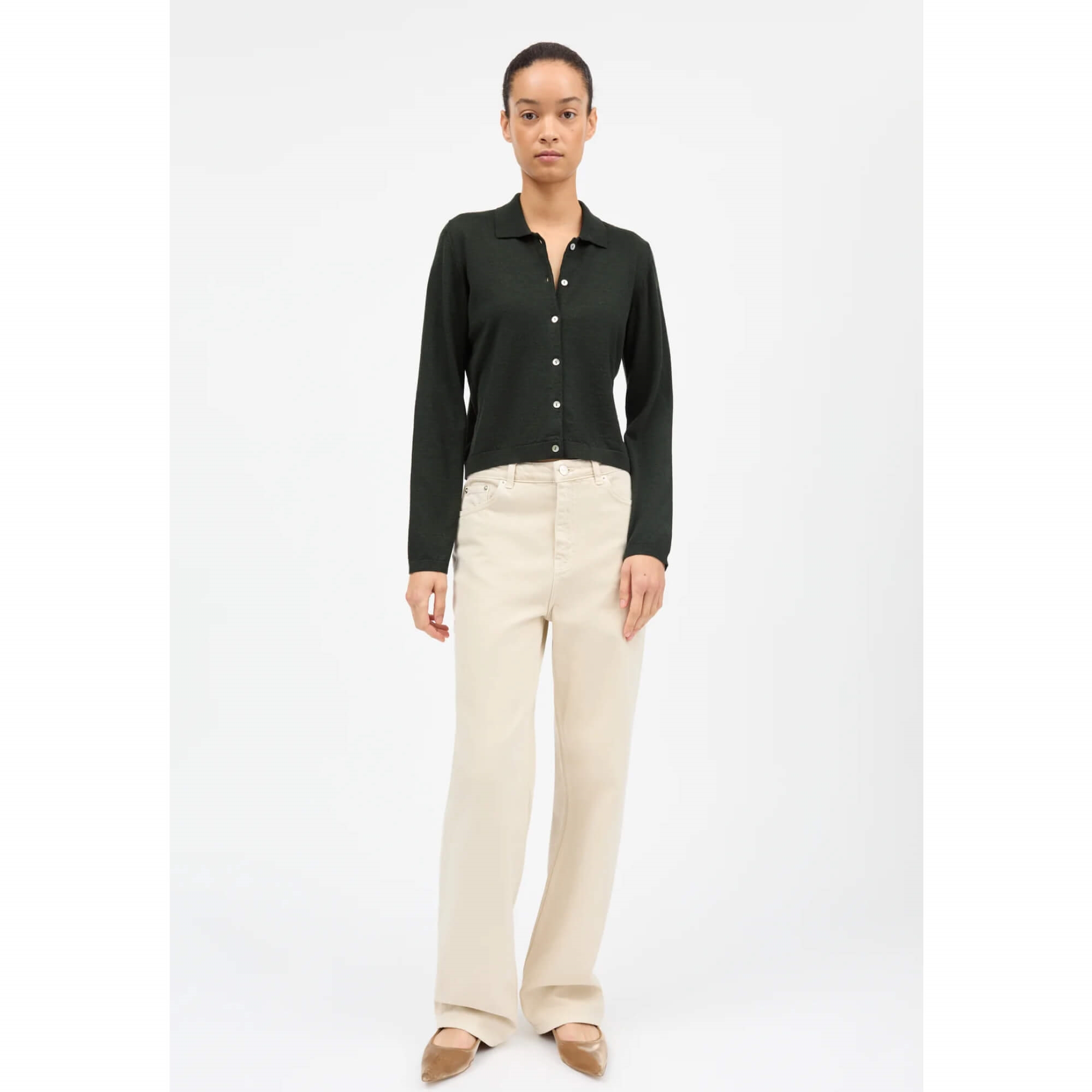 Amethyst Cardigan er en klassisk cardigan med polo-inspireret krave, strikket i let merinould. Den har let sænkede skuldre og lukkes foran med seks perlemorsknapper. Den perfekte cardigan til alle lejligheder i den lækre mørkegrønne farve.
