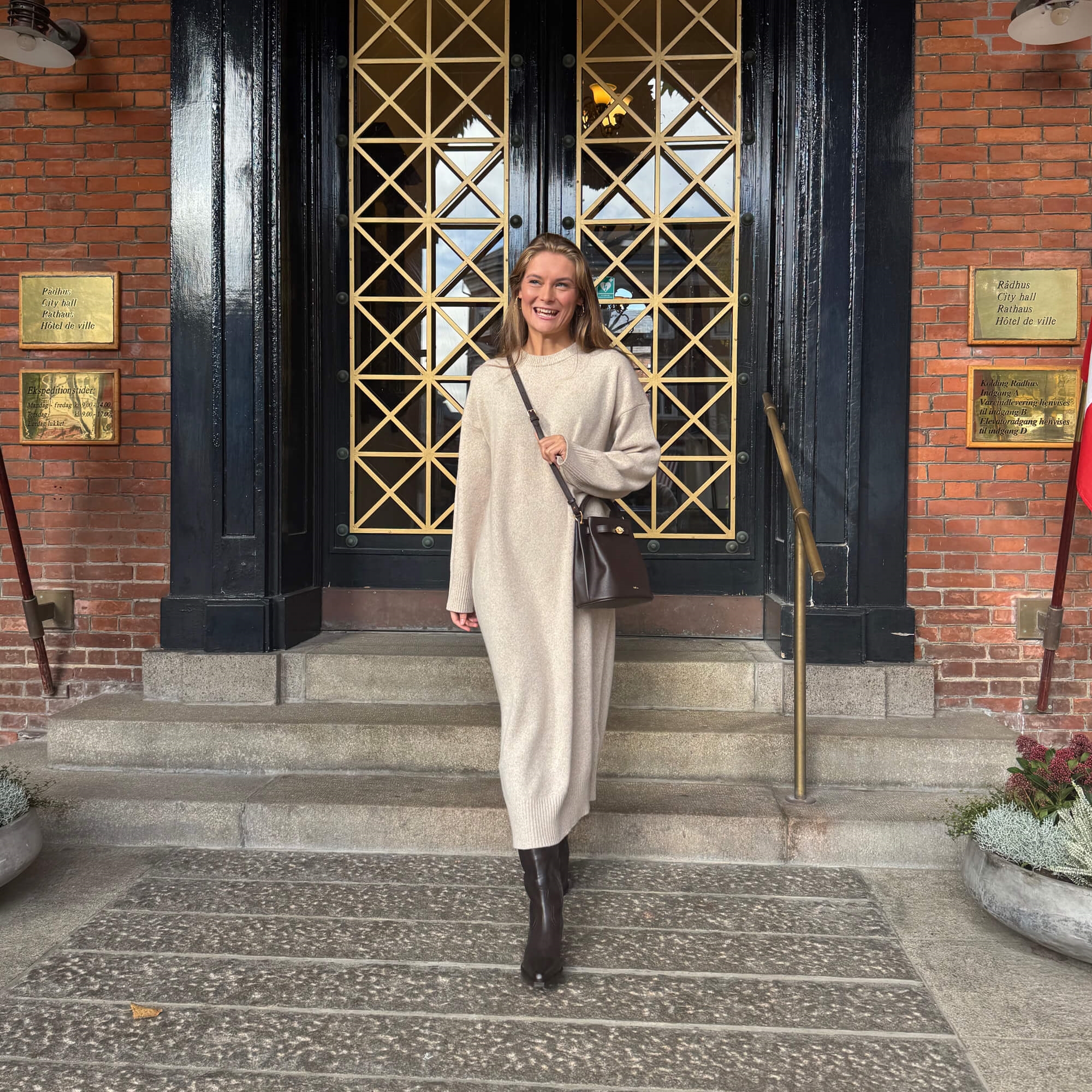 Andrea Dress fra Skall Studio er en tidløs strikkjole designet i en blød og lun uldblanding. Kjolen har et afslappet, oversized snit med sænkede skuldre, lange ærmer og brede ribkanter, som giver et casual, men elegant udtryk. Den lange silhuet med slidser i siderne gør kjolen både komfortabel og nem at style - perfekt til kølige dage, hvor du ønsker et enkelt, men sofistikeret look.