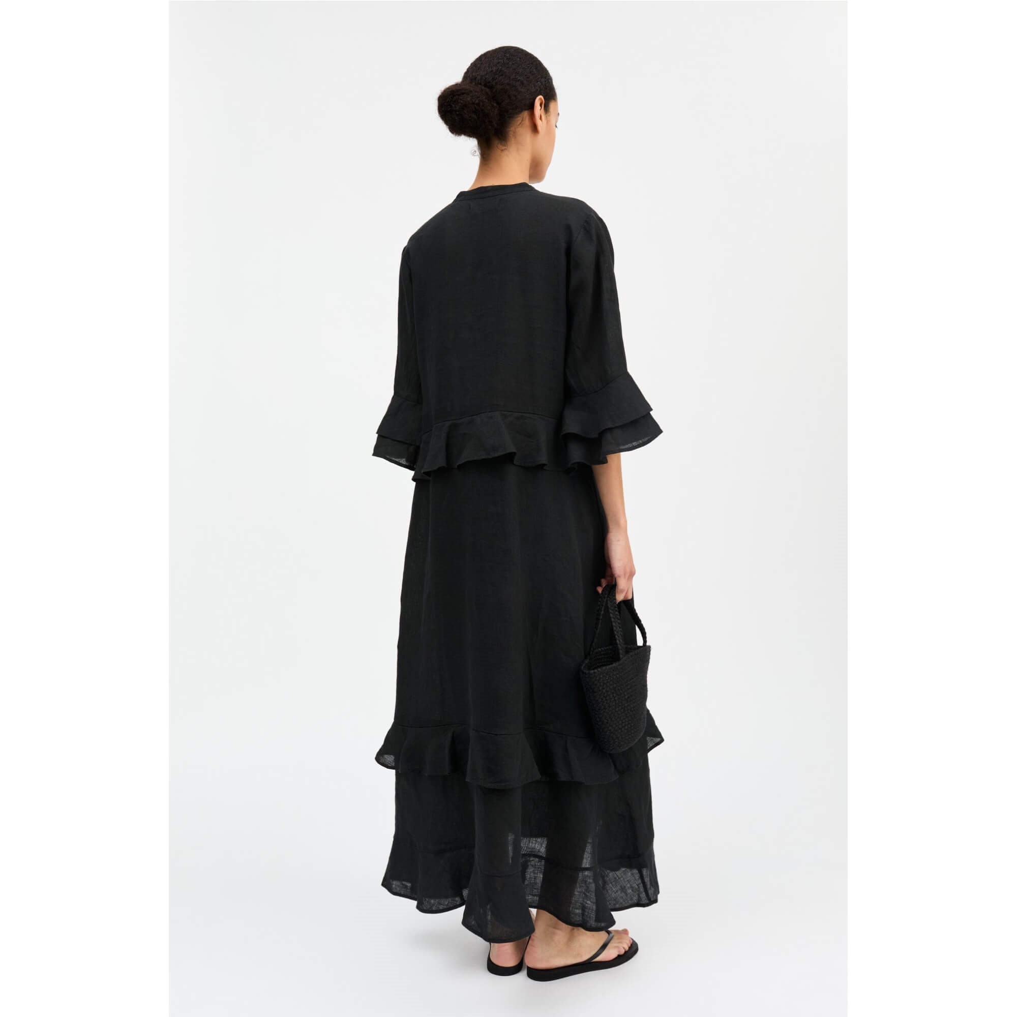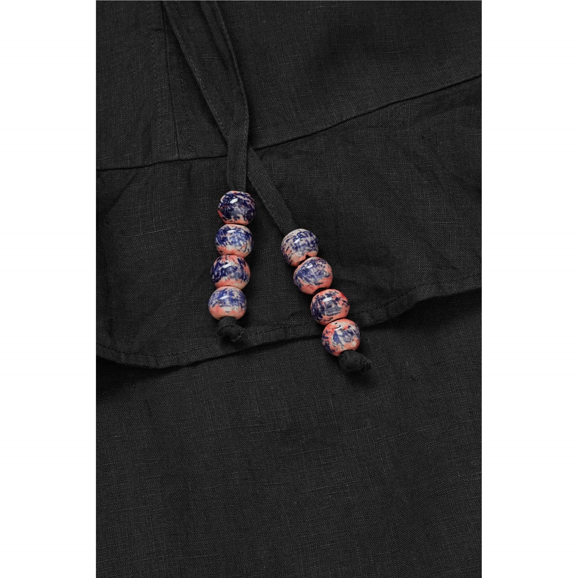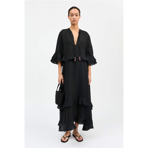 Den smukke lange Frigga kjole i 100% hør, har en let og luftig silhuet. Designet har en elegant standkrave og en frontåbning med bindebånd, afsluttet med dekorative keramiske perler, der tilfører et raffineret og håndlavet udtryk. Flæsedetaljer ved talje, ærmer og i den lagdelte bund skaber smuk bevægelse og et feminint fald. Kjolen er ideel til varme dage og kan styles med flade sandaler for et afslappet sommerlook eller med hæle og enkle smykker til mere festlige anledninger.