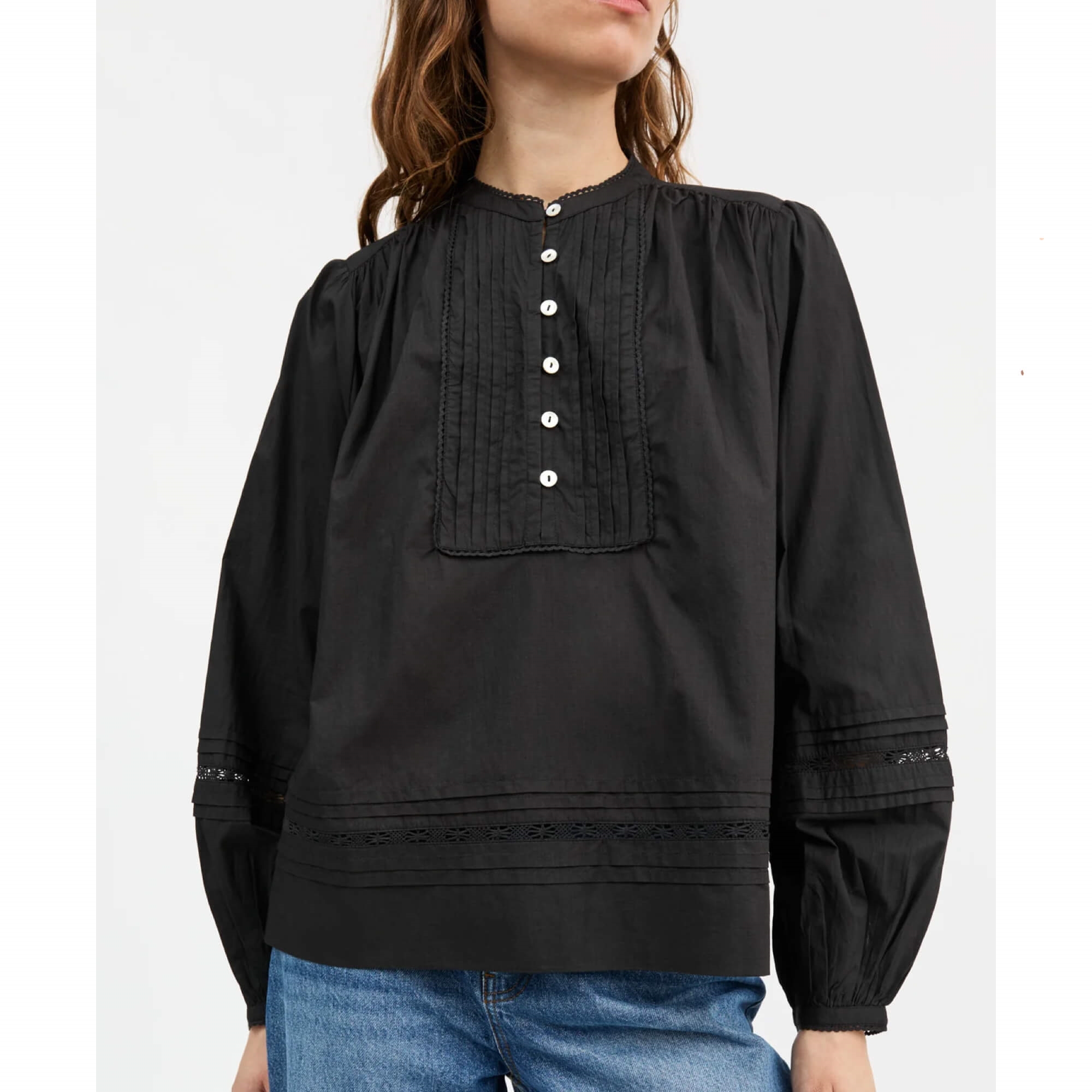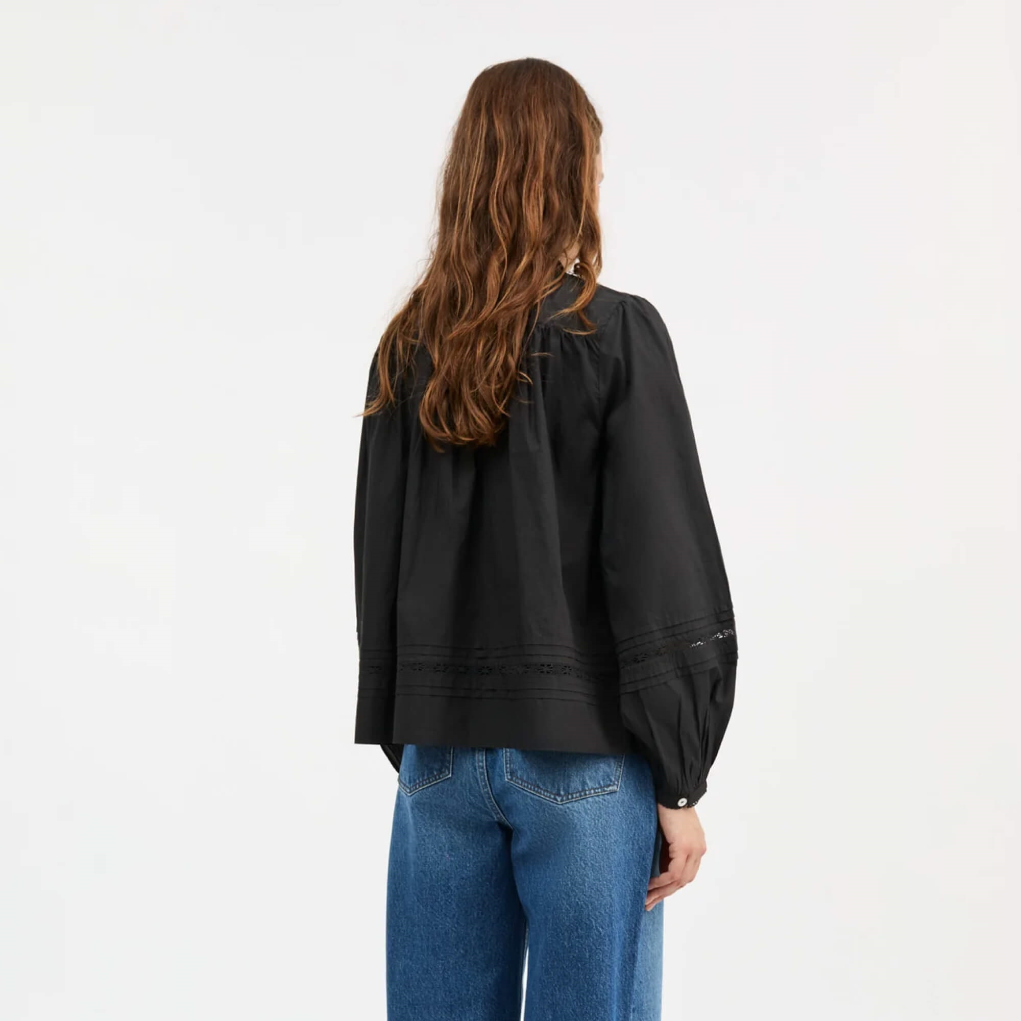 Leaf Shirt fra Skall Studio har en pintuck-detalje på brystet og blondeindsatser over kroppen og ærmerne, som tilføjer et feminint udtryk til denne skjorte i 100% økologisk bomuld. Der er læg ved skuldrene, og en blondekant løber rundt om kraven og ved manchetterne på de voluminøse ballonærmer. Blusen lukkes med seks knapper og løkker foran.