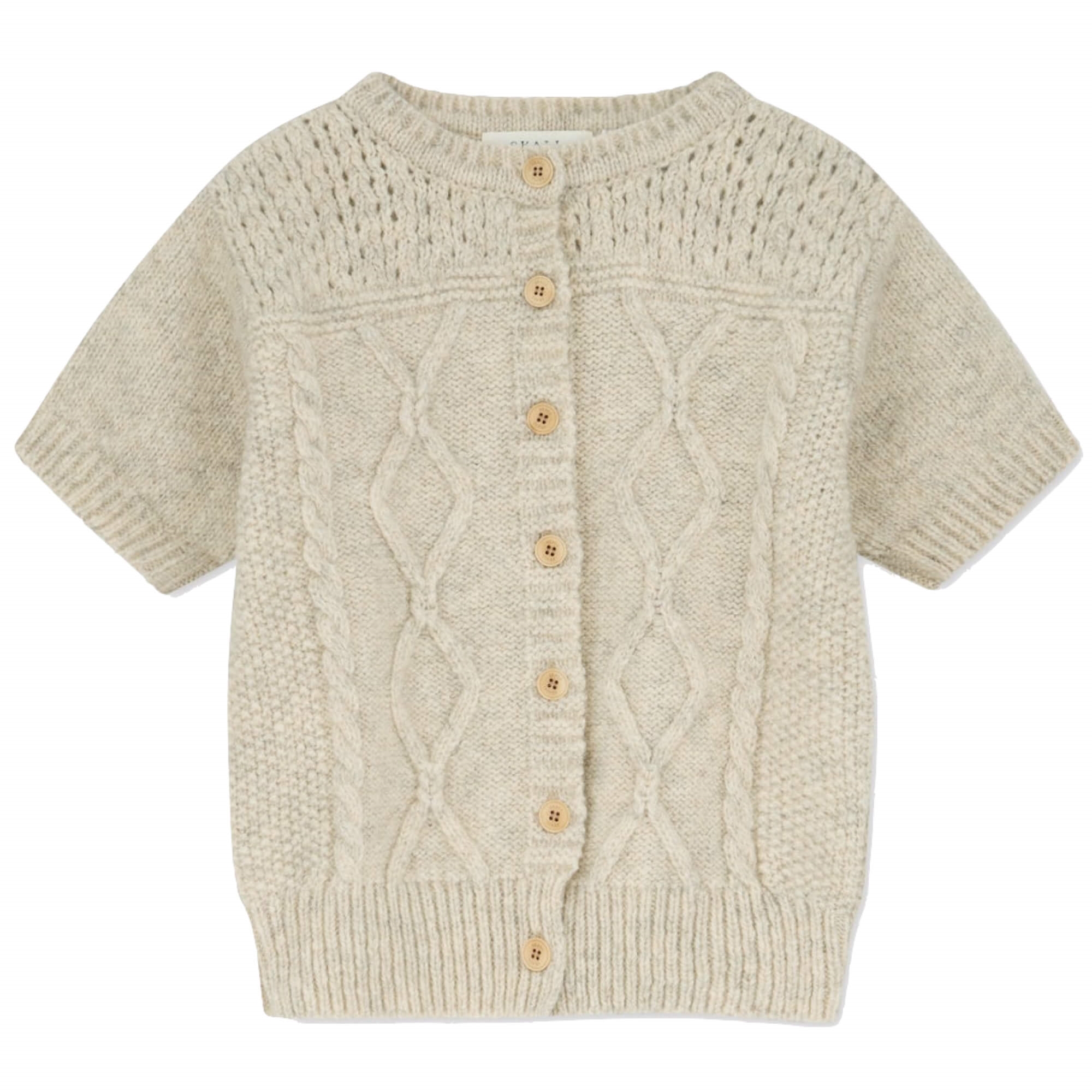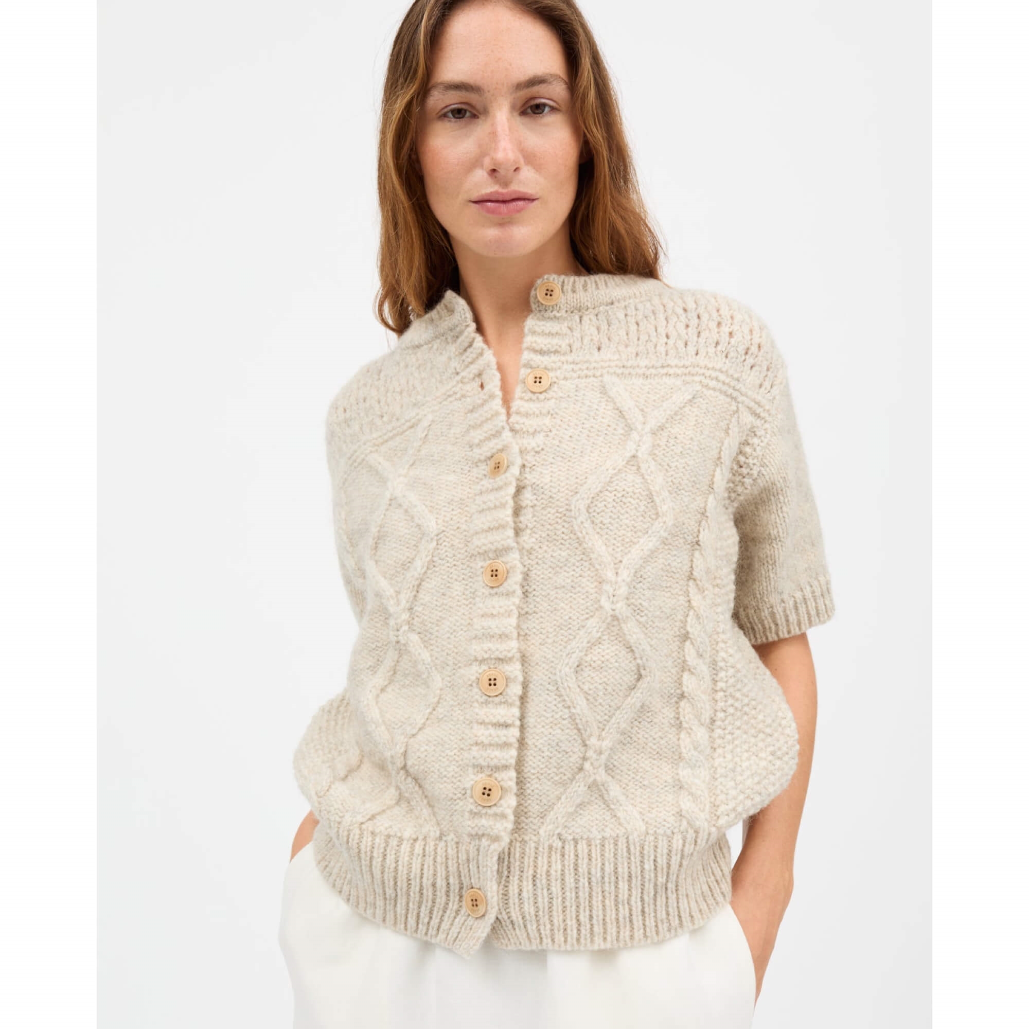 Den smukke Svea Cardigan i en elegant cream nuance. Cardiganen har korte ærmer og fine, strikkede detaljer, der giver et feminint og raffineret udtryk. Brug den alene på en lun forårsdag, eller style den med en langærmet bluse under for et lag-på-lag look.