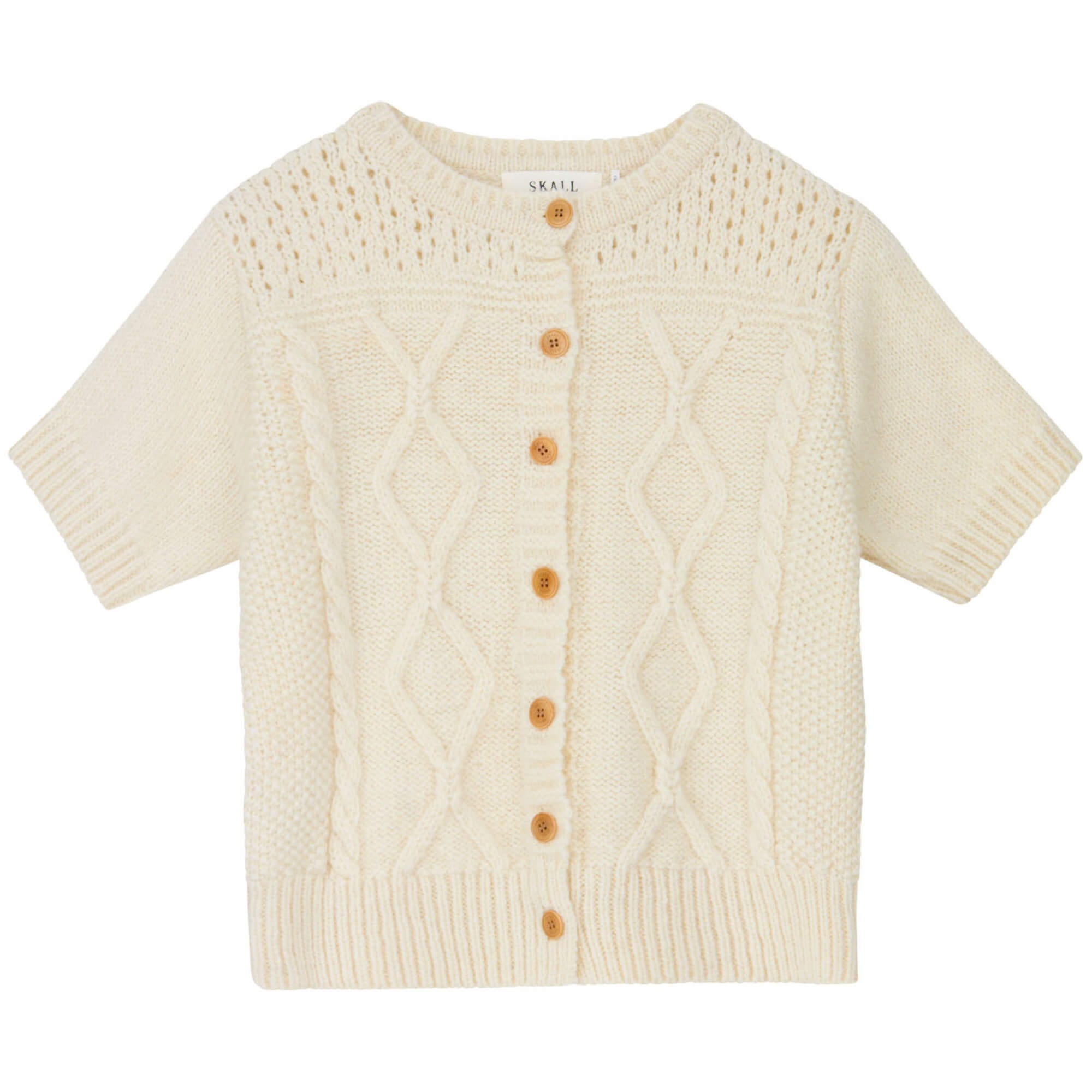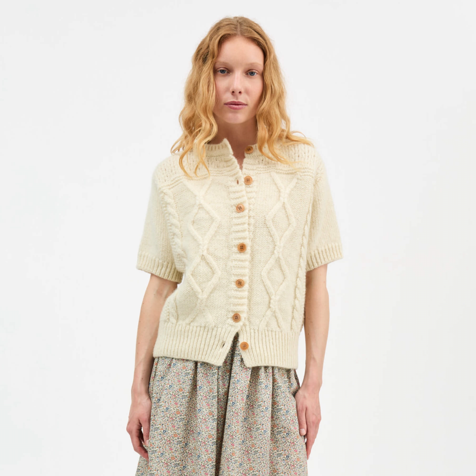 Den smukke Svea Cardigan i den fine Off white farve. Cardiganen kommer med korte ærmer og det flotteste strikkede detaljler. Brug den som den er på en lun forårsdag! Eller style med en langærmet bluse indenunder.