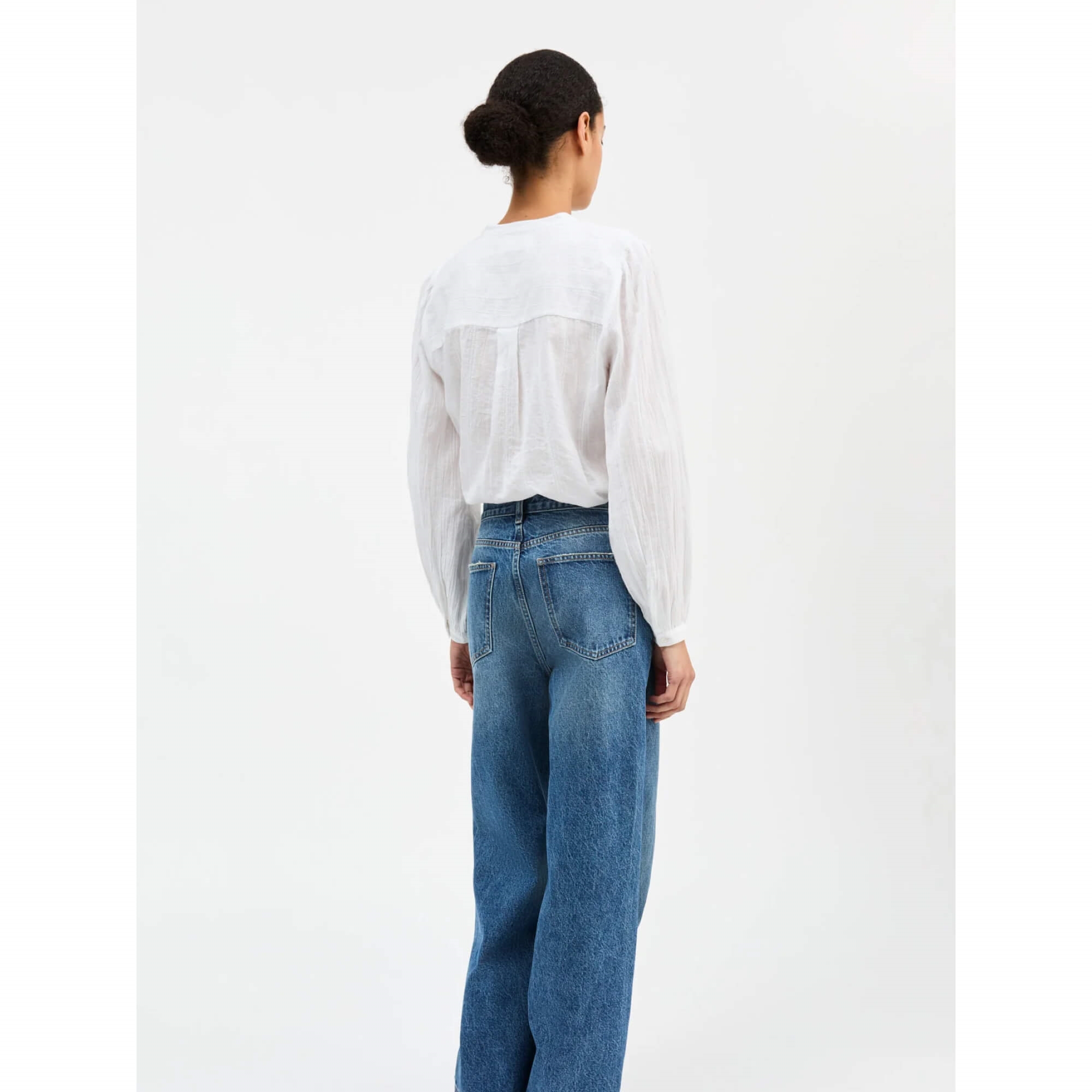 Denne skjorte kombinerer et enkelt, feminint udtryk med smukke, voluminøse detaljer. Den runde hals uden krave giver et let og afslappet look, mens knaplukningen hele vejen ned tilfører et klassisk touch. Lægget i ryggen skaber ekstra volumen og et flot fald, der giver skjorten bevægelse og komfort i hverdagen.