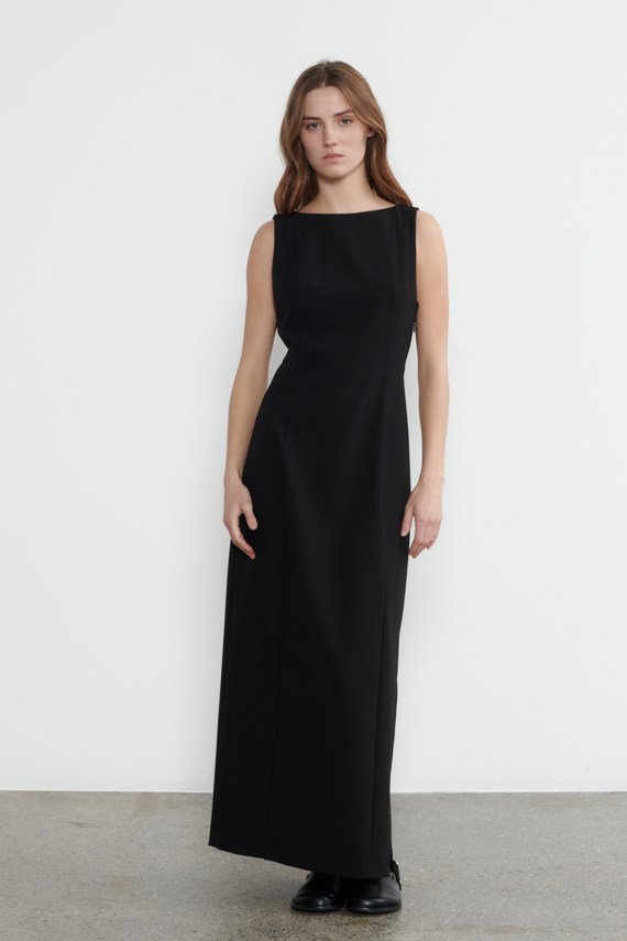 Vadana kjolen er en elegant, taljeret kjole, der fremhæver figuren med sin lange, strømlinede silhuet.