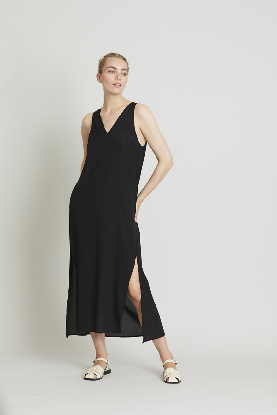 VARDA kjolen er en løstsiddende kjole, der kombinerer stil med komfort. Den ærmeløse design og dybe V-udskæring tilføjer et moderne og feminint udtryk til denne stilfulde kjole.