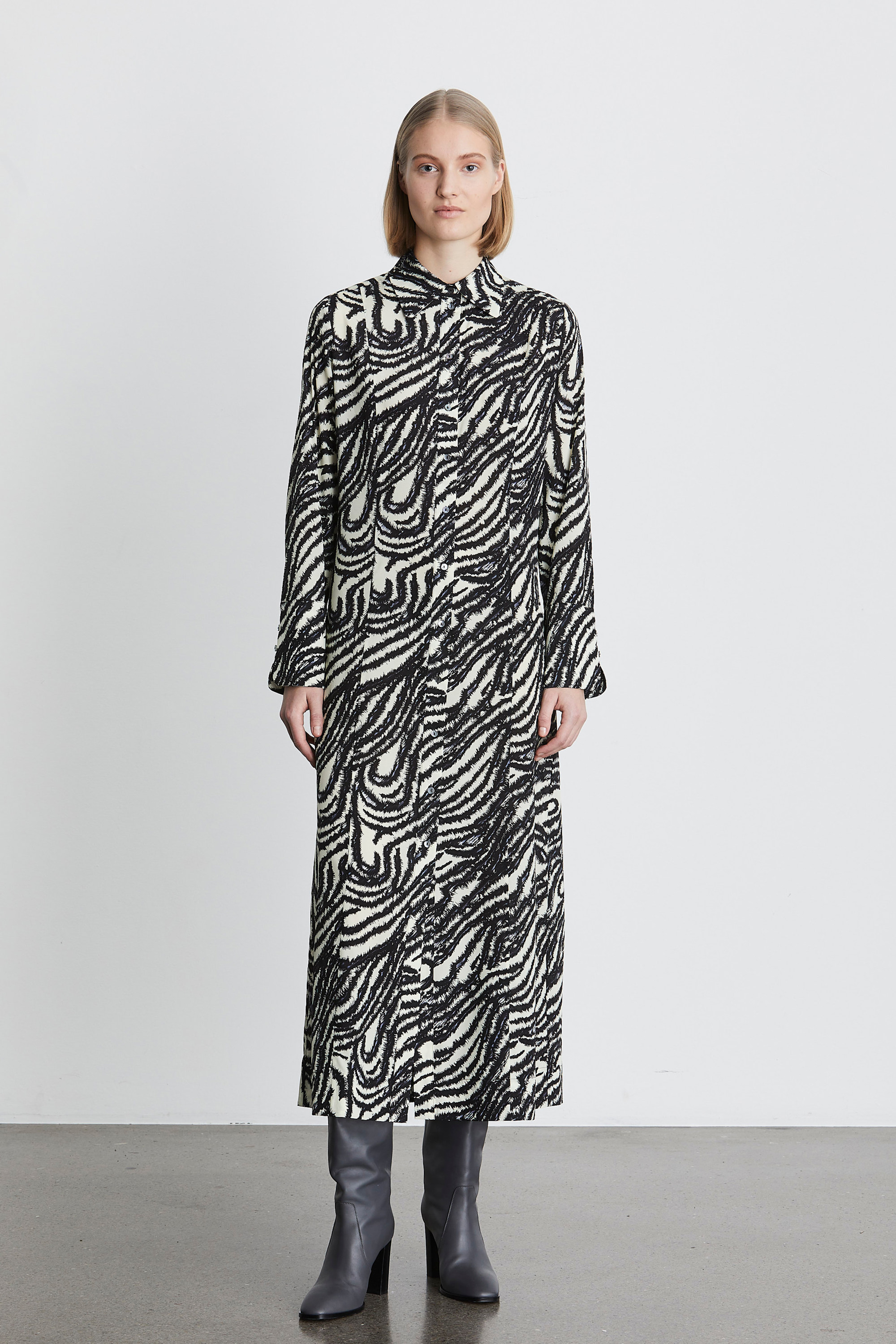 Vialo kjolen er en lang kjole med en tætsiddende pasform, der fremhæver en elegant silhuet. Den skjulte knaplukning og kraven med afrundede kravespidser tilføjer subtile detaljer, der gør denne kjole til et sofistikeret valg.
