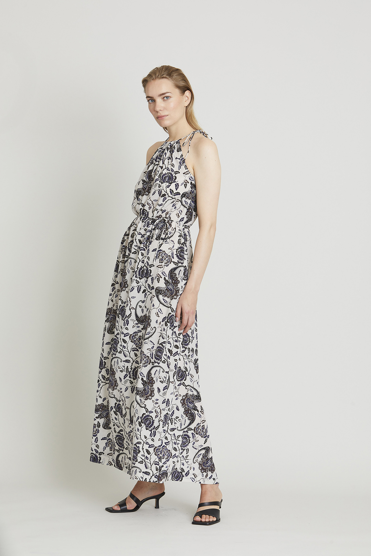 VINNI kjolen er en lang, løstsiddende halterneck kjole, der kombinerer elegance med komfort. Den har fine binde snor-detaljer, der tilføjer et subtilt og feminint touch til designet, samt en slidse foran, der giver bevægelsesfrihed og et dynamisk udtryk.