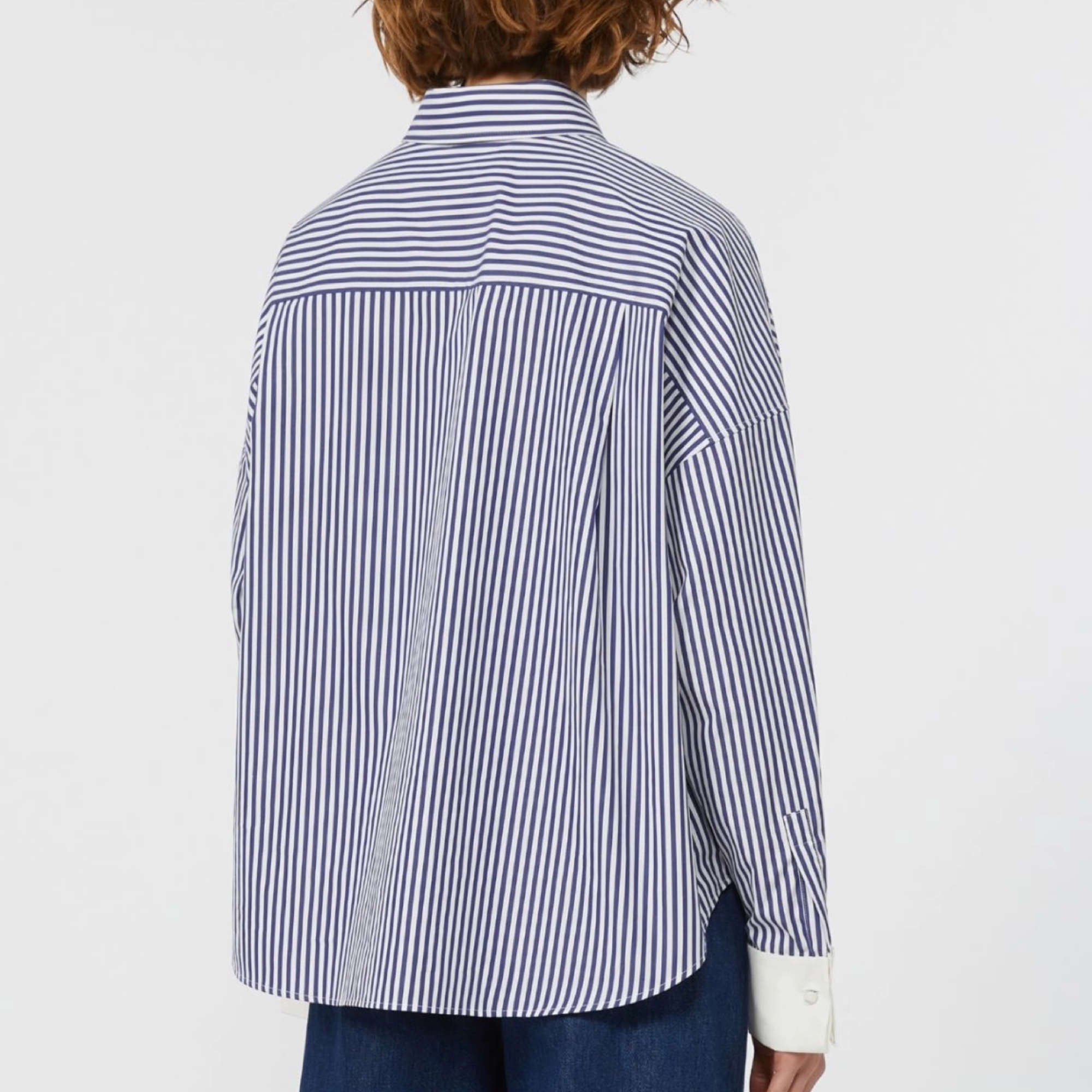 Arturo skjorten fra Max Mara er en oversize skjorte i bomuldspoplin med blå og hvide striber. Den har en kort boxy silhuet og afrundet kant, der er længere bagpå. Designet fuldendes med en klassisk skjortekrave, brede manchetter, brystlomme og et lille broderet sommerfuglelogo foran.