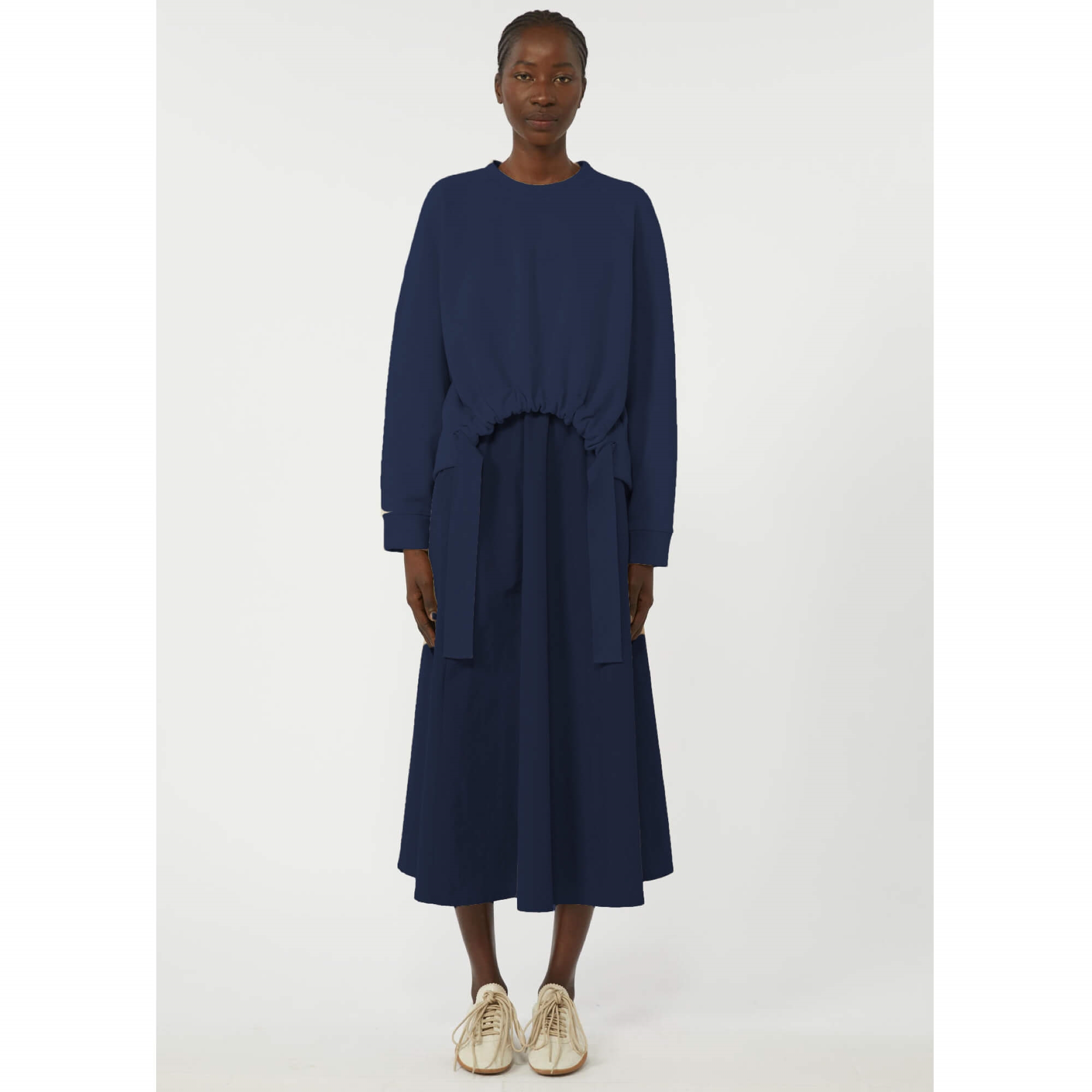 WKDDESTINO er en lang kjole med ærmeløs overdel i strækbomuld og kontrastskørt i vandafvisende canvas. Den lette navy kjole kombineres med en sweatshirt i børstet bomuldsjersey, som skaber et moderne lag-på-lag-udtryk. Delene kan anvendes hver for sig, men er designet til at blive stylet sammen, hvor sweatshirten bæres uden over kjolen for et afslappet og nutidigt look.